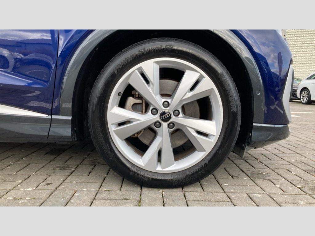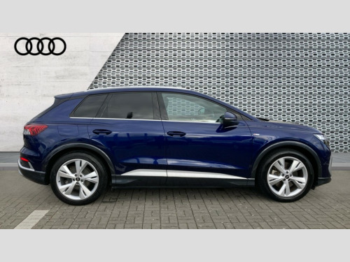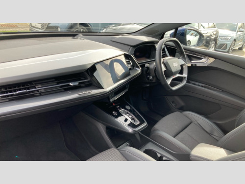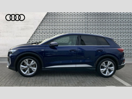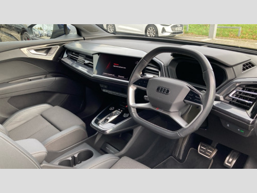 Audi Q4 150kW 40 82kWh S Line 5dr Auto Audi connect safety and service (e-call), Audi drive select, Audi Smartphone Interface with wireless functionality, Audi Virtual Cockpit - 10.25" display, Bluetooth interface, Camera based traffic sign recognition, Lane departure warning system, MMI Navigation Plus with high resolution 11.6 inch touchscreen colour display, Power operated tailgate, Progressive steering, Swerve assist and turn assist, 11KW onboard charger, 135kW DC charging capability, AC and DC charging access point positioned on the rear right, Compact e-tron charging system, Household plug type G (GB), Industry plug CEE 32 A/230 V/6 h/long + straight, Mode 3 AC charging cable 22 kW, Sports suspension with 15mm lower, 2 USB-C ports with charge and data functions, Audi sound system with 8 speakers, DAB Digital radio, 3rd brake light, Acoustic glass windscreen, Aluminium roof rails, Body coloured door mirrors, Contrast bumpers in Manhattan grey, Electrically adjustable/heated/folding/auto dimming door mirrors with integrated LED indications + kerb view function for passenger side, Frameless auto dimming interior rear view mirror, LED daytime running lights, Projection light in the exterior mirrors, e-tron logo projected from the underside of the exterior mirror onto the ground, Rear side wing doors, Rear wiper, S line badges on front wings, S line exterior styling, Side and rear window privacy glass, Single frame grille with a structured, closed surface within an octagonal shape, 3 seat bench in 2nd row, 3 zone automatic air conditioning, 4 way electric lumbar support for driver and front passenger, Accent surfaces in gloss black - centre console control panel, switch panel and trim on front doors in gloss black, Auxiliary air conditioning, Black cloth headlining, Comfort front centre armrest, Driver/passenger manual seat height adjustment, Front and rear head restraints, Front door sill trims with aluminium inlay, illuminated with S logo, Front/rear floor mats, Heated front seats, ISOFIX child seat mounting for front passenger and outer rear seats including top tether attachment point of outer rear seats, Single front passenger seat, Stainless steel pedals, Gloss styling pack - Q4 E-tron, Non smoking pack - Q4 E-tron, 3x3 point rear seatbelts, Active vehicle alerting system (AVAS), Driver and front passenger airbag with passenger airbag deactivation, Electric child locks, Front side airbags with head airbags and interaction airbag, Pre-sense front with pedestrian and cyclist detection, Seatbelt warning, Tyre pressure loss indicator, Warning triangle and first aid kit, Anti theft alarm, Anti-theft wheel bolts, Keyless Go, Aluminium look interior elements, Inlay in dark matt brushed aluminium, accent surfaces on instrument panel and centre console trim in chrome paint finish, slate grey, Tool kit