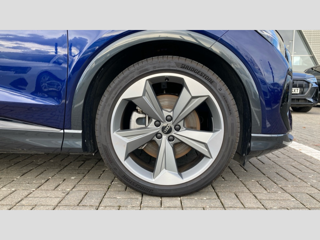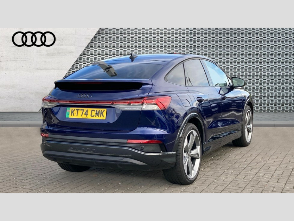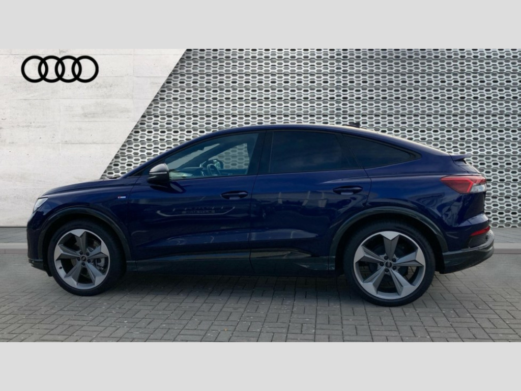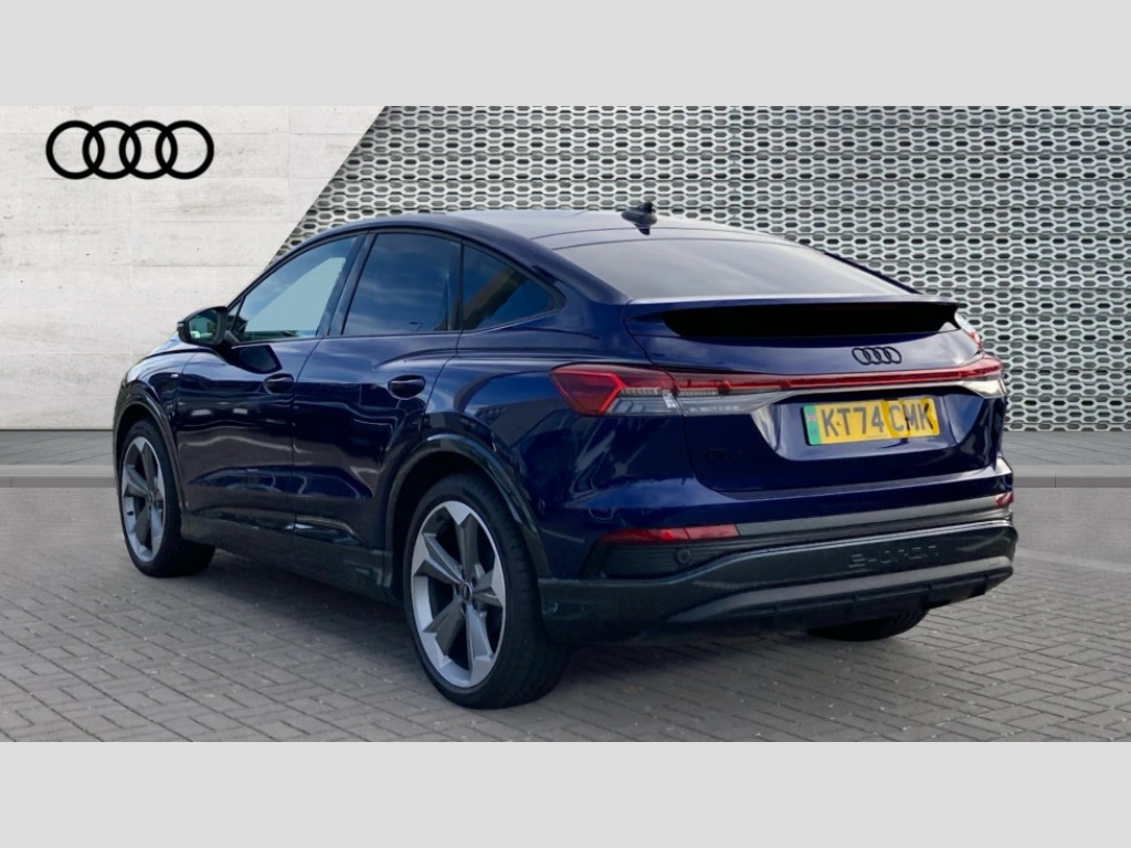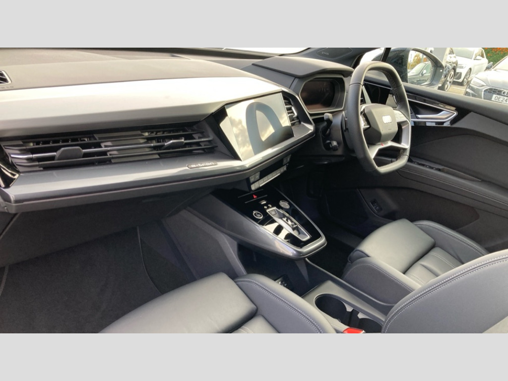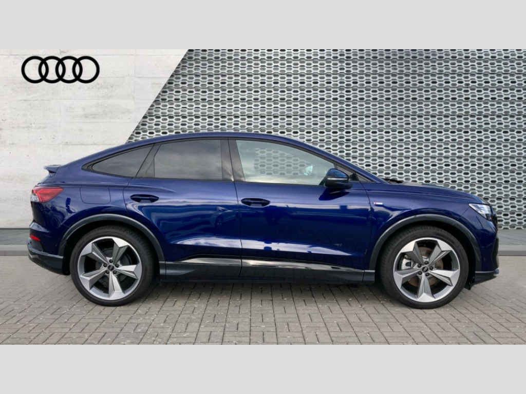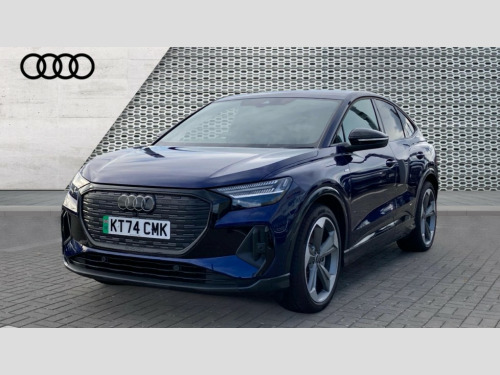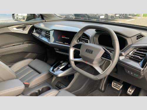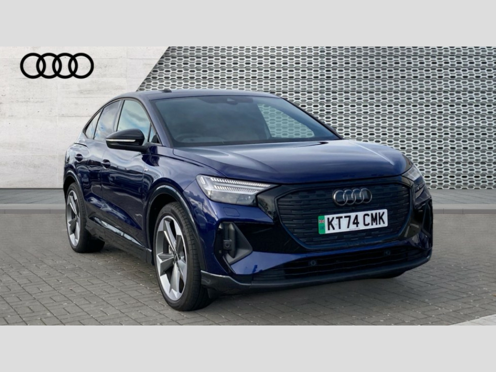 Audi Q4 210kW 45 82kWh Black Edition 5dr Auto Adaptive cruise control with speed limiter, Advanced driver attention and drowsiness monitor, Audi application store, Audi connect safety and service (e-call), Audi drive select, Audi smartphone interface, Audi Virtual Cockpit - 10.25" display, Bluetooth interface, Camera based traffic sign recognition, Lane departure warning including emergency assist, MMI Navigation Plus with high resolution 11.6 inch touchscreen colour display, Power operated tailgate with sensor controlled release, Progressive steering, Rear view camera, Swerve assist and turn assist, 11KW onboard charger, 175kW DC charging capability, AC and DC charging access point positioned on driver's side rear, Control unit with household plug and charging cable, Mode 2, Type 2 / G (10A), Mode 3 type 2 AC charging cable 22kW, Sport suspension, 2 USB-C ports with charge and data functions, Audi sound system with 8 loudspeakers incl. centre speaker, subwoofer and 6-channel amplifier with total output of 180 watts, DAB Digital radio, Audi rings and model badging in black (with powertrain designation removed), Contrast bumpers in Manhattan grey, Electrically adjustable/heated/folding/auto dimming door mirrors with integrated LED indications + kerb view function for passenger side, Frameless auto dimming interior rear view mirror, Heat insulating glass windscreen, Heated rear window, LED 3rd brake light, LED daytime running lights, LED Headlights, LED rear lights, Privacy glass - dark-tinted rear window, rear door windows and rear side windows, Projection light in the exterior mirrors, e-tron logo projected from the underside of the exterior mirror onto the ground, Rear side wing doors, Rear wiper, S Line badges on the front wings, S line exterior styling, Single frame grille with a structured, closed surface within an octagonal shape, 3 seat bench in 2nd row, 3 zone automatic air conditioning, 4 way electric lumbar support for driver and front passenger, 40/20/40 split folding rear seat bench, Accent surfaces in gloss black - centre console control panel, switch panel and trim on front doors in gloss black, Black carpets, Black cloth headlining, Comfort auxiliary air conditioning, Door armrests in leatherette, Flat top and bottomed twin-spoke leather multifunction sport steering wheel with shift paddles for recuperation, Front centre armrest, Front door sill trims with aluminium inlay, illuminated with S logo, Front sport seats with integrated head reastrains, Front/rear floor mats, Heated front seats, Manual seat adjustment for driver and front passenger seats, Pedals in stainless steel, Rear centre armrest with cupholders, Rear head restraints, Single front passenger seat, Ambient lighting plus pack - Q4 E-tron, Black styling pack plus - Q4 E-tron, Non smoking pack - Q4 E-tron, 3x3 point rear seatbelts, Acoustic vehicle alerting system, Convenience key with safelock, Driver and front passenger airbag with passenger airbag deactivation, Electric child locks, First aid kit with warning triangle and vests, Front side airbags with head airbag system and front interaction airbag, i - Size child seat mounting on the front passenger side and i - Size and top tether on the outer rear seats, Pre-sense front with pedestrian and cyclist detection, Rear seat occupant reminder for child presence detection, Seat belt monitoring, Tyre pressure loss indicator, Anti theft alarm, Anti-theft wheel bolts, Keyless Go, Aluminium look interior elements, Black dashboard, 21" 5 arm rotor evo Audi Sport alloy wheels in matt grey, gloss turned finish and tyre seal technology, Vehicle tool kit