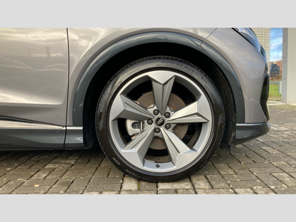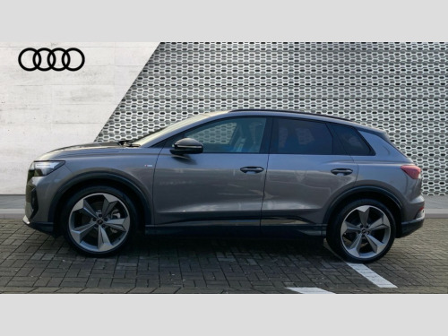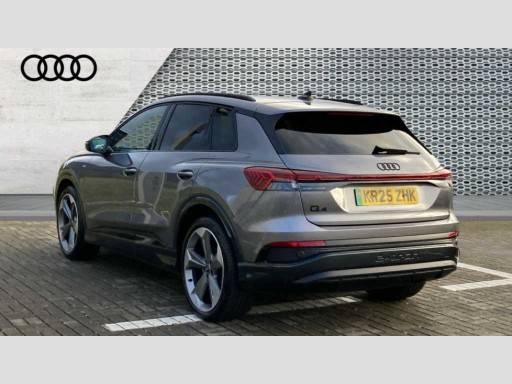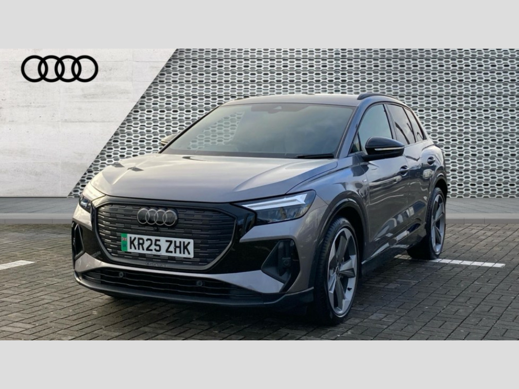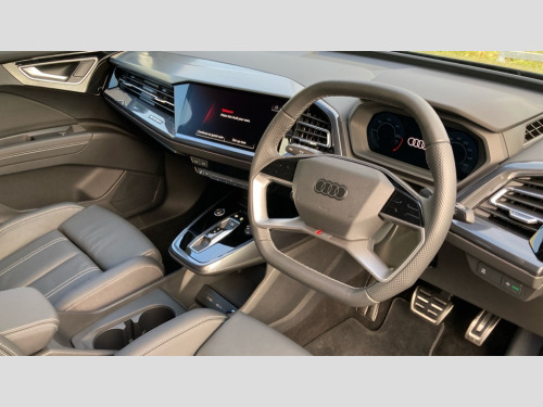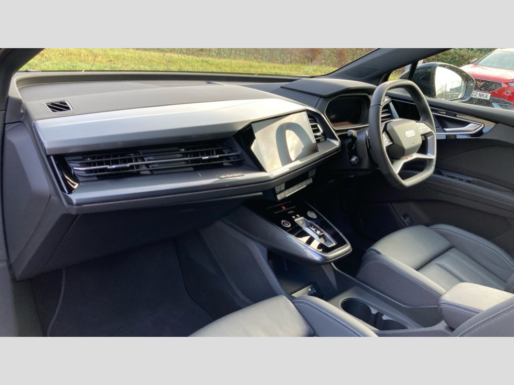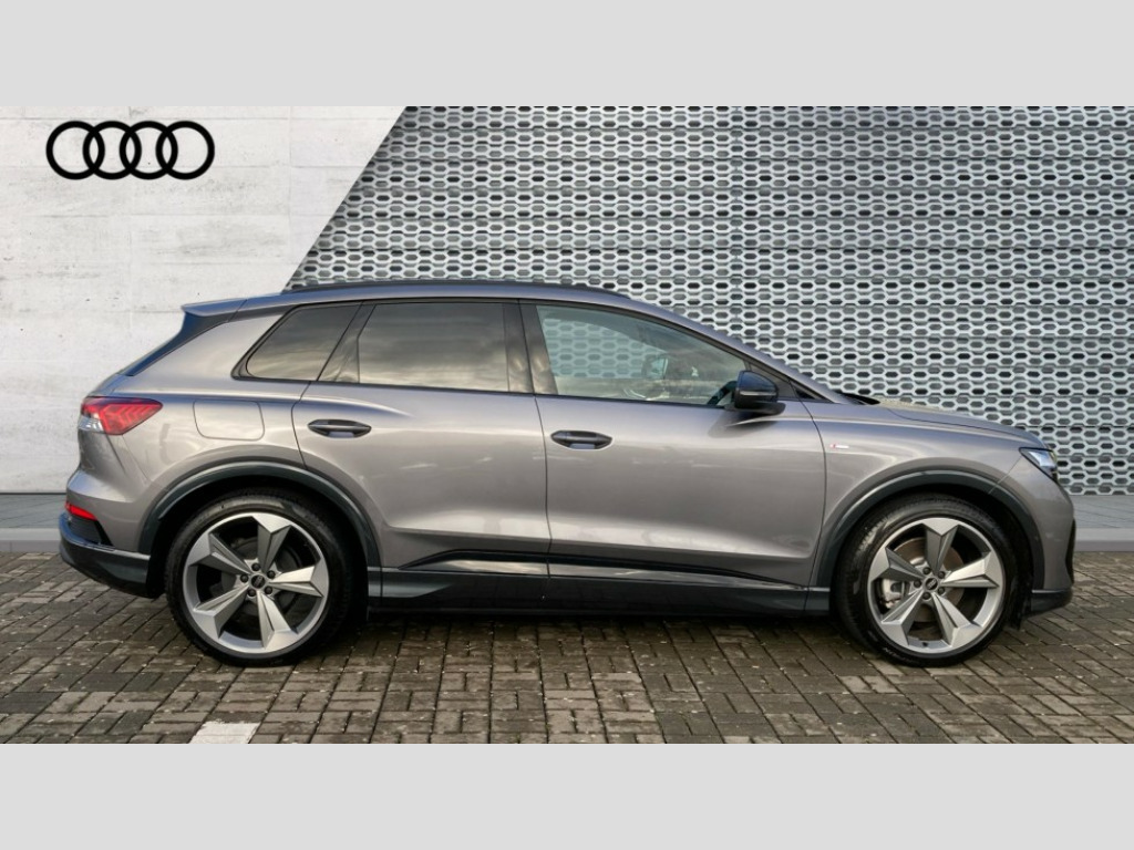 Audi Q4 210kW 45 82kWh Black Edition 5dr Auto Adaptive cruise control with speed limiter, Advanced driver attention and drowsiness monitor, Audi application store, Audi connect safety and service (e-call), Audi drive select, Audi side assist with exit warning and rear cross traffic assist, Audi smartphone interface, Audi Virtual Cockpit - 10.25" display, Bluetooth interface, Camera based traffic sign recognition, Lane departure warning including emergency assist, MMI Navigation Plus with high resolution 11.6 inch touchscreen colour display, Power operated tailgate with sensor controlled release, Progressive steering, Rear view camera, Swerve assist and turn assist, 11KW onboard charger, 175kW DC charging capability, AC and DC charging access point positioned on driver's side rear, Control unit with household plug and charging cable, Mode 2, Type 2 / G (10A), Mode 3 type 2 AC charging cable 22kW, Sport suspension, 2 USB-C ports with charge and data functions, Audi sound system with 8 loudspeakers incl. centre speaker, subwoofer and 6-channel amplifier with total output of 180 watts, DAB Digital radio, Audi rings and model badging in black (with powertrain designation removed), Black roof rails, Contrast bumpers in Manhattan grey, Electrically adjustable/heated/folding/auto dimming door mirrors with integrated LED indications + kerb view function for passenger side, Frameless auto dimming interior rear view mirror, Heat insulating glass windscreen, Heated rear window, LED 3rd brake light, LED daytime running lights, LED Headlights, LED rear lights, Privacy glass - dark-tinted rear window, rear door windows and rear side windows, Projection light in the exterior mirrors, e-tron logo projected from the underside of the exterior mirror onto the ground, Rear side wing doors, Rear wiper, S Line badges on the front wings, S line exterior styling, Single frame grille with a structured, closed surface within an octagonal shape, 3 seat bench in 2nd row, 3 zone automatic air conditioning, 4 way electric lumbar support for driver and front passenger, 40/20/40 split folding rear seat bench, Accent surfaces in gloss black - centre console control panel, switch panel and trim on front doors in gloss black, Black carpets, Black cloth headlining, Comfort auxiliary air conditioning, Door armrests in leatherette, Flat top and bottomed twin-spoke leather multifunction sport steering wheel with shift paddles for recuperation, Front centre armrest, Front door sill trims with aluminium inlay, illuminated with S logo, Front sport seats with integrated head restraints, Front/rear floor mats, Heated front seats, Pedals in stainless steel, Rear centre armrest with cupholders, Rear head restraints, Single front passenger seat, Ambient lighting plus pack - Q4 E-tron, Black styling pack plus - Q4 E-tron, Non smoking pack - Q4 E-tron, 3x3 point rear seatbelts, Acoustic vehicle alerting system, Audi pre sense basic and rear, Convenience key with safelock, Driver and front passenger airbag with passenger airbag deactivation, Electric child locks, First aid kit with warning triangle and vests, Front side airbags with head airbag system and front interaction airbag, i - Size child seat mounting on the front passenger side and i - Size and top tether on the outer rear seats, Pre-sense front with pedestrian and cyclist detection, Rear seat occupant reminder for child presence detection, Seat belt monitoring, Tyre pressure loss indicator, Anti theft alarm, Anti-theft wheel bolts, Keyless Go, Aluminium look interior elements, Black dashboard, 21" 5 arm rotor evo Audi Sport alloy wheels in matt grey, gloss turned finish and tyre seal technology, Vehicle tool kit