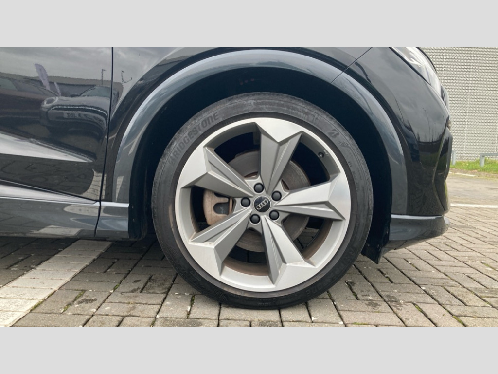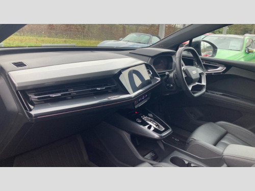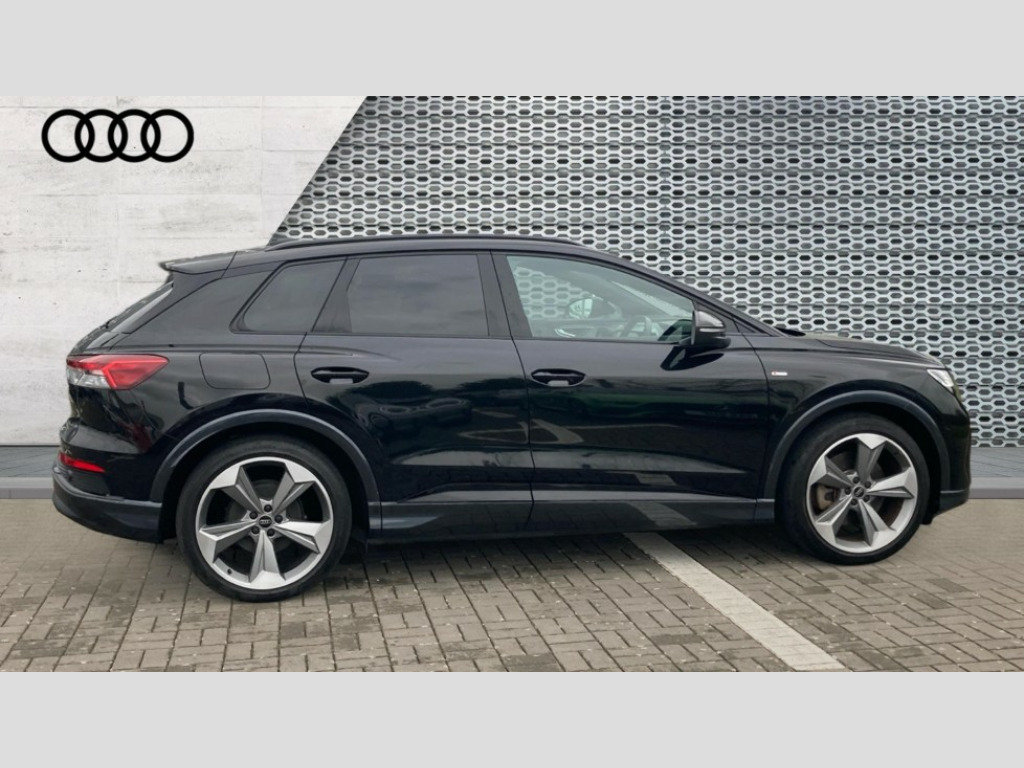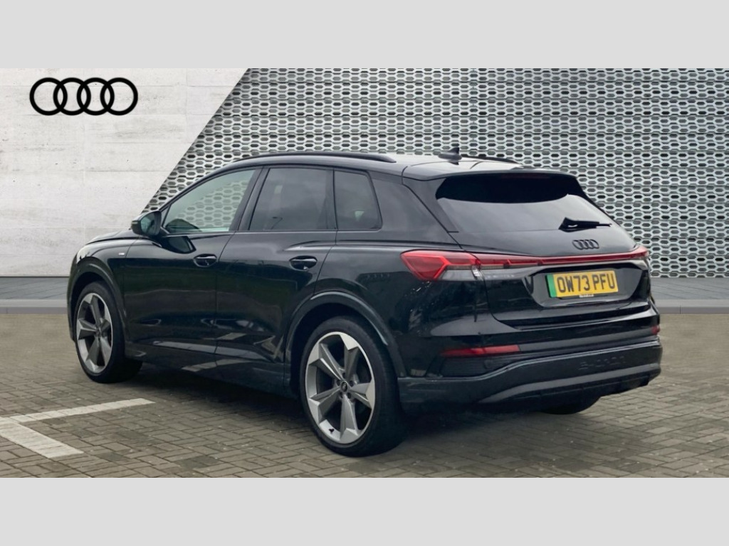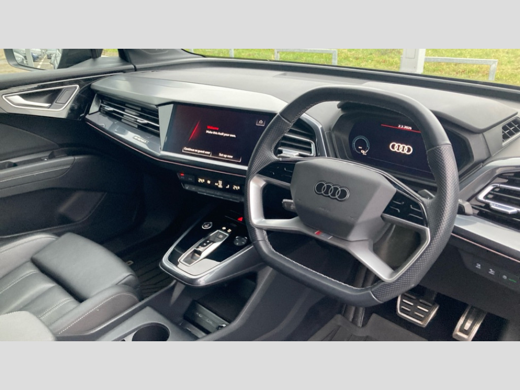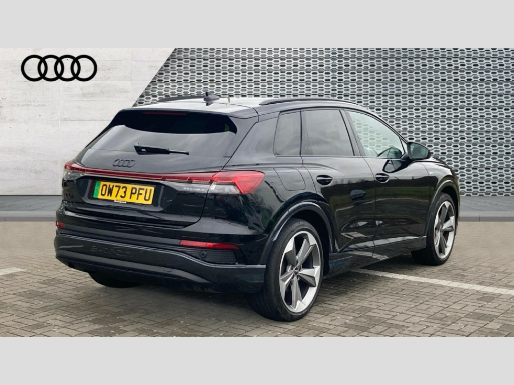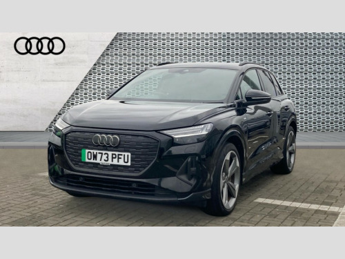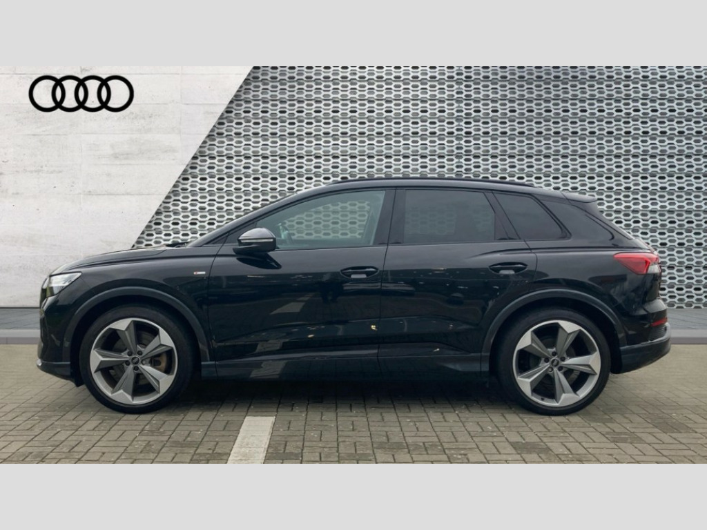 Audi Q4 210kW 45 82kWh Black Edition 5dr Auto Adaptive cruise control with speed limiter, Advanced driver attention and drowsiness monitor, Audi connect safety and service (e-call), Audi drive select, Audi smartphone interface, Audi Virtual Cockpit - 10.25" display, Bluetooth interface, Camera based traffic sign recognition, Lane departure warning including emergency assist, MMI Navigation Plus with high resolution 11.6 inch touchscreen colour display, Power operated tailgate with sensor controlled release, Progressive steering, Rear view camera, Swerve assist and turn assist, 11KW onboard charger, 175kW DC charging capability, AC and DC charging access point positioned on driver's side rear, Control unit with household plug and charging cable, Mode 2, Type 2 / G (10A), Mode 3 type 2 AC charging cable 22kW, Sport suspension, 2 USB-C ports with charge and data functions, Audi sound system with 8 loudspeakers incl. centre speaker, subwoofer and 6-channel amplifier with total output of 180 watts, DAB Digital radio, Audi rings and model badging in black (with powertrain designation removed), Black roof rails, Contrast bumpers in Manhattan grey, Door mirror housings in black, Electrically adjustable/heated/folding/auto dimming door mirrors with integrated LED indications + kerb view function for passenger side, Frameless auto dimming interior rear view mirror, Heat insulating glass windscreen, Heated rear window, LED 3rd brake light, LED daytime running lights, LED Headlights, LED rear lights, Privacy glass - dark-tinted rear window, rear door windows and rear side windows, Projection light in the exterior mirrors, e-tron logo projected from the underside of the exterior mirror onto the ground, Rear side wing doors, Rear wiper, S Line badges on the front wings, S line exterior styling, Single frame grille with a structured, closed surface within an octagonal shape, 3 seat bench in 2nd row, 3 zone automatic air conditioning, 4 way electric lumbar support for driver and front passenger, 40/20/40 split folding rear seat bench, Accent surfaces in gloss black - centre console control panel, switch panel and trim on front doors in gloss black, Black cloth headlining, Comfort auxiliary air conditioning, Door armrests in leatherette, Flat top and bottomed twin-spoke leather multifunction sport steering wheel with shift paddles for recuperation, Front centre armrest, Front door sill trims with aluminium inlay, illuminated with S logo, Front sport seats with integrated head restraints, Front/rear floor mats, Heated front seats, Manual seat adjustment for driver and front passenger seats, Pedals in stainless steel, Rear centre armrest with cupholders, Rear head restraints, Single front passenger seat, Ambient lighting plus pack - Q4 E-tron, Black styling pack plus - Q4 E-tron, Non smoking pack - Q4 E-tron, 3x3 point rear seatbelts, Acoustic vehicle alerting system, Convenience key with safelock, Driver and front passenger airbag with passenger airbag deactivation, Electric child locks, First aid kit with warning triangle and vests, Front side airbags with head airbag system and front interaction airbag, i - Size child seat mounting on the front passenger side and i - Size and top tether on the outer rear seats, Pre-sense front with pedestrian and cyclist detection, Rear seat occupant reminder for child presence detection, Seat belt monitoring, Tyre pressure loss indicator, Anti theft alarm, Anti-theft wheel bolts, Keyless Go, Aluminium look interior elements, 21" 5 arm rotor evo Audi Sport alloy wheels in matt grey, gloss turned finish and tyre seal technology, Vehicle tool kit