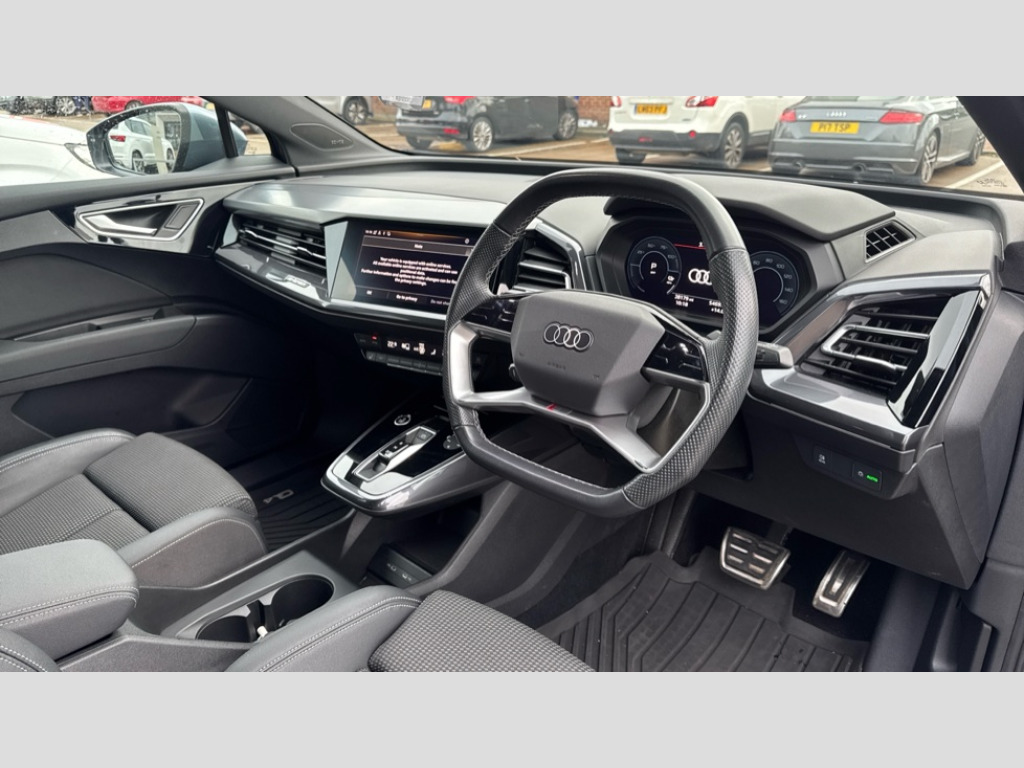 Audi Q4 220kW 50 Quattro 82kWh S Line 5dr Auto Audi connect safety and service (e-call), Audi drive select, Audi Smartphone Interface with wireless functionality, Audi Virtual Cockpit - 10.25" display, Bluetooth interface, Camera based traffic sign recognition, Lane departure warning system, MMI Navigation Plus with high resolution 10.1 inch touchscreen colour display, Power operated tailgate, Progressive steering, Swerve assist and turn assist, 11KW onboard charger, 125kW DC charging capability, AC and DC charging access point positioned on the rear right, Compact e-tron charging system, Household plug type G (GB), Industry plug CEE 32 A/230 V/6 h/long + straight, Mode 3 AC charging cable 22 kW, 2 USB-C ports with charge and data functions, Audi sound system with 8 speakers, DAB Digital radio, Acoustic glass windscreen, Aluminium roof rails, Body coloured door mirrors, Contrast bumpers in Manhattan grey, Driver's door mirror memory, Electrically adjustable/heated/folding/auto dimming door mirrors with integrated LED indications + kerb view function for passenger side, Frameless auto dimming interior rear view mirror, LED daytime running lights, Projection light in the exterior mirrors, e-tron logo projected from the underside of the exterior mirror onto the ground, S line badges on front wings, S line exterior styling, Side and rear window privacy glass, Single frame grille with a structured, closed surface within an octagonal shape, 3 zone automatic air conditioning, 4 way electric lumbar support for driver and front passenger, 40:60 Split folding rear seat or folded fully, Accent surfaces in gloss black - centre console control panel, switch panel and trim on front doors in gloss black, Auxiliary air conditioning, Black cloth headlining, Comfort front centre armrest, Driver/passenger manual seat height adjustment, Front and rear head restraints, Front door sill trims with aluminium inlay, illuminated with S logo, Front/rear floor mats, Heated front seats, Stainless steel pedals, Gloss styling pack - Q4 E-tron, Non smoking pack - Q4 E-tron, 3x3 point rear seatbelts, Active vehicle alerting system (AVAS), Driver and front passenger airbag with passenger airbag deactivation, Electric child locks, Front side airbags with head airbags and interaction airbag, Pre-sense front with pedestrian and cyclist detection, Seatbelt warning, Tyre pressure loss indicator, Warning triangle and first aid kit, Anti theft alarm, Anti-theft wheel bolts, Keyless Go, Aluminium look interior elements, Inlay in dark matt brushed aluminium, accent surfaces on instrument panel and centre console trim in chrome paint finish, slate grey, Tool kit, Tyre repair kit