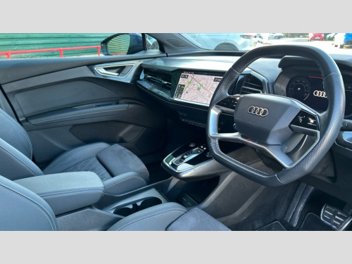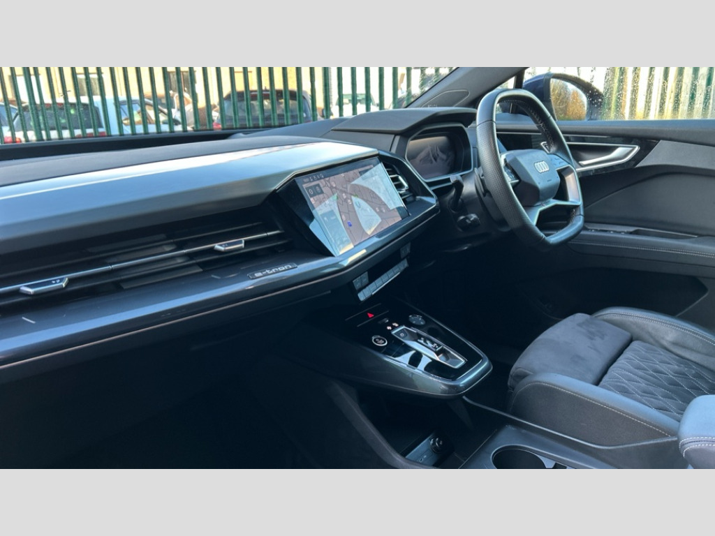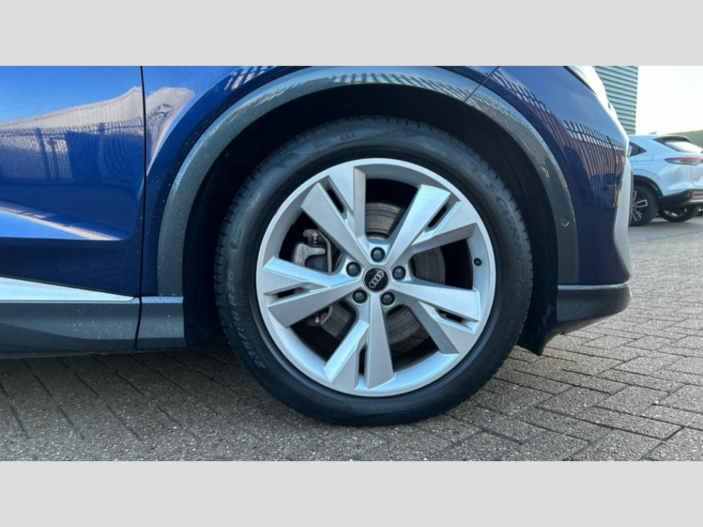Audi Q4 220kW 50 Quattro 82kWh S Line 5dr Auto Audi connect safety and service (e-call), Audi drive select, Audi Smartphone Interface with wireless functionality, Audi Virtual Cockpit - 10.25" display, Bluetooth interface, Camera based traffic sign recognition, Lane departure warning system, MMI Navigation Plus with high resolution 11.6 inch touchscreen colour display, Power operated tailgate, Progressive steering, Swerve assist and turn assist, 11KW onboard charger, 135kW DC charging capability, AC and DC charging access point positioned on the rear right, Compact e-tron charging system, Household plug type G (GB), Industry plug CEE 32 A/230 V/6 h/long + straight, Mode 3 AC charging cable 22 kW, 2 USB-C ports with charge and data functions, Audi sound system with 8 speakers, DAB Digital radio, 3rd brake light, Acoustic glass windscreen, Body coloured door mirrors, Contrast bumpers in Manhattan grey, Electrically adjustable/heated/folding/auto dimming door mirrors with integrated LED indications + kerb view function for passenger side, Frameless auto dimming interior rear view mirror, LED daytime running lights, Projection light in the exterior mirrors, e-tron logo projected from the underside of the exterior mirror onto the ground, Rear side wing doors, Rear wiper, S line badges on front wings, S line exterior styling, Side and rear window privacy glass, Single frame grille with a structured, closed surface within an octagonal shape, 3 seat bench in 2nd row, 3 zone automatic air conditioning, 4 way electric lumbar support for driver and front passenger, Accent surfaces in gloss black - centre console control panel, switch panel and trim on front doors in gloss black, Auxiliary air conditioning, Black cloth headlining, Comfort front centre armrest, Driver/passenger manual seat height adjustment, Front and rear head restraints, Front door sill trims with aluminium inlay, illuminated with S logo, Front/rear floor mats, Heated front seats, ISOFIX child seat mounting for front passenger and outer rear seats including top tether attachment point of outer rear seats, Single front passenger seat, Stainless steel pedals, Gloss styling pack - Q4 E-tron, Non smoking pack - Q4 E-tron, 3x3 point rear seatbelts, Active vehicle alerting system (AVAS), Driver and front passenger airbag with passenger airbag deactivation, Electric child locks, Front side airbags with head airbags and interaction airbag, Pre-sense front with pedestrian and cyclist detection, Seatbelt warning, Tyre pressure loss indicator, Warning triangle and first aid kit, Anti theft alarm, Anti-theft wheel bolts, Keyless Go, Aluminium look interior elements, Inlay in dark matt brushed aluminium, accent surfaces on instrument panel and centre console trim in chrome paint finish, slate grey, Tool kit