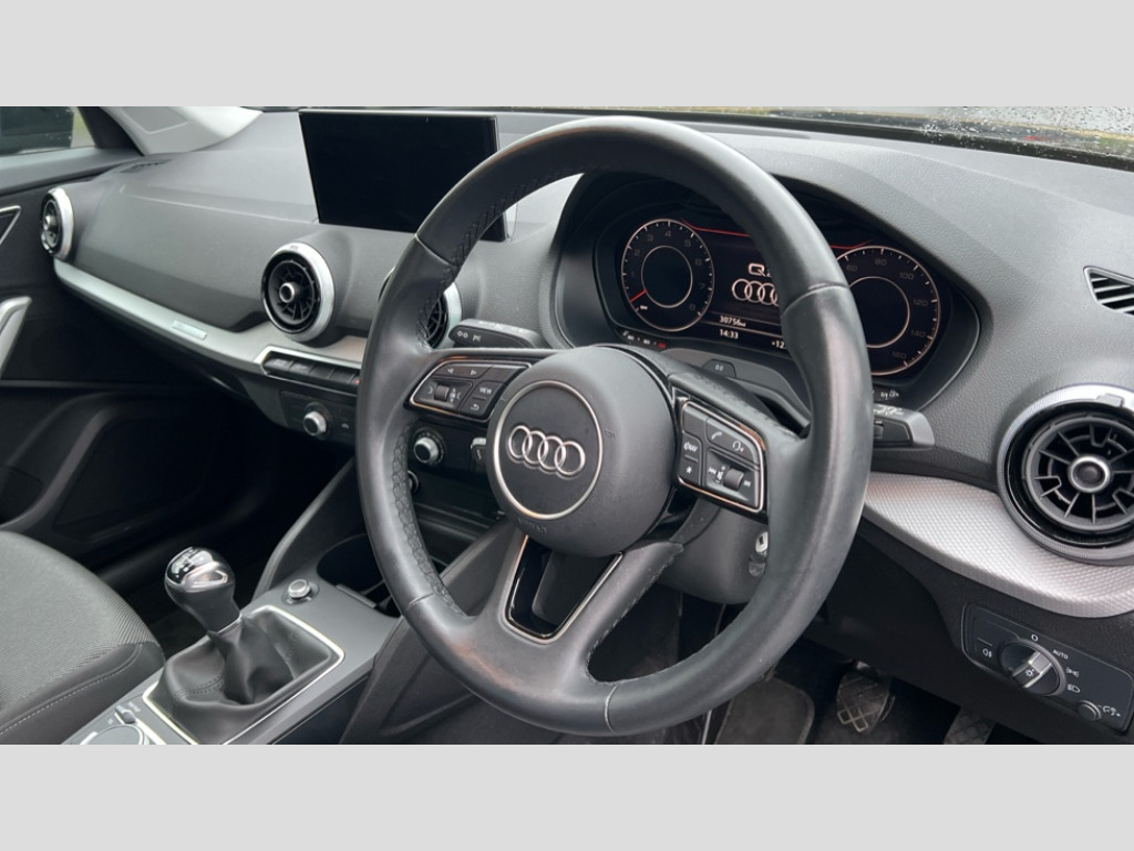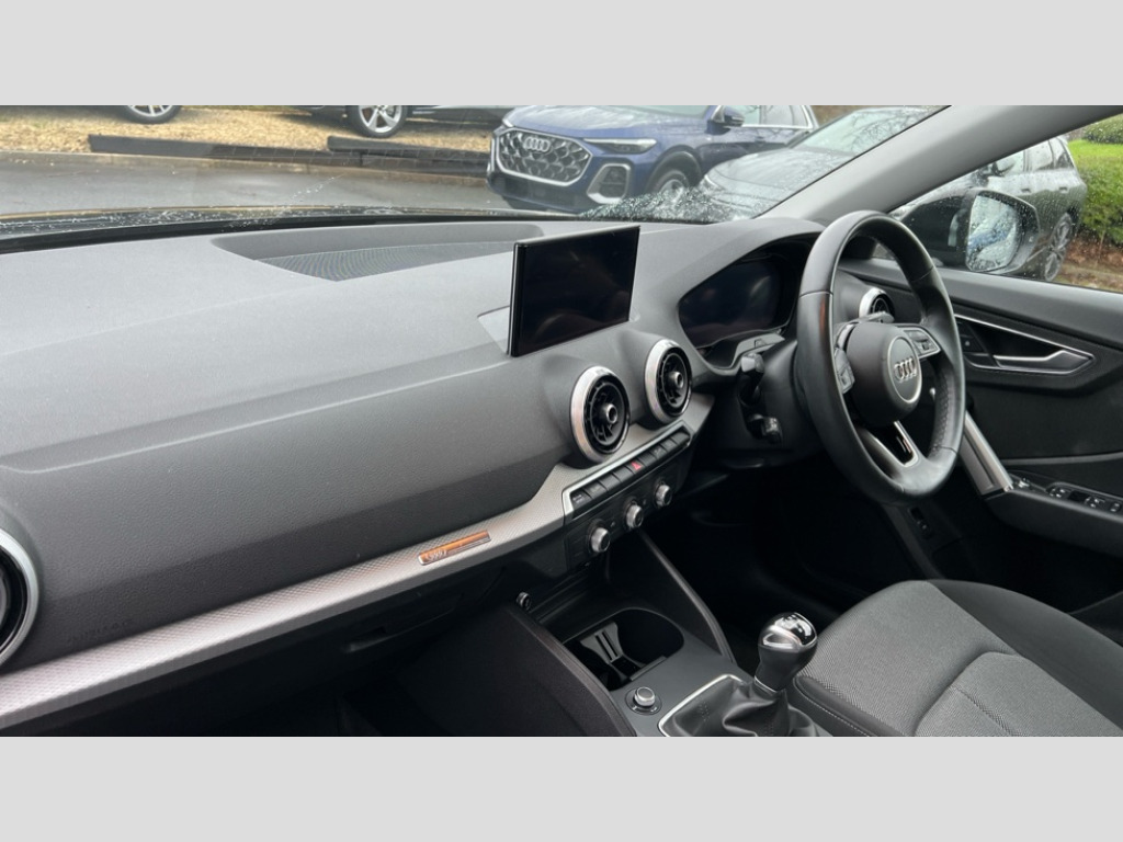Audi Q2 30 TFSI Sport 5dr 3D map display, Audi connect navigation and infotainment includes innovative services, Audi connect remote and control connects your vehicle to your smartphone, Audi drive select: power steering assistance + engine (modes: comfort, auto, dynamic, individual), Audi smartphone interface - Apple carplay/Android Auto, USB connect, 2xSDXC card readers, voice control for navi, telephone, music and 3rd party apps, Audi virtual cockpit, Automatic start/stop system with recuperation, Bluetooth interface includes bluetooth audio streaming, Cruise control, E-call, Jukebox hard drive memory for music (10GB), MMI navigation plus with 8.3" colour MMI screen and MMI touch, Natural voice recognition, Power operated tailgate, Progressive steering, Rear parking sensors, 6 passive loudspeakers, DAB Digital radio, Auto dimming rear view mirror, Black window trims, Body colour door mirrors, Contrast bumpers in Manhattan grey, Electrically adjustable, folding, auto dimming and heated door mirrors with integrated LED side indicators, Front windscreen with grey tinted sunband, LED daytime running lights, LED headlights with dipped beam, high beam, position lights, indicators, LED third brake light, Rear side wing doors, Rear wiper, Side skirts in manhattan grey, Variable front intermittent wipers, Wheel arch trims in manhattan grey, 12V socket in front, 3 seat bench in 2nd row, 3 spoke leather trimmed multi-function steering wheel with height and reach adjustable, 4-way electric lumbar support for front seats including manual seat height adjustment for both front seats, 60/40 split folding rear seat bench, Black carpets, Front and rear head restraints, Front centre armrest, Front sport seats, Front/rear floor mats, Grey cloth headlining, Height/reach adjust steering wheel, Index cloth upholstery, ISOFIX child seat mounting in front passenger and rear outer seats, Manual air conditioning, Single front passenger seat, 3x3 point rear seatbelts, 6 airbags - Front, curtain and front side airbags, Electromechanical parking brake, Electronic stabilisation control including ABS, ASR and EDL, Front passenger airbag deactivation, Hill hold assist, Pre-sense front with pedestrian recognition, Seatbelt monitoring, Tyre pressure warning light with visual and acoustic warning, Warning triangle and first aid kit, Anti theft alarm, Anti theft wheel bolts, Electronically operated child locks, Remote central door locking, Aluminium interior element, Black dashboard, Inlays in silver grey diamond paint, Tool kit