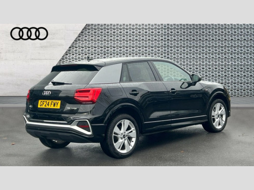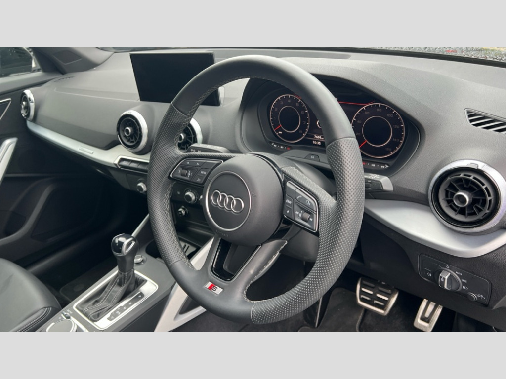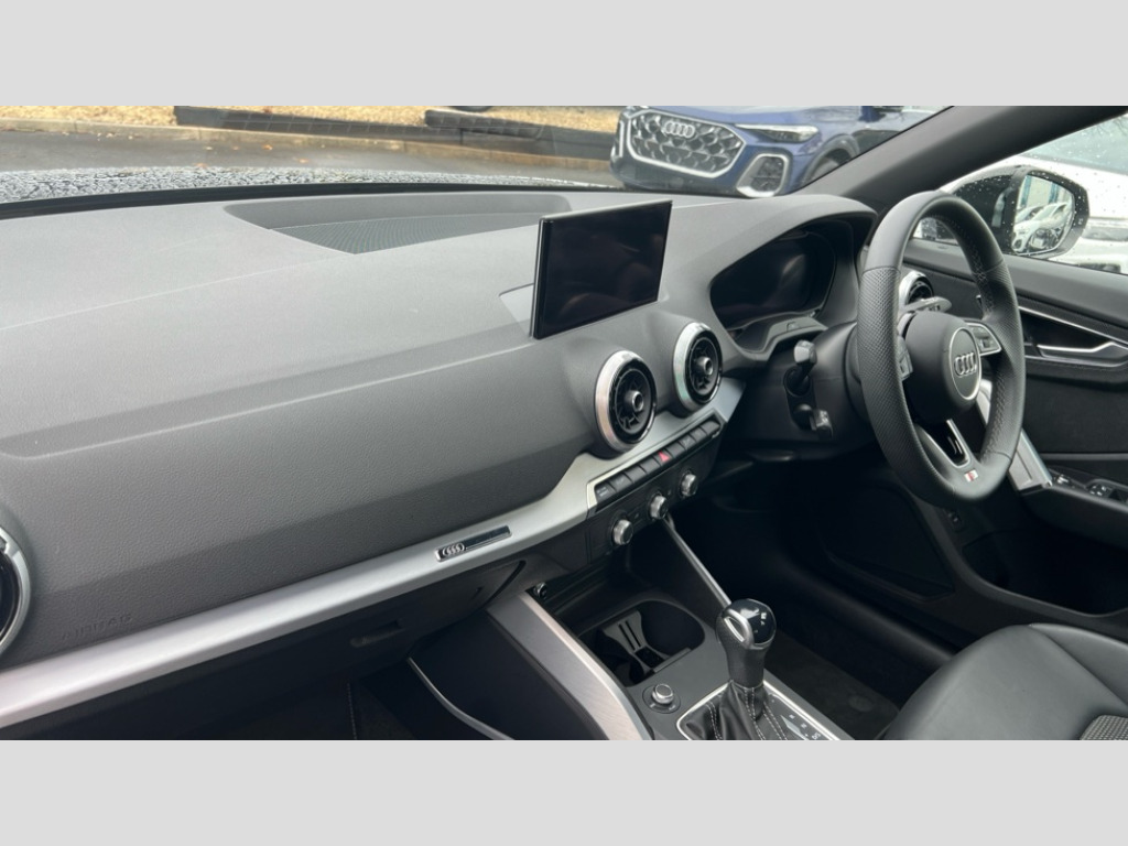 Audi Q2 35 TFSI S Line 5dr S Tronic 3D map display, Audi connect navigation and infotainment includes innovative services, Audi connect remote and control connects your vehicle to your smartphone, Audi drive select: S tronic - power steering assistance + engine + gearshift (modes: comfort, auto, dynamic, efficiency, individual), Audi smartphone interface - Apple carplay/Android Auto, USB connect, 2xSDXC card readers, voice control for navi, telephone, music and 3rd party apps, Audi virtual cockpit, Automatic start/stop system with recuperation, Bluetooth interface includes bluetooth audio streaming, Cruise control, Distraction and Fatigue warning, E-call, Jukebox hard drive memory for music (10GB), Lane departure warning, MMI navigation plus with 8.8" touchscreen, Natural voice recognition, Power operated tailgate, Progressive steering, Rear parking sensors, Sport suspension, 6 passive loudspeakers, DAB Digital radio, USB type C port, Auto dimming rear view mirror, Black window trims, Body colour door mirrors, Electrically adjustable, folding, auto dimming and heated door mirrors with integrated LED side indicators, Front windscreen with grey tinted sunband, LED daytime running lights, LED headlights with dipped beam, high beam, position lights, indicators, LED rear lights, LED third brake light, Privacy glass - dark tinted rear and rear side windows from B-pillar backwards, Rear side wing doors, Rear wiper, S Line badges on the front wings, S Line body styling - front and rear bumpers, side skirts, radiator grille, rear diffuser insert and front air intakes, Variable front intermittent wipers, Wheel arch trims in manhattan grey, 12V socket in front, 3 seat bench in 2nd row, 3 spoke multi-function leather steering wheel with S badging, 4-way electric lumbar support for front seats including manual seat height adjustment for both front seats, 60/40 split folding rear seat bench, Black carpets, Black cloth headlining, Front and rear head restraints, Front centre armrest, Front sport seats, Front/rear floor mats, Height/reach adjust steering wheel, Illuminated door sill trims with S logo, ISOFIX child seat mounting in front passenger and rear outer seats, Manual air conditioning, Single front passenger seat, Stainless steel pedals, 3x3 point rear seatbelts, 6 airbags - Front, curtain and front side airbags, Electromechanical parking brake, Electronic stabilisation control including ABS, ASR and EDL, Front passenger airbag deactivation, Hill hold assist, Pre-sense front with pedestrian recognition, Seatbelt monitoring, Tyre pressure warning light with visual and acoustic warning, Warning triangle and first aid kit, Anti theft alarm, Anti theft wheel bolts, Electronically operated child locks, Remote central door locking, Aluminium interior element, Black dashboard, Gloss black centre console, Matt brushed aluminium trim inlays, Tool kit