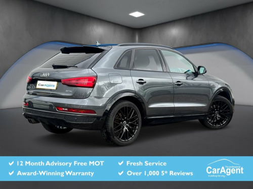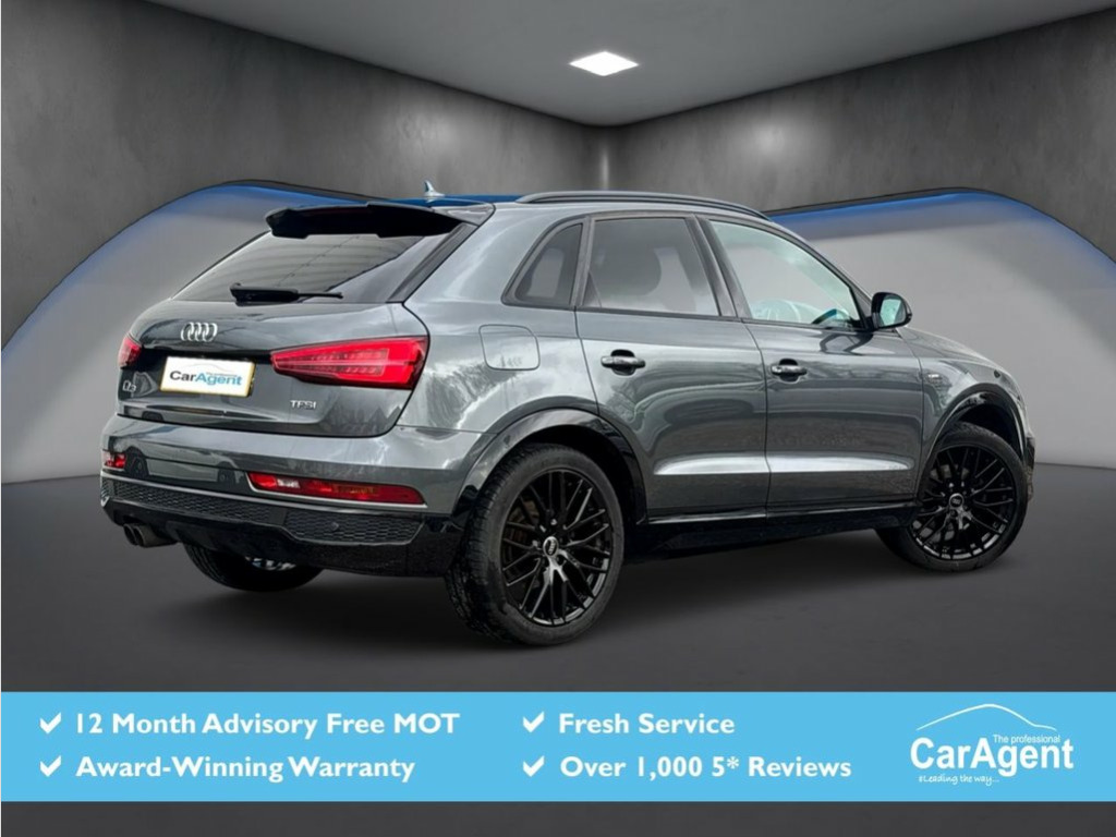 This 2018 Audi Q3 TFSI Black Edition boasts exceptionally low mileage for its age, having covered just 52,800 miles. As a Euro 6 compliant vehicle, it features a responsive 1.4 litre petrol engine, offering a blend of performance and efficiency. The Black Edition trim ensures a stylish and sophisticated presence, making this Q3 a desirable choice for those seeking a premium compact SUV. With a fuel economy of 46 miles per gallon, this Q3 is more economical than many similar vehicles, helping to reduce running costs. Furthermore, its acceleration from 0 to 60 miles per hour in just 8.9 seconds demonstrates its capable performance. This combination of impressive fuel efficiency and brisk acceleration makes the Audi Q3 TFSI Black Edition a well rounded and appealing option. We hand pick our cars from several trusted sources we have used for over 9 years as we know their cars are prepared to the highest standard. As well as these benefits our team will make sure you have the best experience during your purchase and the car will be prepared to the highest standards. We are a UK Award Winning customer car team with our own in house 3 month warranty and service Centre with options to extend your warranty for 12, 24 or 36 months. Our cars come with 12 months MOT no advisories, service and inspections, cambelt changes if required and are all HPI Clear. Feel free to make an appointment and drive our cars to see how you feel before making a decision. Please check out our reviews on Tr 19in Alloy Wheels - 10-Y-Spoke Design - , 4-Way Electric Lumbar Support for Front , 6.5in Colour Display Screen, AMI - Audi Music Interface, Anti Theft Locking Wheel Bolts, Anti-Theft Alarm, Audi Drive Select, Audi Parking System Plus, Auto-Dimming Rear-View Mirror, BOSE Surround Sound System, Black Roof Rails, Black Styling Pack with Black Roof Rails, Bluetooth Interface, Chrome-Plated Trims for Exhaust Tailpipe, Cloth Headlining in Black, Concert Radio, Cruise Control, DAB Digital Radio, Door Mirrors - Heated-Electrically Adjus, Driver - Front Passenger - Front Side an, Drivers Information System - DIS - 3.5in, Dual-Zone Electronic Climate Control, ESC - Electronic Stabilisation Control i,