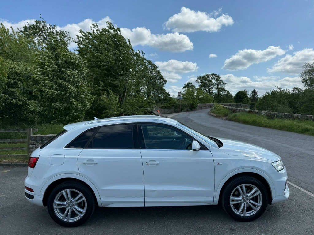 Motobarn is delighted to offer to market this stunning Audi Q3 S-Line automatic presented in Ibis white and complemented with black half leather S-Line embossed seats and boasting just under £4000 in factory optional extras.. Covered just 37000 miles , and only one former keeper from new, this 2018 Audi Q3 is offered with a full service history. This Q3 is the TFSI S line Edition, with a 1.4L petrol engine and S line Edition trim. You'll also have peace of mind with a 3-month warranty and a fresh 12-month MOT provided on purchase. The vehicle is equipped with the Technology Package, including Bluetooth connectivity. Manoeuvring is made easy with the Audi Parking System Advanced, featuring a reversing camera and park assist, including front and rear sensors. The addition of privacy glass enhances the vehicle's sleek appearance, which is further complemented by 19-inch alloy wheels in a 5-double-spoke off-road design and LED headlights with LED rear lights and dynamic rear indicators.This Euro 6-compliant vehicle stands out with its low CO2 emissions, making it a more environmentally conscious choice. The fuel economy is excellent, achieving up to 50 mpg, which means fewer trips to the petrol station compared to similar vehicles. Acceleration from 0-62mph takes just 9.2 seconds, demonstrating its responsive performance.