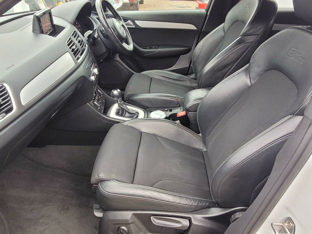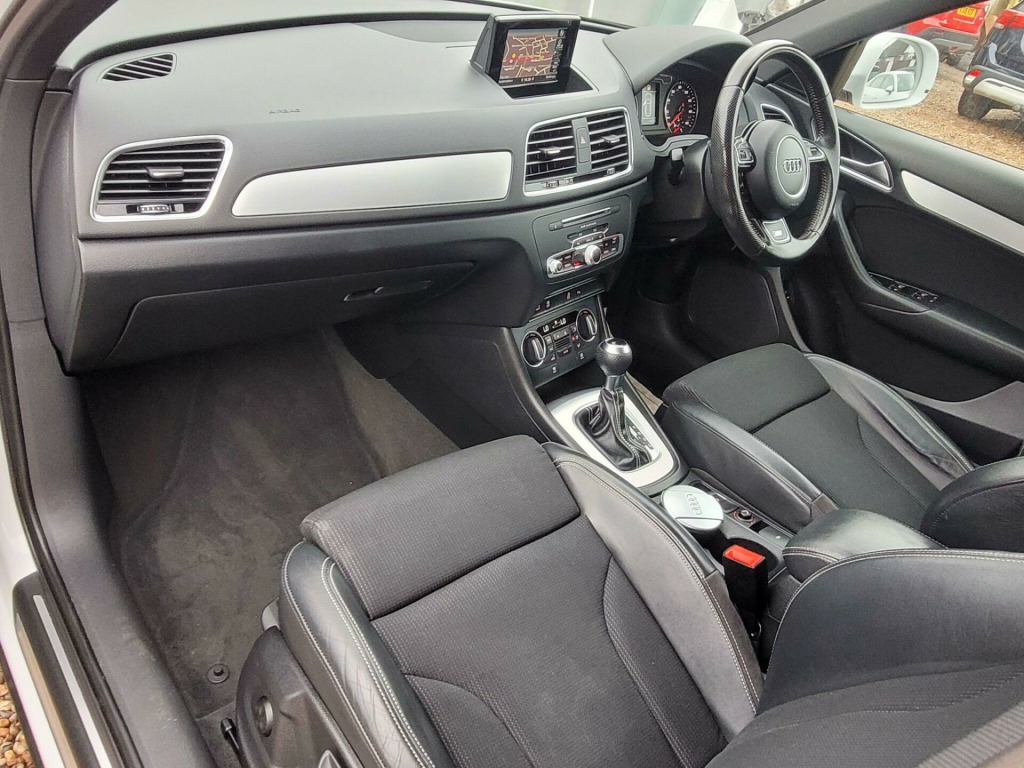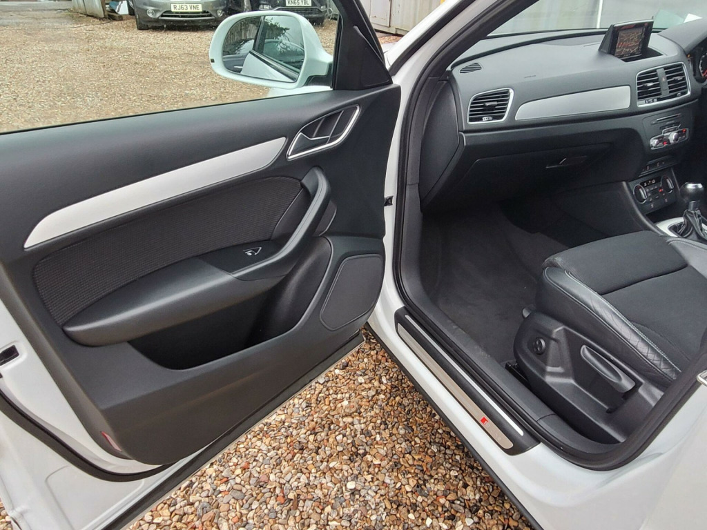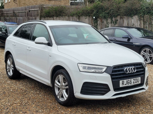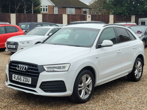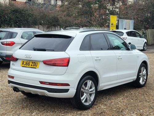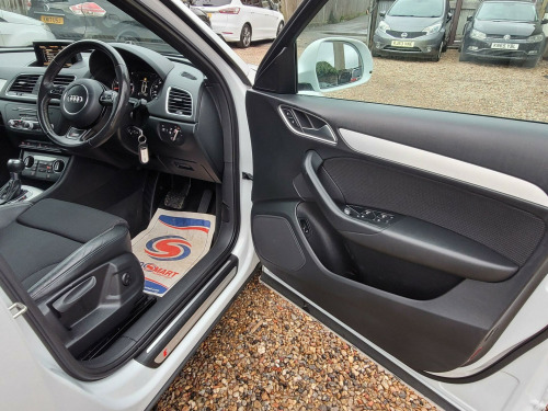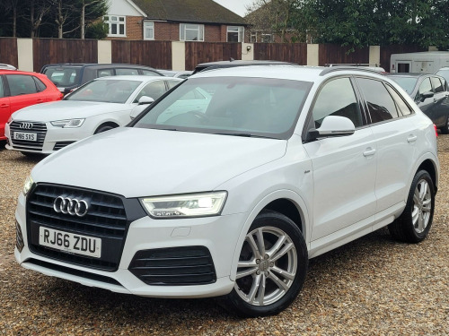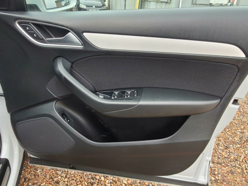 This 2017 Audi Q3 TFSI S line boasts a clear vehicle history, offering you peace of mind. This stylish SUV features a 1.4 litre petrol engine and meets Euro 6 emissions standards. Inside, you'll find a comfortable cabin equipped with Dual Zone Electronic Climate Control, ensuring everyone stays at their ideal temperature. For convenience, it includes a Bluetooth interface for seamless connectivity and rear parking sensors to assist with manoeuvring. The All Weather LED Headlights provide excellent visibility, complemented by a Light and Rain Sensor that automatically adjusts your headlights.Experience impressive efficiency with this Q3, achieving a fuel economy of 48 miles per gallon, which is better than many similar vehicles. Its low CO2 emissions also contribute to its economical running costs. Performance is equally engaging, with an acceleration of 0 to 60 miles per hour in just 8.6 seconds, demonstrating a responsive driving experience that sets it apart from other cars in its class. di sound system, 18in alloy wheels - 5-double-spoke design, privacy glass, s line sports suspension, 18in alloy wheels - 5-twin-spoke design partly polished, 3-spoke multi-function q-design steering wheel, 4-way electric lumbar support for front seats, 6.5in display screen, 8 passive speakers, ami - audi music interface, all weather led headlights, aluminium roof rails, aluminium window trims, anti theft locking wheel bolts, audi drive select, bluetooth interface, body-coloured door mirrors - electrically adjustable and heated with integrated led indicator signals, bright moulding, chrome-plated trims for exhaust system, cloth headlining and dashboard in black, concert radio, dab digital radio, door mirrors - heated-electrically adjustable-folding, door sill trims with s line logo, driver - front passenger - front side and head airbag system, drivers information system - dis, dual-zone electronic climate control, dynamic suspension, esp - electronic stability programme, efficiency program in the drivers information system - dis, electric windows - front and rear, electromechanical parking brake, electromechanical power steering - speed-sensitive provides a precise steering feel at high speeds and excellent assistance when parking., first aid kit, floor mats - front and rear in velour, fog lights - chrome surrounds, front centre armrest, front passenger airbag deactivation switch, front sports seats, front and rear fog lights, full body-colour finish on bumpers-wheel arch trims-lower door trims, gear knob - perforated leather, headlight washer system, heated windscreen washer jets, isofix child seat mounting, inlays - matt brushed aluminium, led tail lights, light and rain sensor, power operated tailgate, rear parking sensors, remote central locking, reversible luggage compartment floor, s line badges on front wings, s line body styling, s line radiator grille with horizontal struts in high-gloss black, satellite navigation system - sd card based, seat belt monitoring, seats - split folding rear backrest, smoking package, space saver spare wheel, stainless steel loading sill protector, steering wheel - height and reach adjustable, thatcham category 1 alarm and immobiliser, tool kit and car jack, towbar preparation, tyre pressure loss indicator, voice control system, warning triangle, washer fluid level indicator, windscreen with sunband