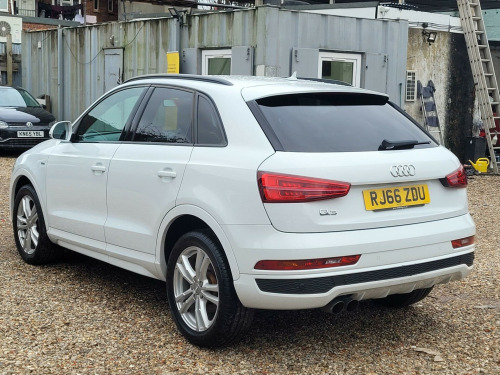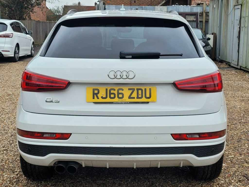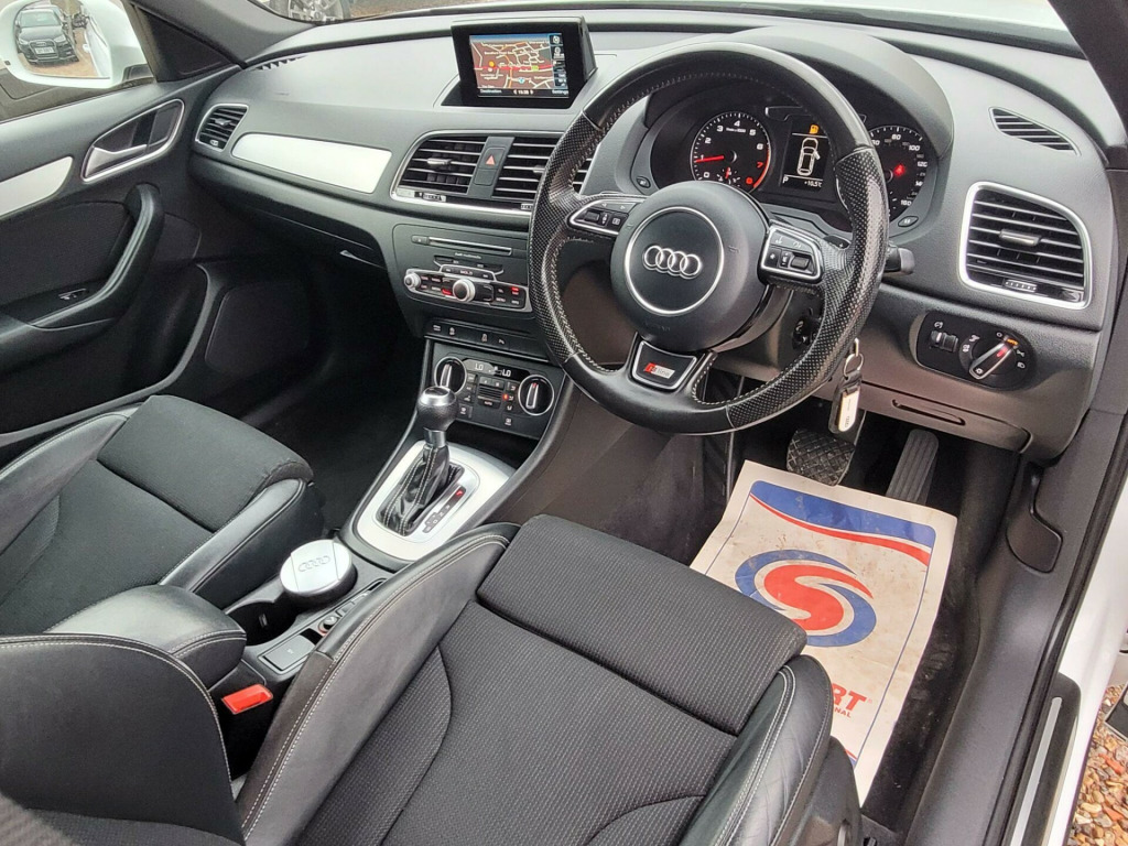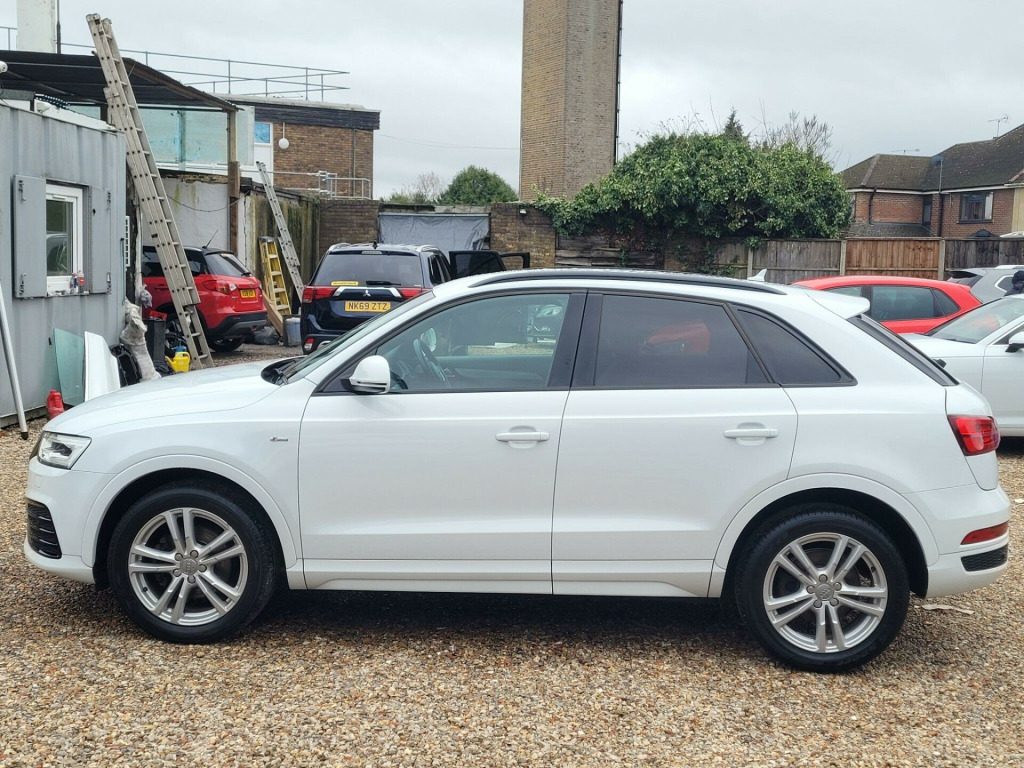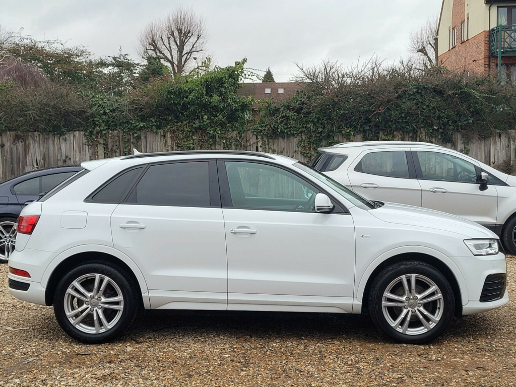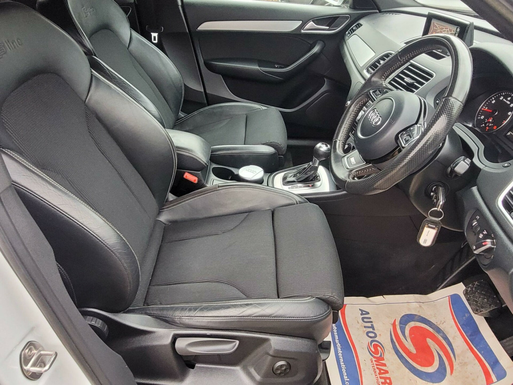 This 2017 Audi Q3 TFSI S line boasts a clear vehicle history, offering you peace of mind. This stylish SUV features a 1.4 litre petrol engine and meets Euro 6 emissions standards. Inside, you'll find a comfortable cabin equipped with Dual Zone Electronic Climate Control, ensuring everyone stays at their ideal temperature. For convenience, it includes a Bluetooth interface for seamless connectivity and rear parking sensors to assist with manoeuvring. The All Weather LED Headlights provide excellent visibility, complemented by a Light and Rain Sensor that automatically adjusts your headlights.Experience impressive efficiency with this Q3, achieving a fuel economy of 48 miles per gallon, which is better than many similar vehicles. Its low CO2 emissions also contribute to its economical running costs. Performance is equally engaging, with an acceleration of 0 to 60 miles per hour in just 8.6 seconds, demonstrating a responsive driving experience that sets it apart from other cars in its class. di sound system, 18in alloy wheels - 5-double-spoke design, privacy glass, s line sports suspension, 18in alloy wheels - 5-twin-spoke design partly polished, 3-spoke multi-function q-design steering wheel, 4-way electric lumbar support for front seats, 6.5in display screen, 8 passive speakers, ami - audi music interface, all weather led headlights, aluminium roof rails, aluminium window trims, anti theft locking wheel bolts, audi drive select, bluetooth interface, body-coloured door mirrors - electrically adjustable and heated with integrated led indicator signals, bright moulding, chrome-plated trims for exhaust system, cloth headlining and dashboard in black, concert radio, dab digital radio, door mirrors - heated-electrically adjustable-folding, door sill trims with s line logo, driver - front passenger - front side and head airbag system, drivers information system - dis, dual-zone electronic climate control, dynamic suspension, esp - electronic stability programme, efficiency program in the drivers information system - dis, electric windows - front and rear, electromechanical parking brake, electromechanical power steering - speed-sensitive provides a precise steering feel at high speeds and excellent assistance when parking., first aid kit, floor mats - front and rear in velour, fog lights - chrome surrounds, front centre armrest, front passenger airbag deactivation switch, front sports seats, front and rear fog lights, full body-colour finish on bumpers-wheel arch trims-lower door trims, gear knob - perforated leather, headlight washer system, heated windscreen washer jets, isofix child seat mounting, inlays - matt brushed aluminium, led tail lights, light and rain sensor, power operated tailgate, rear parking sensors, remote central locking, reversible luggage compartment floor, s line badges on front wings, s line body styling, s line radiator grille with horizontal struts in high-gloss black, satellite navigation system - sd card based, seat belt monitoring, seats - split folding rear backrest, smoking package, space saver spare wheel, stainless steel loading sill protector, steering wheel - height and reach adjustable, thatcham category 1 alarm and immobiliser, tool kit and car jack, towbar preparation, tyre pressure loss indicator, voice control system, warning triangle, washer fluid level indicator, windscreen with sunband
