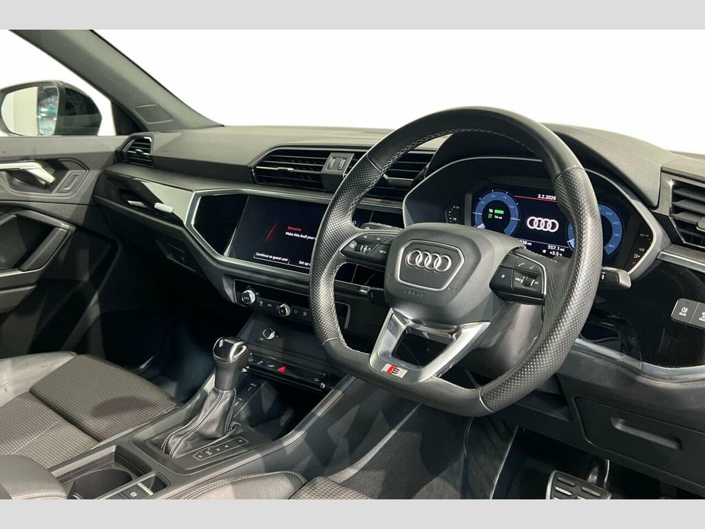 With exceptionally low mileage for its age, this 2022 Audi Q3 TFSIe Black Edition presents a superb ownership proposition. This Euro 6 compliant plug in hybrid boasts a 1.4 litre petrol engine and has had only one owner since new, with its MOT valid until November 2026 and a clear vehicle history check. The Black Edition trim is enhanced by striking 20 inch alloy wheels in a 5 twin spoke module design with matt structured grey inserts, and an extended ambient lighting pack offering multi coloured illumination. Inside, you will find sport seats finished in Alcantara and leather with S embossing and rock grey stitching, complemented by interior elements in steel grey Alcantara. The Comfort and Sound Package further elevates the experience, including front and rear parking sensors, a rear camera, a premium branded sound system, and heated seats. This Audi Q3 TFSIe Black Edition stands out with its combination of advanced plug in hybrid technology and the desirable Black Edition specification. The very low mileage of just 18928 miles indicates that this vehicle has been used sparingly, suggesting it has been well cared for and is in excellent condition compared to other models of the same age. The comprehensive Comfort and Sound Package, along with the premium interior finishes and striking exterior details, ensures a refined and enjoyable driving experience that surpasses many other vehicles in its class. 2 USB-C Ports with Charge and Data Funct, 20in Alloy Wheels - 8.5J 5-Twin-Spoke - , 20in Alloy Wheels - 8.5J 5-V-Spoke - Sta, 3 Pin 10amp Domestic Charging Cable, 360 Degree Camera, 4-Way Electric Lumbar Support, 6-Airbag System, Adaptive Suspension with Damping Control, Adjustable Rear Seat Bench-Backrest with, Advanced Key, Alcantara Frequency-Twin Leather - Sport, Anti Theft Locking Wheel Bolts, Anti-Theft Alarm, Audi Beam, Audi Connect Infotainment Services Plus , Audi Connect Safety and Service - e-call, Audi Drive Select, Audi Matrix LED Headlights with Dynamic , Audi Pre-Sense Basic, Audi Pre-Sense Front with Pedestrian and, Audi Smartphone Interface includes Wirel, Audi Virtual Cockp