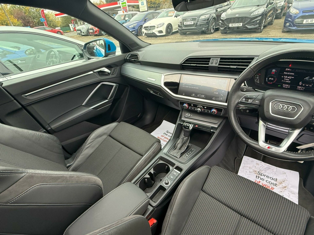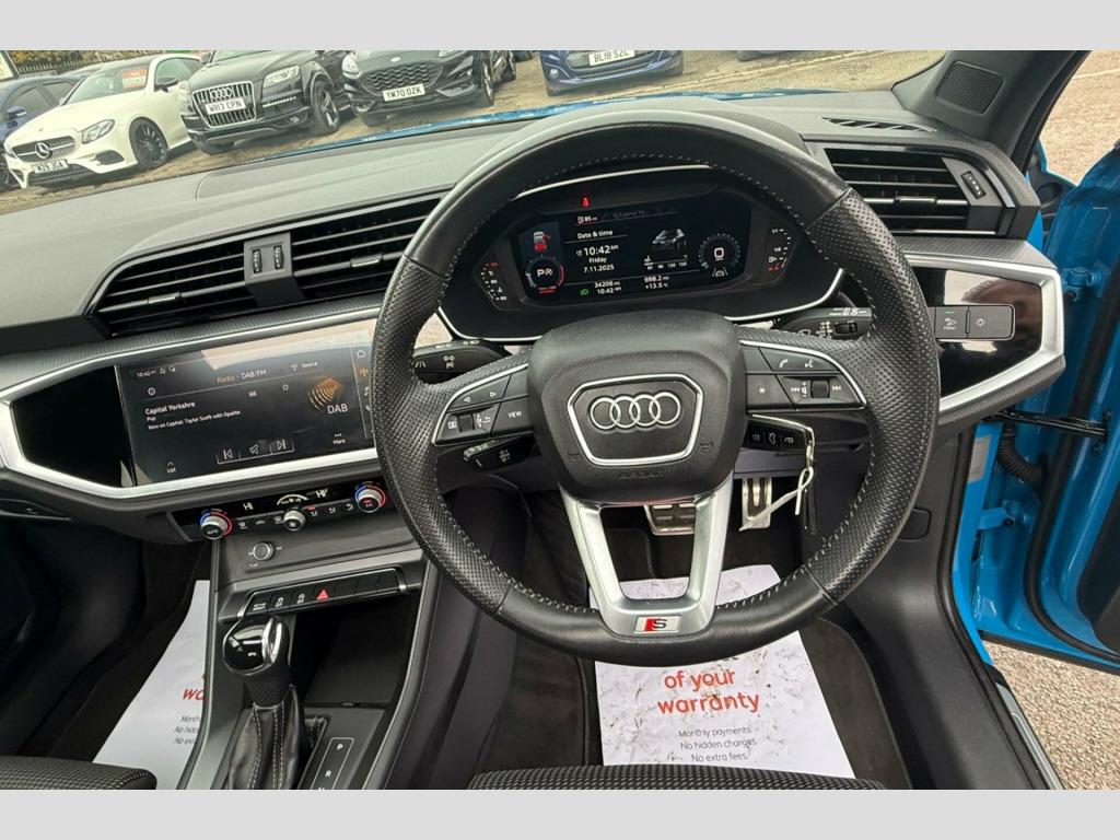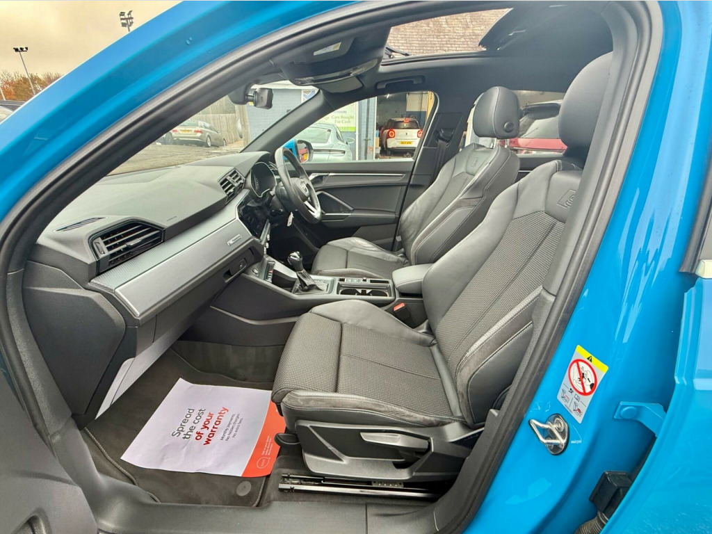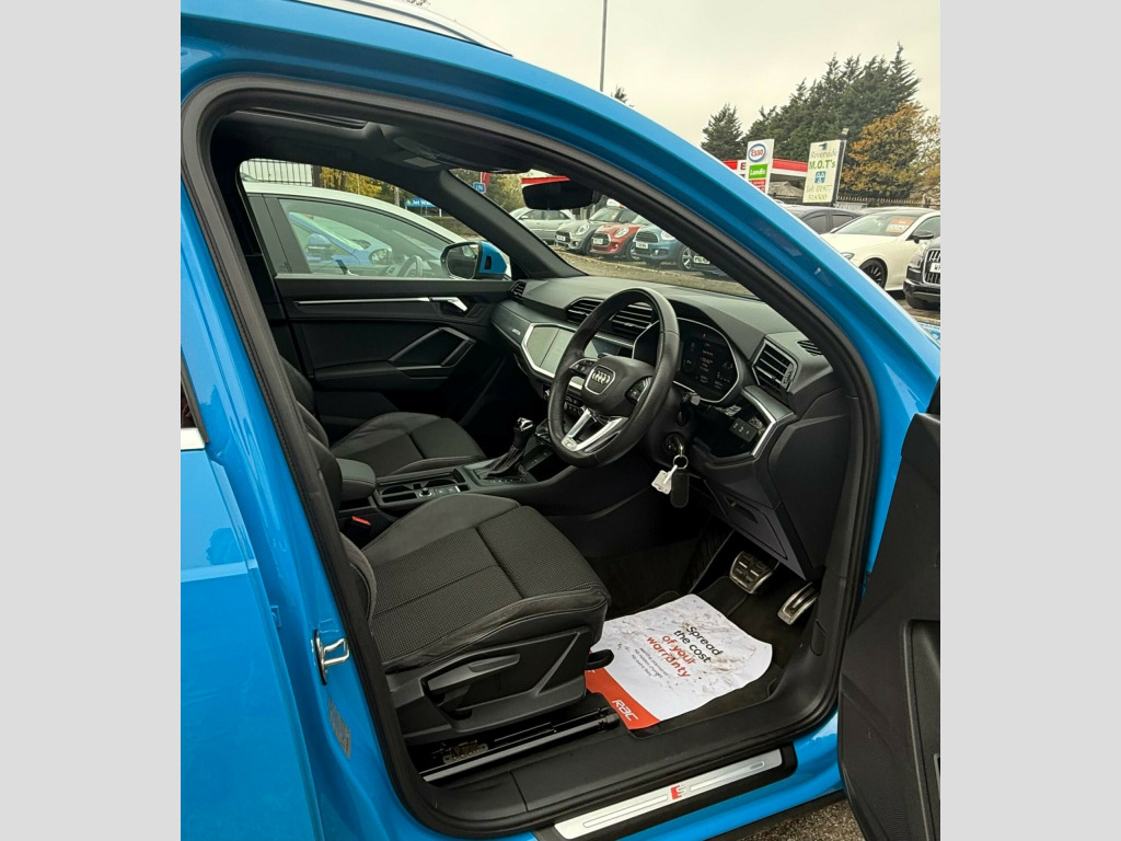 This 2019 Audi Q3 TDI S line presents an exceptional opportunity with its remarkably low mileage of just 33,000 miles. This Euro 6 compliant model boasts a powerful yet efficient 2.0 litre diesel engine, ensuring a refined driving experience. The vehicle has a clear history check, offering peace of mind to its next owner. Inside, you'll find a host of desirable features including a Bluetooth interface for seamless connectivity, rear parking sensors to aid manoeuvrability, and a light and rain sensor for automatic headlight activation. The S line trim also includes Audi Side Assist for enhanced safety and sophisticated LED headlights with dynamic rear indicators.This Audi Q3 stands out with its impressive fuel economy, achieving a highlight of 47 miles per gallon, which is better than many similar vehicles. Its low CO2 emissions further contribute to its cost effectiveness and environmental consideration. Practicality is also a key strength, with a large boot space offering ample room for luggage or shopping, making it a versatile choice for families and individuals alike. in alloy wheels - 5-twin-spoke dynamic, 3-spoke leather multi-function steering wheel - s badging and grips in perforated leather with contrast stitching, 6 passive loud speakers, 6-airbag system, adjustable rear seat bench-backrest with centre armrest and cupholder, aluminium roof rails, aluminium window trims, ambient lighting pack, anti theft locking wheel bolts, anti-theft alarm, audi connect infotainment services plus (3 year subscription from new), audi connect safety and service - e-call, audi drive select, audi pre-sense front with pedestrian and cyclist recognition, audi side assist, audi smartphone interface, audi virtual cockpit - 10.25in display, auto dimming and frameless rear view mirror, b and c-pillar trim in high-gloss black, bluetooth interface, body coloured door mirrors, bumpers in full body colour paint finish, cloth headlining in black, cruise control system with speed limiter, dab digital radio, detail in dashboard around the mmi touch colour display, diffuser - platinum grey - matt, door mirrors - electrically adjustable and heated with integrated led side indicators, door sill trims with aluminium inlay, dual-zone electronic climate control, esc - electronic stabilisation control inc abs - asr and edl, first aid kit and warning triangle, frame of front side air inlets in platinum grey - matt, front centre armrest, front spoiler blade in platinum grey - matt, front sport seats with s embossed logo, front and rear floor mats in black with contrast stitching in rock grey, gear knob - perforated leather, grille vertical bars in aluminium silver - matt, hold assist, isofix child seat mounting for the front passenger seat with front passenger airbag deactivation and isofix child seat mounting and top tether for the outer rear seats, illuminated door sill trims with s logo, inlays - matt brushed aluminium - dark, interior elements in leatherette, led headlights with led daytime running lights and dynamic rear indicator, led rear lights, lane departure warning, light and rain sensor, luggage compartment sill protection in stainless steel, mmi navigation plus with high resolution 10.1in touchscreen colour display, manual seat adjustment for front seats, non-smoking package, pedals in stainless steel, power operated tailgate, pre-sense basic, privacy glass, progressive steering, radiator grille - titanium black, rear parking sensors, s line badges on the front wings, s line front and rear bumpers and side skirts, seat belt monitoring, side skirt insert in platinum grey - matt, sport suspension, tool kit, tow bar preparation, tyre pressure warning light, tyre repair kit, voice control system with natural language interaction, windscreen with acoustic glazing, park assist, panoramic glass sunroof, driver assistance package