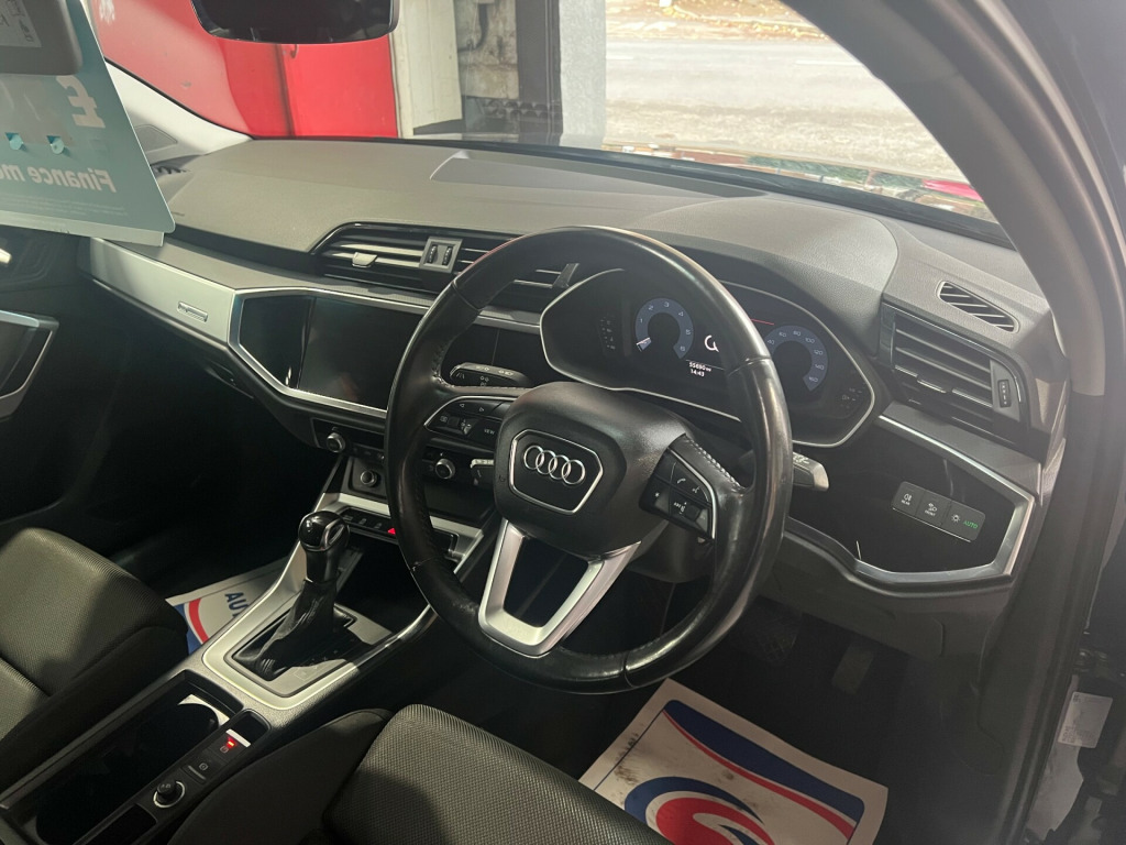 This 2019 Audi Q3 2.0 TDI 35 Sport SUV, with only 55376 miles on the clock, is a sleek and stylish Diesel SUV that comfortably seats five with ample room for passengers and cargo, boasting 5 doors and equipped with modern features such as 1 x USB-C and 1 x USB-A Port with Charge and Data Functions, 6 Passive Loud Speakers, Audi Connect Infotainment Services Plus including Amazon Alexa Integration (3 Year Subscription From New), Audi Connect Safety and Service - e-call, and Audi Smartphone Interface Includes Wireless Apple CarPlay. This ULEZ compliant vehicle comes with an MOT valid until 27/07/2026 and is Euro 6 (s/s) (150 ps) compliant, making it an ideal choice for city and long-distance driving alike. Don't miss out on this top-of-the-line Audi SUV, perfect for those seeking luxury, performance, and efficiency combined. x usb-c and 1 x usb-a port with charge and data functions, 6 passive loud speakers, audi connect infotainment services plus including amazon alexa integration (3 year subscription from new), audi connect safety and service - e-call, audi smartphone interface includes wireless apple carplay, bluetooth interface, dab digital radio, mmi navigation plus with high resolution 10.1in touchscreen colour display, 18in alloy wheels - 5-double-arm design, aluminium roof rails, aluminium window trims, anti theft locking wheel bolts, b and c-pillar trim in high-gloss black, body coloured door mirrors, bumpers in full body colour paint finish, door mirrors - electrically folding - adjustable and heated with integrated led side indicators and kerb-view function for passenger side, electric windows - front, frame of front side air inlets in selenite silver - matt, front spoiler in selenite silver - matt, grille surround in silver - chrome, grille vertical bars in aluminium silver - matt, radiator grille - titanium black, rear diffuser in selenite silver - matt, tyre repair kit, windscreen in acoustic glazing, 3-spoke leather multi-function steering wheel - height and reach adjustable, adjustable rear seat bench-backrest, aluminium look interior elements, audi virtual cockpit - 10.25in display, auto dimming and frameless rear view mirror, cloth headlining in lunar silver, detail in dashboard around the mmi touch colour display in glass look - black with surround in aluminium look, door sill trims with aluminium inlay, dual-zone electronic climate control, front centre armrest, front and rear floor mats, inlays - micrometallic silver, interior lighting, luggage compartment sill protection in stainless steel, manual seat adjustment for front seats, non-smoking package, power operated tailgate, tool kit, 6-airbag system, anti-theft alarm, audi pre-sense front with pedestrian and cyclist recognition, esc - electronic stabilisation control inc abs - asr and edl, electromechanical parking brake, electronically operated child locks, first aid kit and warning triangle, hill descent control, hill hold assist, isofix child seat mounting for the front passenger seat with front passenger airbag deactivation and isofix child seat mounting and top tether for the outer rear seats, pre-sense basic, seat belt monitoring, audi drive select, audi side assist, camera-based traffic sign recognition, cruise control with speed limiter, lane departure warning, progressive steering, rear parking sensors, standard suspension, tyre pressure warning light, voice control system with natural language interaction, led headlights with led daytime running lights and dynamic rear indicator, led rear lights, light and rain sensor