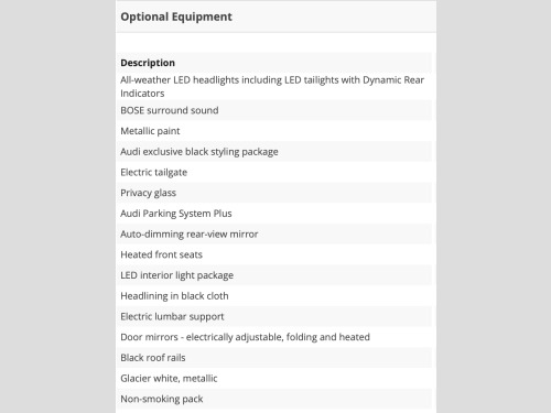 Ball Automotive Ltd..... Over 200 5* online reviews and recently awarded Highly Rated by AutoTrader for our customer service (again). , Click our Dealer Reviews page to get an idea of what its like to buy a car from Ball Automotive Ltd. , Supplied with; 2x Keys, A super service history and will come with 12 months MOT. Benefitting from being last serviced 14/08/2025 at 56,540 miles. , HPI Clear. , The superb specification includes; All-weather LED headlights including LED tail lights with Dynamic Rear Indicators, Audi exclusive black styling package, Bluetooth telephone connectivity with wireless music streaming, BOSE surround sound, Satellite navigation, Audi Parking system plus, LED interior light package, Heated front seats, Electric tailgate, Cruise control and much much more. , Click our Dealer Reviews page to get an idea of what its like to buy a car from Ball Automotive Ltd. , Available to reserve now. , We are a local, independent, family run business with no pushy sales people where all viewings are by appointment only. , PLEASE TAKE A MOMENT TO READ OUR DEALER REVIEWS. , ***Finance is available*** , ***Nationwide Delivery Available*** , ***Part exchange is welcome*** , ***Viewing is strictly by appointment only*** , ***Available to reserve now*** , ***Video call walk arounds available upon request*** , , Please feel free to get in touch with any questions.