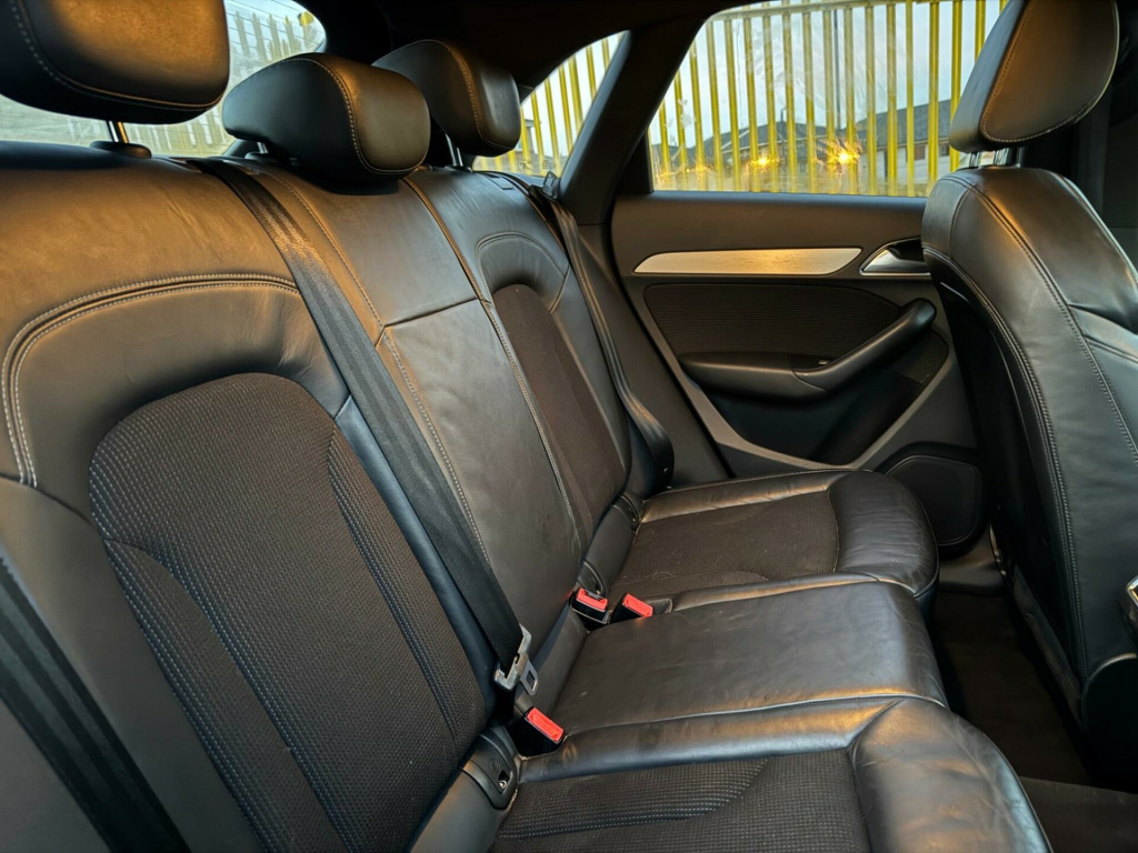 This Audi Q3 TDI S line from 2014 presents an exceptional opportunity with its remarkably low mileage of just 66,000 miles for its age. This well appointed SUV features a powerful 2.0 litre diesel engine and the desirable S line trim, offering a blend of performance and style. You'll appreciate the convenience of rear parking sensors with parking assistance, ensuring easier manoeuvring in tight spaces. The Bi-Xenon Plus headlights with automatic activation provide excellent visibility, while the Bluetooth interface for mobile telephone preparation keeps you connected on the go. Inside, the dual zone electronic climate control allows both driver and passenger to set their preferred temperature for ultimate comfort.Experience impressive efficiency with a fuel economy of 51 miles per gallon, making this Q3 an economical choice for your journeys. Its acceleration from 0 to 62 miles per hour in just 8.3 seconds demonstrates its responsive performance. These highlights, combined with its low mileage and comprehensive features, indicate that this Audi Q3 offers a superior driving experience compared to many other vehicles of its kind. v power socket - rear centre console, 18in alloy wheels - 5-double-spoke design, 6.5in display screen, abs - anti-lock braking system, ami - audi music interface, asr - anti slip regulation, airbags - driver, airbags - front passenger, airbags - front side, airbags - head system, alarm - thatcham category 1, anti theft locking wheel bolts, automatic wipers with rain sensor, brake lights - led, bumpers - front and rear - s line design, car jack, cloth headlining in black, concert radio - mp3/cd player, dab digital radio, diffuser insert and centre front spoiler lip painted in platinum grey, door mirrors - body coloured with integrated led indicators, door mirrors - electrically adjustable and heated, door sill trims with s line logo, drivers information system - dis, dual-zone electronic climate control, dynamic suspension, ebd - electronic brakeforce distribution, edl - electronic differential lock, esp - electronic stability programme, efficiency program in the drivers information system - dis, electric windows - front and rear, electrically adjustable 4-way lumbar support, electromechanical parking brake, electromechanical power steering, exhaust tailpipe - chrome plated, first aid kit, fog lights - chrome surrounds, folding storage compartment in front centre armrest, front centre armrest - adjustable, front fog lights, front passenger airbag deactivation switch, front sports seats, front and rear floor mats, full paint finish, gear knob - perforated leather, glovebox - ventilated, headlights - automatic activation, headlights - automatic adjustment, headlights - automatic dynamic range control, headlights - bi-xenon plus, headlights - coming-leaving home function, headlights washers, heated windscreen washer jets, isofix child seat mounting for front passenger, isofix child seat preparation for rear seats with top tether, inlays - matt brushed aluminium, led daytime running lights, led rear indicators, led rear lights, mobile telephone preparation - bluetooth interface, preparation for sd card-based navigation system, radiator grille - with vertical chrome bars, rear parking sensors, rear air vents in rear centre console, remote central locking with 2 fold away keys, reversible luggage compartment floor, roof rails - aluminium, s line badges on front wings, s line body styling, sdhc card reader x2, seat belt reminder, seats - drivers manual height adjustment, seats - front sports - s line embossed, seats - sports, smoking package, space saver spare wheel, speakers x8, split-folding rear seats, stainless steel loading sill protector, steering wheel - 3-spoke leather trimmed sports, steering wheel - height and reach adjustable, steering wheel - multi-function, sunband for windscreen, tp memo - automatically saves traffic news, thatcham category 1 immobiliser, tool kit, towbar preparation, tyre pressure monitoring system, voice control - telephone, warning triangle, washer fluid level indicator, window surrounds - aluminium