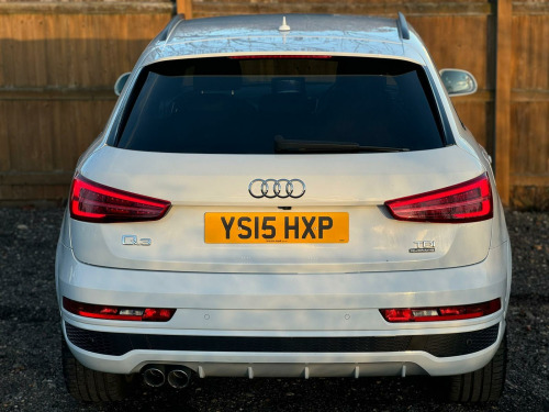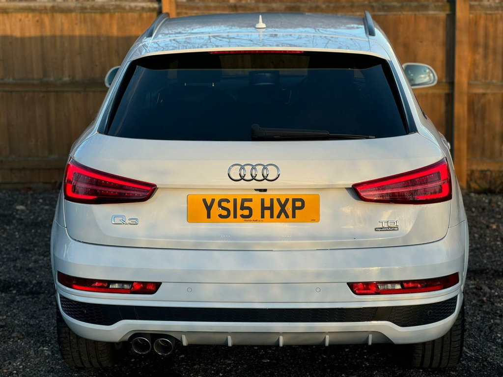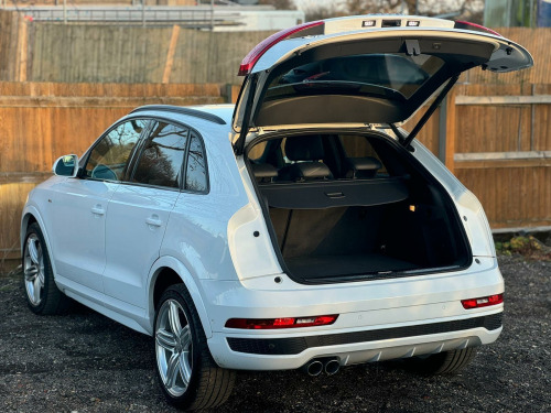 This Audi Q3 TDI S line Plus from 2015 boasts a clear vehicle history and has had only two owners, offering peace of mind. This stylish SUV features a powerful 2.0 litre diesel engine paired with Four Wheel Drive for confident handling in various conditions. It meets Euro 6 emissions standards, and the S line Plus trim ensures a premium feel.Experience the responsive performance of this Q3, accelerating from 0 to 60mph in just 7.6 seconds, a highlight that sets it apart from many similar vehicles. The car is equipped with All Weather LED Headlights that activate automatically, along with rear parking sensors to aid manoeuvring. Stay connected and comfortable with the Bluetooth mobile telephone preparation and Dual-Zone Electronic Climate Control, ensuring a pleasant journey for all occupants. v power socket - rear centre console, 19in alloy wheels - 5-segment-spoke design, 6.5in display screen, 7-digit postcode recognition, abs - anti-lock braking system, ami - audi music interface, asr - anti slip regulation, airbags - driver, airbags - front passenger, airbags - front side, airbags - head system, alarm - thatcham category 1, all weather led headlights, aluminium-effect door mirror housings, anti theft locking wheel bolts, audi drive select, audi parking system plus, auto-dimming rear-view mirror, automatic wipers with rain sensor, brake lights - led, bumpers - front and rear - s line design, car jack, cloth headlining in black, comfort package, concert radio - mp3/cd player, cruise control, dab digital radio, dashboard - black, diffuser insert and centre front spoiler lip painted in platinum grey, door mirrors - automatic kerb view dipping function when reversing, door mirrors - body coloured with integrated led indicators, door mirrors - heated-electrically adjustable-folding, door sill trims with s line logo, drivers information system - dis, dual-zone electronic climate control, dynamic rear indicators, dynamic suspension, ebd - electronic brakeforce distribution, edl - electronic differential lock, esp - electronic stability programme, electric windows - front and rear, electrically adjustable 4-way lumbar support, electromechanical parking brake, electromechanical power steering, exhaust tailpipe - chrome plated, first aid kit, floor mats - front and rear in velour, folding storage compartment in front centre armrest, front centre armrest - adjustable, front fog lights, front passenger airbag deactivation switch, full european map data, full paint finish, gear knob - perforated leather, headlights - automatic activation, headlights - automatic adjustment, headlights - automatic dynamic range control, headlights - coming-leaving home function, headlights - high-beam assist, headlights washers, heated windscreen washer jets, isofix child seat mounting for front passenger, isofix child seat preparation for rear seats with top tether, inlays - matt brushed aluminium, led daytime running lights, led rear indicators, led rear lights, manual front seat adjustment, mobile telephone preparation - bluetooth interface, parking sensors - front, power operated tailgate, privacy glass, radiator grille - with vertical chrome bars, rear parking sensors, remote central locking with 2 fold away keys, reversible luggage compartment floor, roof rails - aluminium, s line badges on front wings, s line body styling, sdhc card reader x2, satellite navigation system - sd card based, seat belt reminder, seats - front sports - s line embossed, secondary collision brake assist, smoking package, space saver spare wheel, speakers x8, split-folding rear seats, stainless steel loading sill protector, steering wheel - 3-spoke leather-multifunction-shift paddles-q-design, steering wheel - gear-shift paddles, steering wheel - height and reach adjustable, steering wheel - multi-function, sunband for windscreen, tp memo - automatically saves traffic news, tool kit, towbar preparation, trip computer, tyre pressure monitoring system, voice control - telephone, warning triangle, washer fluid level indicator, window surrounds - aluminium