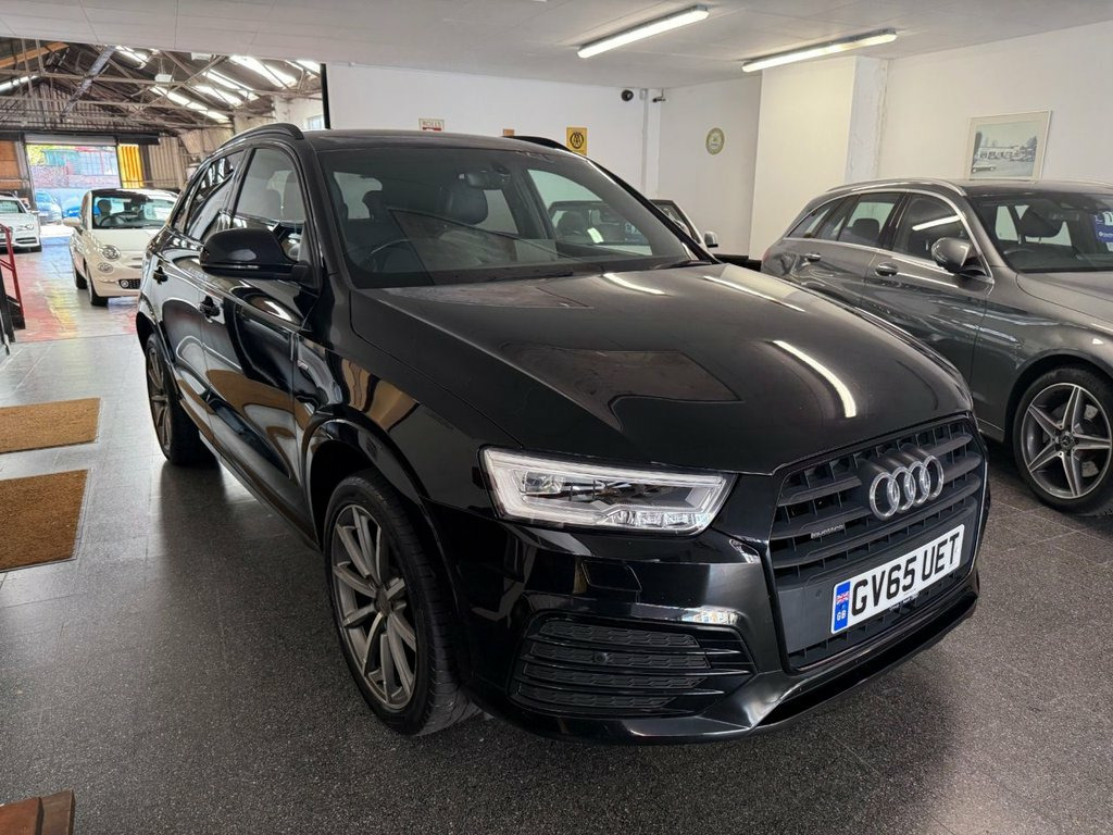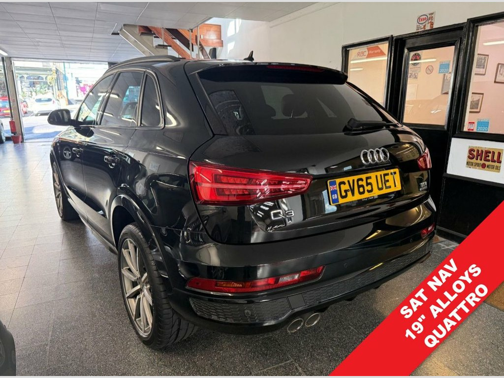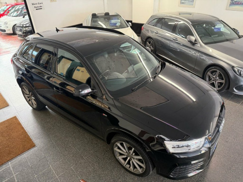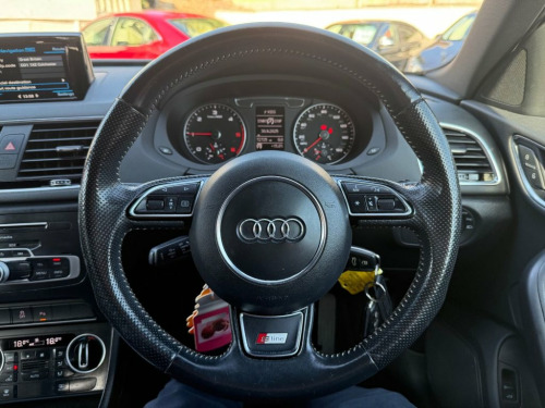 ULEZ Euro 6 Four wheel drive Quattro. This Q3 S Line + Auto is finished in Metallic Mythos Black with Black Leather/Alcantara seats. It is fitted with power steering, remote locking, electric windows, Electric heated power folding mirrors, dual zone climate control, cruise control, front and rear park assist, Sun protection Glass, LED lights, Strobing Indicators, Powered boot lid, Satellite Navigation, Bluetooth, 19" 10 spoke alloy wheels, Space saver spare, DAB, CD, Audi Multimedia SD ports and more. It has had just 3 owners from new. It comes with 2 keys and a full Audi service history done at 3157/10999/19321/37330/43040/53266/63954/68723 and 70652 miles with invoices and a print out. The current Mot runs till May 2026. We will supply it with 12 month Advisory Free MOT and 6 months Insured RAC Warranty. Finance available from 9.9% APR subject to status and extended warranties are available. This Q3 is exceptional throughout and has the benefits of a high seating position. 12V Power Socket - Rear Centre Console, 19in Alloy Wheels - 10-Spoke Design in M, 19in Alloy Wheels - 5-Segment-Spoke Desi, 6.5in Display Screen, 7-Digit Postcode Recognition, ABS - Anti-Lock Braking System, Airbags - Driver, Airbags - Front Passenger, Airbags - Front Side, Airbags - Head System, Alarm - Thatcham Category 1, All Weather LED Headlights, AMI - Audi Music Interface, Anti Theft Locking Wheel Bolts, ASR - Anti Slip Regulation, Audi Drive Select, Audi Parking System Plus, Auto-Dimming Rear-View Mirror, Automatic Wipers with Rain Sensor, Brake Lights - LED, Bumpers - Front and Rear - S Line Design, Car Jack, Cloth Headlining in Black, Comfort Package, Concert Radio - MP3/CD Player,