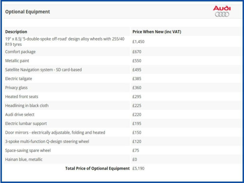 . 19in Alloy Wheels - 5-Double-Spoke Off-Road Design, 3-Spoke Multi-Function Q-Design Steering Wheel, 4-Way Electric Lumbar Support for Front Seats, 6.5in Display Screen, 8 Passive Speakers, AMI - Audi Music Interface, All Weather LED Headlights, Aluminium Roof Rails, Aluminium Window Trims, Anti Theft Locking Wheel Bolts, Audi Drive Select, Audi Parking System Plus, Auto-Dimming Rear-View Mirror, Bluetooth Interface, Body-Coloured Door Mirrors - Electrically Adjustable and Heated with Integrated LED Indicator Signals, Bright Moulding, Chrome-Plated Trims for Exhaust System, Cloth Headlining and Dashboard in Black, Concert Radio, Cruise Control, DAB Digital Radio, Door Mirrors - Heated-Electrically Adjustable-Folding, Door Sill Trims with S Line Logo, Driver - Front Passenger - Front Side and Head Airbag System, Drivers Information System - DIS, Dual-Zone Electronic Climate Control, Dynamic Suspension, ESP - Electronic Stability Programme, Efficiency Program in the Drivers Information System - DIS, Electric Windows - Front and Rear, Electromechanical Parking Brake, Electromechanical Power Steering - Speed-Sensitive Provides a Precise Steering Feel at High Speeds and Excellent Assistance when Parking., First Aid Kit, Floor Mats - Front and Rear in Velour, Fog Lights - Chrome Surrounds, Front Centre Armrest, Front Passenger Airbag Deactivation Switch, Front Sports Seats, Front and Rear Fog Lights, Full Body-Colour Finish on Bumpers-Wheel Arch Trims-Lower Door Trims, Gear Knob - Perforated Leather, Headlight Washer System, Heated Windscreen Washer Jets, ISOFIX Child Seat Mounting, Inlays - Matt Brushed Aluminium, LED Tail Lights, Light and Rain Sensor, Power Operated Tailgate, Privacy Glass, Remote Central Locking, Reversible Luggage Compartment Floor, S Line Badges on Front Wings, S Line Body Styling, S Line Radiator Grille with Horizontal Struts in High-Gloss Black, Satellite Navigation System - SD Card Based, Seat Belt Monitoring, Seats - Split Folding Rear Backrest, Smoking Package, Space Saver Spare Wheel, Stainless Steel Loading Sill Protector, Steering Wheel - Height and Reach Adjustable, Thatcham Category 1 Alarm and Immobiliser, Tool Kit and Car Jack, Towbar Preparation, Tyre Pressure Loss Indicator, Voice Control System, Warning Triangle, Washer Fluid Level Indicator, Windscreen with Sunband, Hainan Blue.
