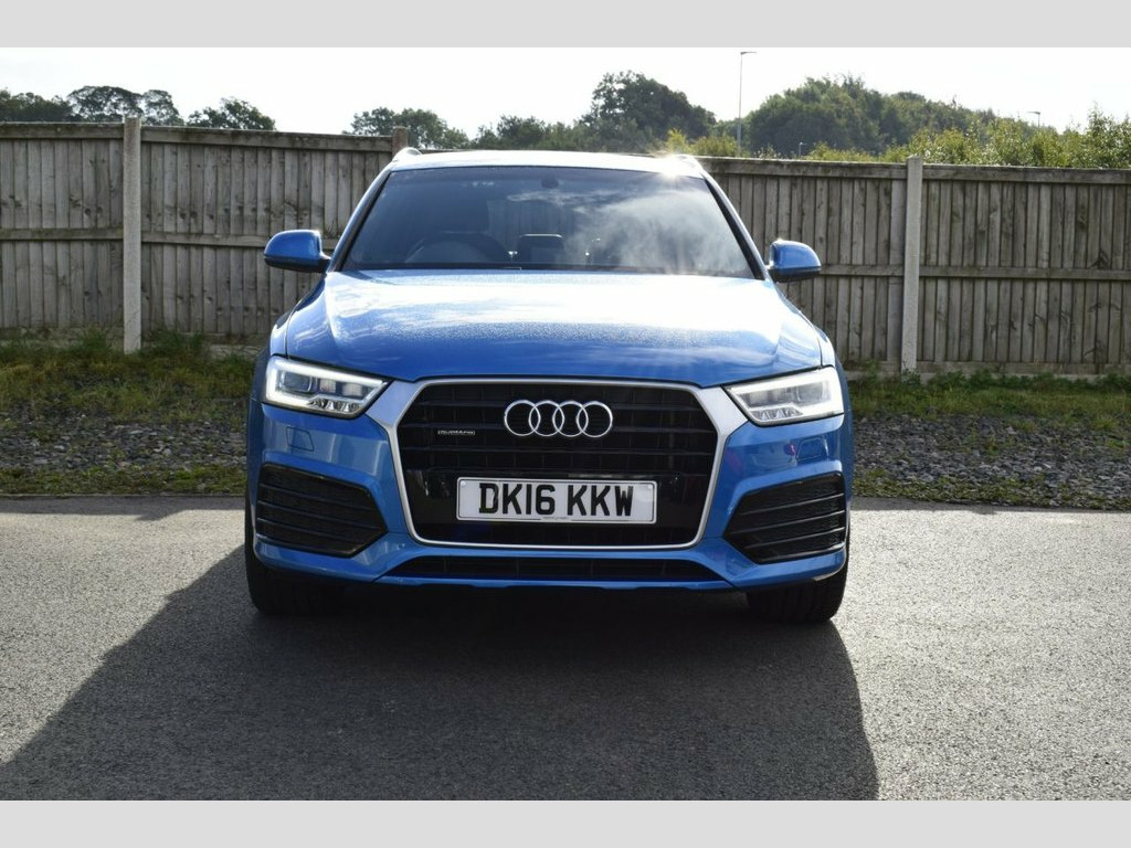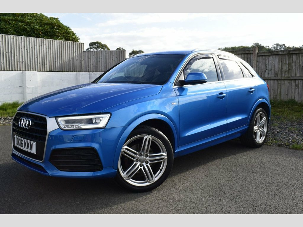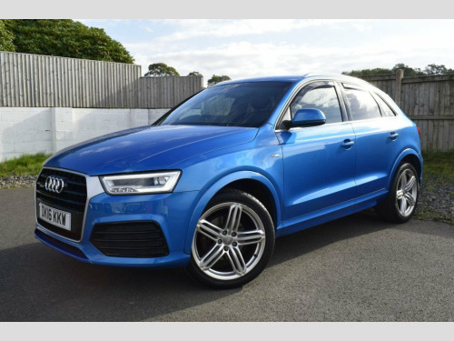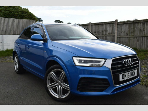 2016 16 Audi Q3 2.0 tdi S-Line Edition Quattro 5-door 184 bhp  finished in  hainan blue metallic which is complimented by a black cloth / leather upholstery. This is superb car throughout and it drives as good as it looks ! Standard specification includes COLOUR SATELLITE NAVIGATION to help plan your route to the chosen destination easily, BLUETOOTH CONNECTIVITY which enables you to make & receive calls safely & legally, DAB radio, 18 inch  multi-spoke ALLOY WHEELS, ELECTRIC TAILGATE, DUAL ZONE CLIMATE CONTROL which blows cold air & helps prevent the windows from steaming up, CRUISE CONTROL which helps fuel economy when used & allows you to set the speed to keep within the legal limit, electric windows, electric heated & folding mirrors, leather 3-spoke multi-function steering wheel, space saver spare wheel & it has two sets of remote key fobs. Part exchange welcome & we offer tailor made finance packages to suit individual needs. To arrange a viewing / test drive, please call 01768-840111 or 01228-599900.  Hainan Blue, 12V Power Socket - Rear Centre Console, 19in Alloy Wheels - 5-Segment-Spoke Desi, 6.5in Display Screen, 7-Digit Postcode Recognition, ABS - Anti-Lock Braking System, AMI - Audi Music Interface, ASR - Anti Slip Regulation, Airbags - Driver, Airbags - Front Passenger, Airbags - Front Side, Airbags - Head System, Alarm - Thatcham Category 1, All Weather LED Headlights, Anti Theft Locking Wheel Bolts, Audi Drive Select, Audi Parking System Plus, Auto-Dimming Rear-View Mirror, Automatic Wipers with Rain Sensor, Brake Lights - LED, Bumpers - Front and Rear - S Line Design, Car Jack, Cloth Headlining in Black, Comfort Package, Concert Radio - MP3/CD Player, Cruise Control, DAB Digital