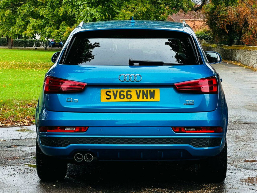 . 19in Alloy Wheels - 5-Double-Spoke Off-Road Design, 3-Spoke Multi-Function Q-Design Steering Wheel, 4-Way Electric Lumbar Support for Front Seats, 6.5in Display Screen, 8 Passive Speakers, AMI - Audi Music Interface, All Weather LED Headlights, Aluminium Roof Rails, Aluminium Window Trims, Anti Theft Locking Wheel Bolts, Audi Drive Select, Audi Parking System Plus, Auto-Dimming Rear-View Mirror, Bluetooth Interface, Body-Coloured Door Mirrors - Electrically Adjustable and Heated with Integrated LED Indicator Signals, Bright Moulding, Chrome-Plated Trims for Exhaust System, Cloth Headlining and Dashboard in Black, Concert Radio, Cruise Control, DAB Digital Radio, Door Mirrors - Heated-Electrically Adjustable-Folding, Door Sill Trims with S Line Logo, Driver - Front Passenger - Front Side and Head Airbag System, Drivers Information System - DIS, Dual-Zone Electronic Climate Control, Dynamic Suspension, ESP - Electronic Stability Programme, Efficiency Program in the Drivers Information System - DIS, Electric Windows - Front and Rear, Electromechanical Parking Brake, Electromechanical Power Steering - Speed-Sensitive Provides a Precise Steering Feel at High Speeds and Excellent Assistance when Parking., First Aid Kit, Floor Mats - Front and Rear in Velour, Fog Lights - Chrome Surrounds, Front Centre Armrest, Front Passenger Airbag Deactivation Switch, Front Sports Seats, Front and Rear Fog Lights, Full Body-Colour Finish on Bumpers-Wheel Arch Trims-Lower Door Trims, Gear Knob - Perforated Leather, Headlight Washer System, Heated Windscreen Washer Jets, ISOFIX Child Seat Mounting, Inlays - Matt Brushed Aluminium, LED Tail Lights, Light and Rain Sensor, Power Operated Tailgate, Privacy Glass, Remote Central Locking, Reversible Luggage Compartment Floor, S Line Badges on Front Wings, S Line Body Styling, S Line Radiator Grille with Horizontal Struts in High-Gloss Black, Satellite Navigation System - SD Card Based, Seat Belt Monitoring, Seats - Split Folding Rear Backrest, Smoking Package, Space Saver Spare Wheel, Stainless Steel Loading Sill Protector, Steering Wheel - Height and Reach Adjustable, Thatcham Category 1 Alarm and Immobiliser, Tool Kit and Car Jack, Towbar Preparation, Tyre Pressure Loss Indicator, Voice Control System, Warning Triangle, Washer Fluid Level Indicator, Windscreen with Sunband, Flat-Bottomed Q3 3-Spoke Perforated Leather-Trimmed Multi-Function Steering Wheel, Hainan Blue, Perforated Alcantara-Leather - Sports Seats - S Line Embossed - Black, Fine Nappa Leather - Sports Seats - S Line Embossed - Black, Comfort Package Plus, 19in Alloy Wheels - 10-Spoke Design in Matt Titanium Finish.