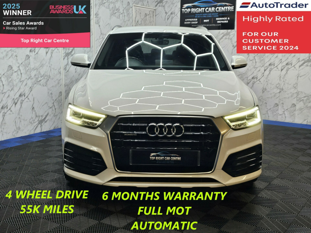 *** NIL DEPOSIT FINANCE AVAILABLE ***. 6 MONTHS WARRANTY AND BREAKDOWN COVER WITH THIS CAR. Automatic and 4 wheel drive transmission. Low mileage 55k miles. 2 former keeper. This stunning example has been sourced directly from its Previous Private Owner. Every now and again, a car comes into stock at Top Right Car Centre, that you cannot help but fall in love with. Top Spec S line plus has massive centre screen SATNAV, part leather part alkantara interior with heated seats, daytime running LED lights, auto folding electric side mirrors, electric tail gate, 4 driving modes. Cruise control. Stunning clean car in White colour. Great comfortable family car. Clean body work and clean interior. Bullet fast response. Checked by our engineers. Professionally detailed. Good reliable runner. Price checked. We've just completed a full pre delivery inspection on the car to give you complete piece of mind. We just done the fresh service. FULL SERVICE HISTORY. MOT 04 JAN 2027 NO ADVISORIES. Central locking key. Digital Dual Climate control. Stunning clean car inside out. All Electric windows. Smooth gear box. Clean alloy wheels. Excellent condition tyres. Spare wheel. Multimedia has Bluetooth CD DABRadio Mp3 SD CARD. Run with no fault strong reliable engine. Good fuel economy. First to see will buy it this well looked after car. cat N. p/x welcome. We do price our cars/van as competitively as possible and because of this we sell cars/vans very quickly. BE QUICK! MISS IT - MISS OUT. With so much variety, quality and highly rated award winner 2024 and 2025, it is no wonder we are super busy all the time.Why Buy From Top Right Car Centre?Thoroughly Inspected Cars. All our vehicles are quality-checked and HPi verified, giving you peace of mind with every purchase.Multi Award-Winning Family Business. As a trusted family-run business, we have earned awards for our customer service and expertise.Hand-Picked, Quality Cars. We carefully select only the finest cars with full service histories, so you can drive away with confidence.Test Driven for Assurance. Each car is personally test-driven by our team, ensuring it meets our high standards.Delivery Service available. 5'' colour display screen, audi drive select, cruise control, low washer fluid indicator, mmi - multi media interface control system, on board computer, pas, remote electric boot opening/closing, service interval indicator, voice control system, diesel particulate filter, audi music interface, dab digital radio module, acoustic windscreen, aluminium window surround, auto dimming rear view mirror, body colour door mirrors, body coloured bumpers, chrome exhaust tailpipe, chrome fog light surround, chrome grille, coming home function, door mirror integrated indicators, front and rear electric windows, front fog lights, heated windscreen washer jets, high beam assist, led daytime running lights, led headlights with headlight washers, light and rain sensor for auto activation of lights and windscreen wipers, loading sill protector in stainless steel, privacy glass, rear wiper, s line body styling, sunband for windscreen, towbar preparation, 12v socket in rear centre console, 3 spoke multi-function q design steering wheel with paddle shift, aluminium door sill trims, black cloth headlining, dual zone climate control, electric front lumbar adjustment, front and rear headrests, front and rear velour floor mats, front centre armrest with storage compartment and angle adjustment, front sports seats, height/reach adjust steering wheel, isofix on front passenger and rear outer seats, jack and tool kit, perforated leather gearknob, retractable luggage cover, split fold rear seat, under floor storage in luggage area, 3x3 point rear seatbelts, abs+electronic brake force distribution, curtain airbags, driver and passenger airbags, driver and passenger side airbags, edl + asr, electrically operated child locks on rear doors, electromechanical parking brake, esp, first aid kit, front passenger airbag deactivation, seatbelt warning light, tyre pressure monitoring system, warning triangle, locking wheel bolts, remote central locking, thatcham category 1 alarm + immobiliser, matt brushed aluminium fascia and door trim inlays, 19'' Alloys