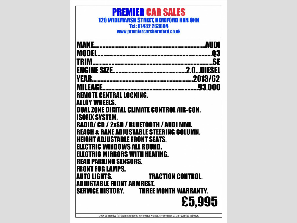 A nicely maintained example of this popular SUV with a nice specification and offering excellent economy. Remote Central Locking with two keys present. Alloy Wheels. Rear Parking Sensors. Front Fog Lamps. ISOFIX. Electric Windows all round. Electric Mirrors with heating. Dual Zone Digital Climate Control Air Conditioning. Six Speed Transmission. Auto Lights. Reach & Rake Adjustable Steering Column. Radio/CD with 2xSD Card Readers/Bluetooth Connection/AUDI MMI Interface. Adjustable Front Armrest. Seat Height Adjustments. Traction Control System. We are at 120 Widemarsh Street, Hereford, HR4 9HN. Our website with full details is : www.premiercarshereford.co.uk, All of our vehicles are supplied with a three month warranty and long MOT. Card payments are welcomed and part exchanges are gladly considered. Low rate finance arranged, subject to status. Please call us on 01432263804 or 07831564655 for more information.