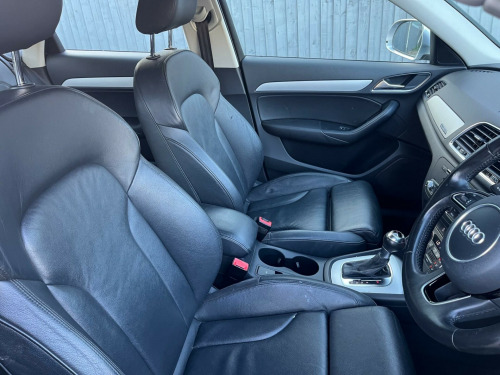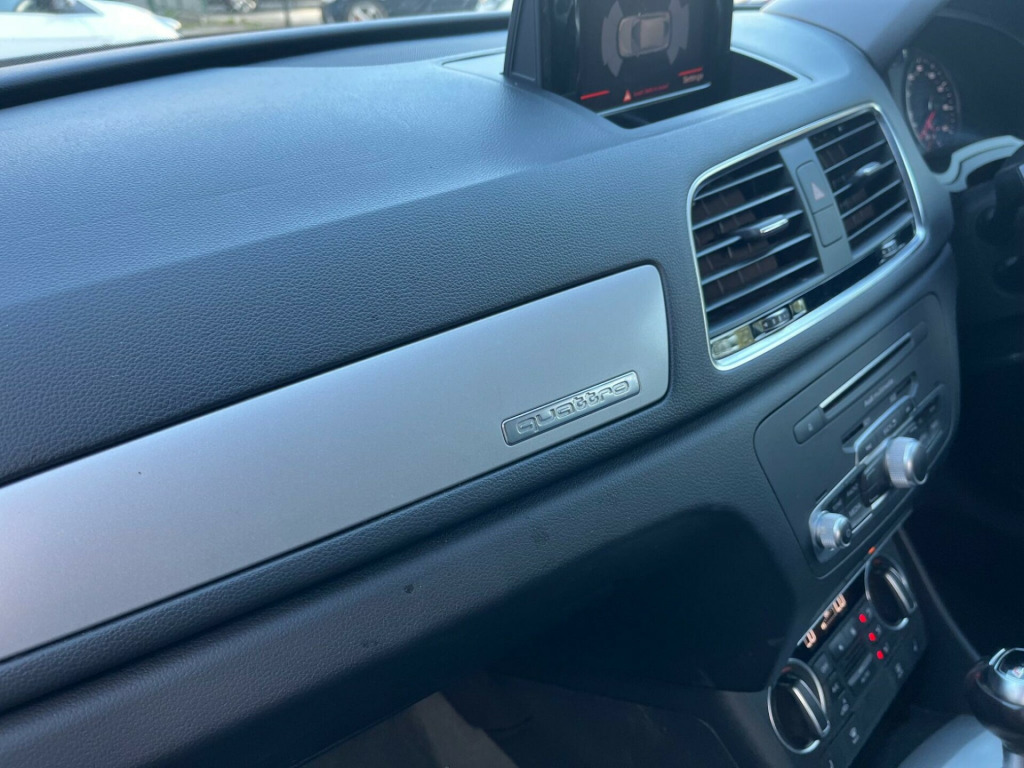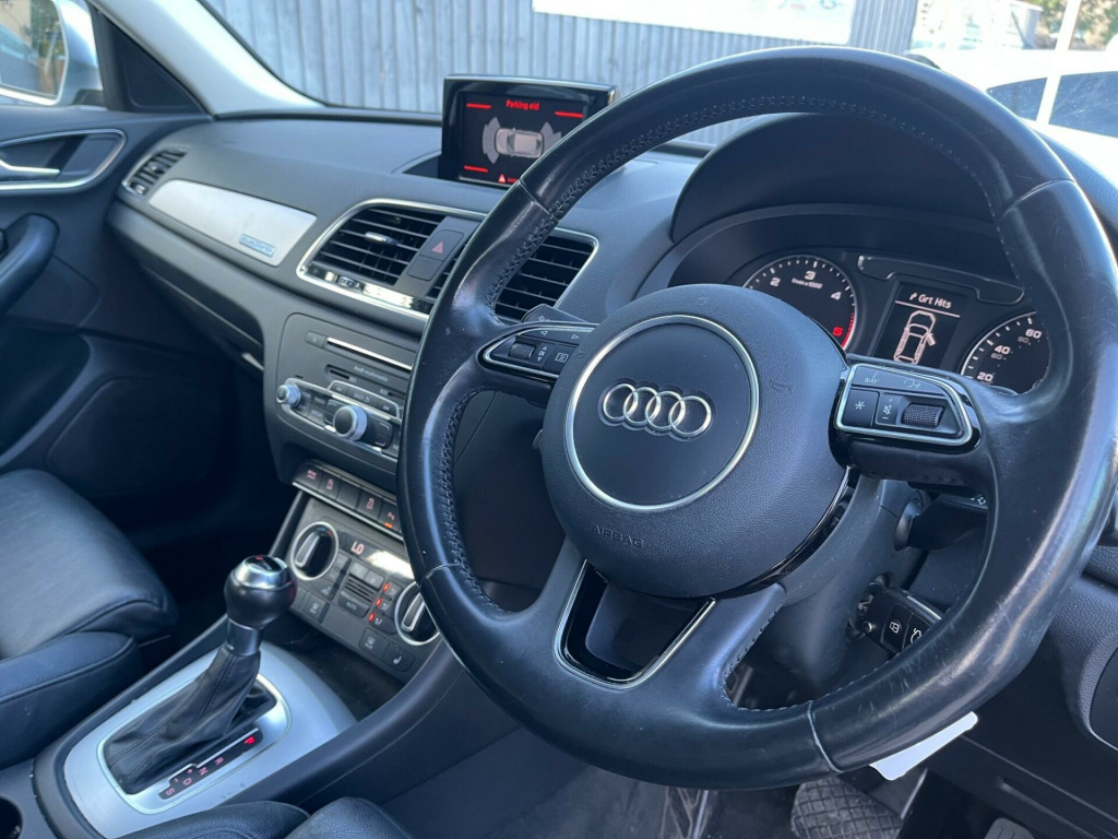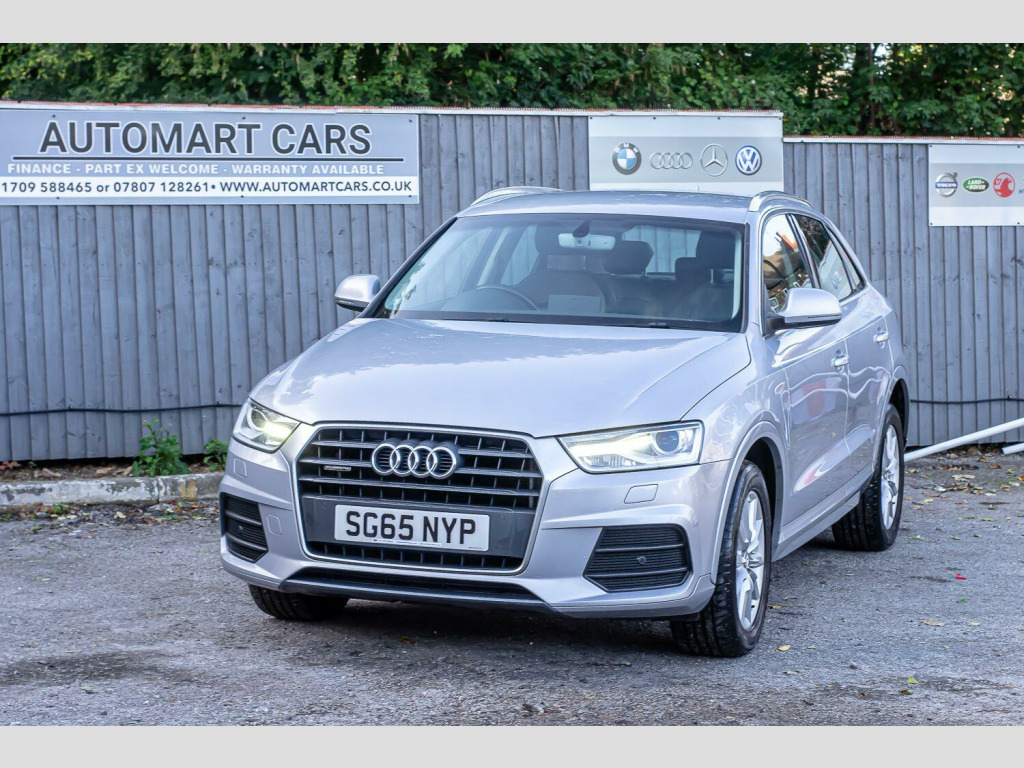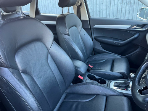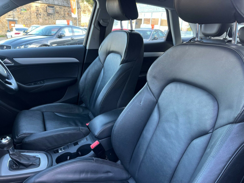 Benefit from a 3 month warranty on this Audi Q3 TDI SE, registered in 2015, offering peace of mind with its partial service history. This Four Wheel Drive model is equipped with a 2.0L Diesel Engine and meets Euro 6 emissions standards. Inside, you'll find comfortable Milano Leather Sports Seats in Black, complemented by heated front seats for those colder journeys. The SE trim also includes the Comfort Package, featuring the Audi Parking System Plus with Park Assist and front sensors, making parking a breeze.Experience impressive performance with this Audi Q3, capable of accelerating from 0 to 60mph in just 7.6 seconds, a testament to its powerful 2.0L engine. This vehicle also boasts an excellent fuel economy of 54 mpg, indicating it is more efficient than many similar cars. The Advanced Key system, providing keyless entry, adds a touch of modern convenience to your driving experience.. 12V Power Socket - Rear Centre Console, 17in Alloy Wheels - 7J 5-Spoke Y Design, 6.5in Display Screen, ABS - Anti-Lock Braking System, AMI - Audi Music Interface, ASR - Anti Slip Regulation, Airbags - Driver, Airbags - Front Passenger, Airbags - Front Side, Airbags - Head System, Alarm - Thatcham Category 1, Aluminium-Effect Door Mirror Housings, Anthracite Metallic Finish on Bumpers-Wheel Arch Trims-Lower Door Trims, Anti Theft Locking Wheel Bolts, Audi Drive Select, Automatic Wipers with Rain Sensor, Brake Lights - LED, Car Jack, Cloth Headlining in Lunar Silver, Concert Radio - MP3/CD Player, DAB Digital Radio, Door Mirrors - Body Coloured with Integrated LED Indicators, Door Mirrors - Electrically Adjustable and Heated, Door Sill Trims with Aluminium Inlay, Drivers Information System - DIS, Dual-Zone Electronic Climate Control, Dynamic Suspension, EBD - Electronic Brakeforce Distribution, EDL - Electronic Differential Lock, ESP - Electronic Stability Programme, Electric Windows - Front and Rear, Electrically Adjustable 4-Way Lumbar Support, Electromechanical Parking Brake, Electromechanical Power Steering, Exhaust Tailpipe - Chrome Plated, First Aid Kit, Floor Mats - Front and Rear in Velour, Folding Storage Compartment in Front Centre Armrest, Front Centre Armrest - Adjustable, Front Fog Lights, Front Passenger Airbag Deactivation Switch, Front Sports Seats, Full Paint Finish, Headlights - Automatic Activation, Headlights - Automatic Adjustment, Headlights - Automatic Dynamic Range Control, Headlights - Bi-Xenon Plus, Headlights - Coming-Leaving Home Function, Headlights - Electric Range Control, Heated Windscreen Washer Jets, ISOFIX Child Seat Mounting for Front Passenger, ISOFIX Child Seat Preparation for Rear Seats with Top Tether, Inlays - Micrometallic Silver, LED Daytime Running Lights, LED Rear Indicators, LED Rear Lights, Manual Front Seat Adjustment, Mobile Telephone Preparation - Bluetooth Interface, Preparation for SD Card-Based Navigation System, Rear Parking Sensors, Remote Central Locking with 2 Fold Away Keys, Reversible Luggage Compartment Floor, Roof Rails - Aluminium, SDHC Card Reader x2, Seat Belt Reminder, Secondary Collision Brake Assist, Smoking Package, Space Saver Spare Wheel, Speakers x8, Split-Folding Rear Seats, Stainless Steel Loading Sill Protector, Steering Wheel - 3-Spoke Leather-MultiFunction-Shift Paddles-Q-Design, Steering Wheel - Gear-Shift Paddles, Steering Wheel - Height and Reach Adjustable, Steering Wheel - Multi-function, Sunband for Windscreen, TP Memo - Automatically Saves Traffic News, Tool Kit, Towbar Preparation, Tyre Pressure Monitoring System, Voice Control - Telephone, Warning Triangle, Washer Fluid Level Indicator, Window Surrounds - Aluminium, Audi Parking System Plus with Park Assist, Audi Sound System, Colour Drivers Information System - DIS, Cruise Control, Advanced Key, Audi Hill Hold Assist, Rear Side Airbags, 17in Alloy Wheels - 10-Spoke Design, Alcantara-Leather - Sport Seats - Black, Audi Exclusive Gear Lever - Fine Grain Ash - Nougat, Comfort Package, Heated Front Seats, Milano Leather - Sports Seats - Black, Technology Package. Part service history