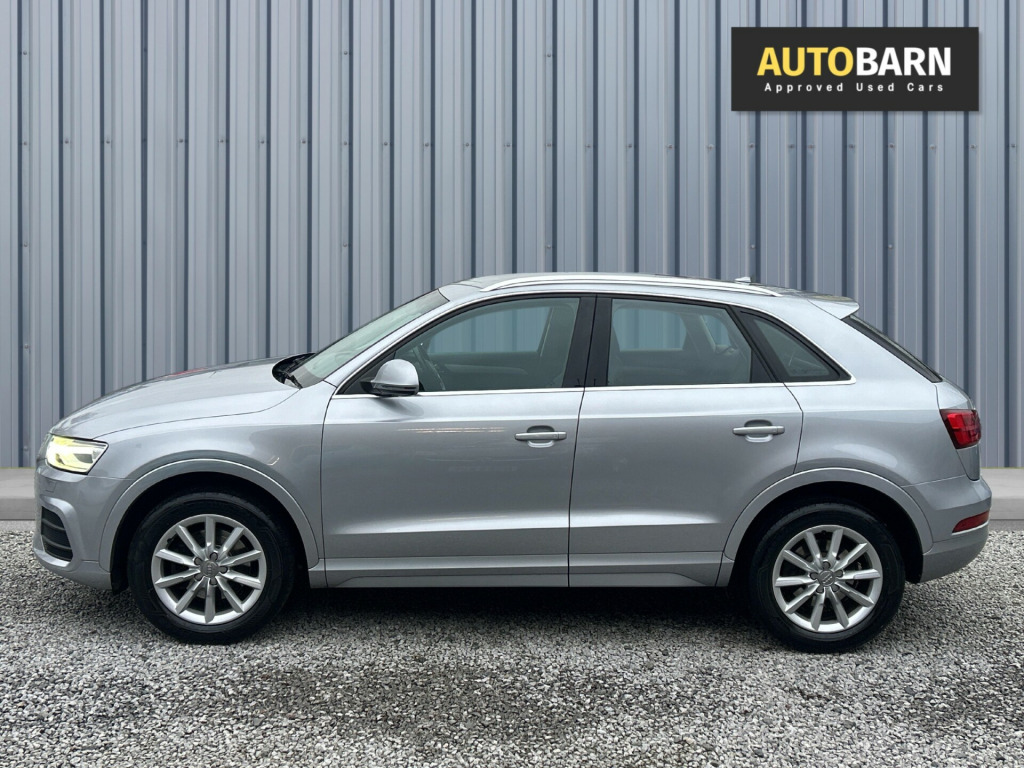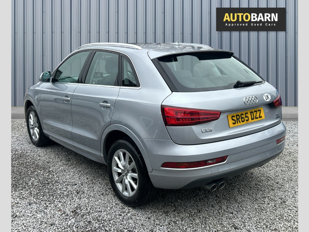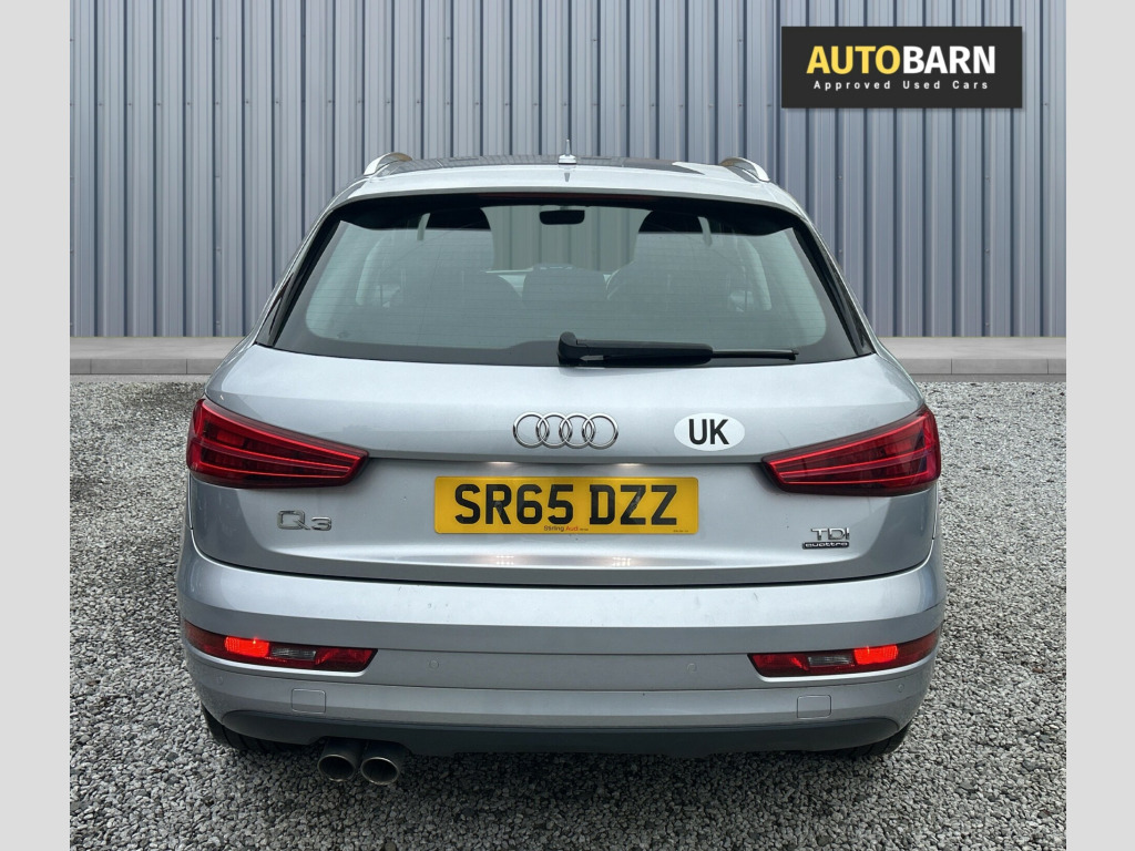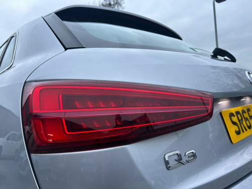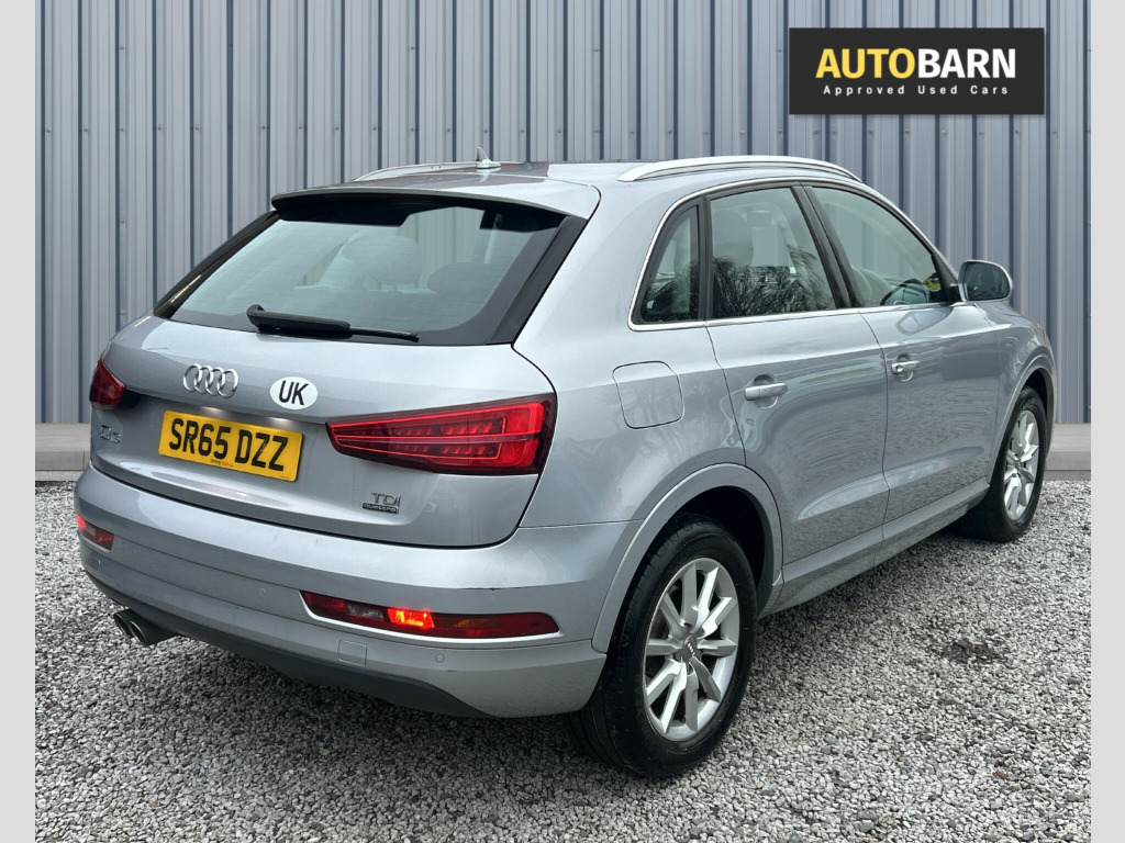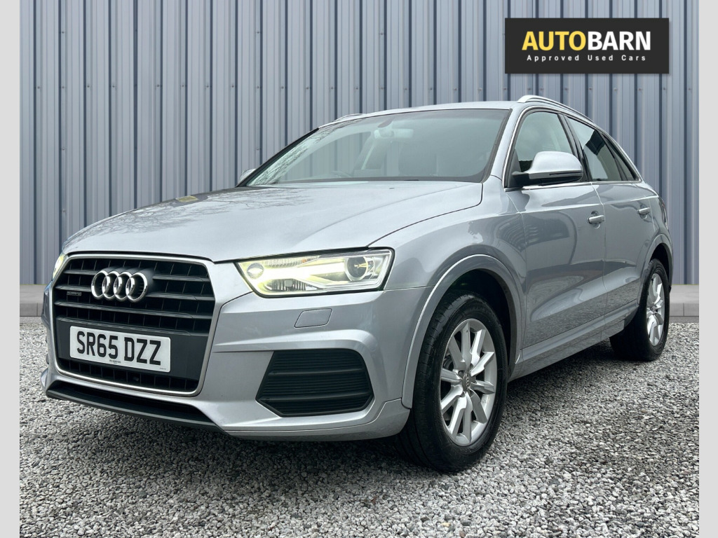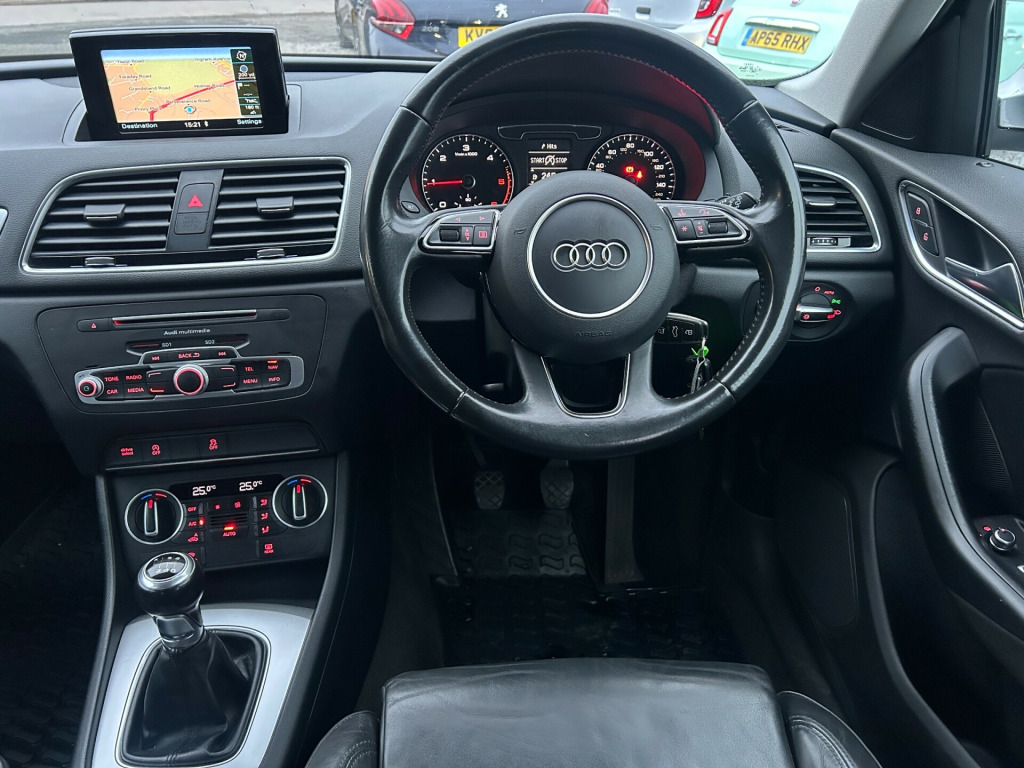 This 2015 Audi Q3 2.0 TDI SE SUV with 81,000 miles is a reliable and spacious diesel vehicle, perfect for families or long journeys with its 5 seats and 5 doors. This ULEZ compliant SUV is equipped with a manual quattro Euro 6 (s/s) (150 ps) engine, ensuring a smooth and powerful drive. The car comes with a range of features including Full leather upholstery, 6.5in Display Screen with Satellite Navigation, AMI - Audi Music Interface, Concert Radio, and DAB Digital Radio. With its sturdy build and practical design, this Audi Q3 is the ideal choice for those seeking a versatile and efficient vehicle. v power socket - rear centre console, 6.5in display screen, ami - audi music interface, concert radio - mp3/cd player, dab digital radio, mobile telephone preparation - bluetooth interface, preparation for sd card-based navigation system, sdhc card reader x2, speakers x8, towbar preparation, 17in alloy wheels - 7j 5-spoke y design, anti theft locking wheel bolts, brake lights - led, door mirrors - body coloured with integrated led indicators, door mirrors - electrically adjustable and heated, electric windows - front and rear, exhaust tailpipe - chrome plated, full body-colour finish on bumpers-wheel arch trims-lower door trims, full paint finish, heated windscreen washer jets, led rear indicators, roof rails - aluminium, space saver spare wheel, sunband for windscreen, window surrounds - aluminium, abs - anti-lock braking system, asr - anti slip regulation, airbags - driver, airbags - front passenger, airbags - front side, airbags - head system, alarm - thatcham category 1, ebd - electronic brakeforce distribution, esp - electronic stability programme, electromechanical parking brake, first aid kit, front passenger airbag deactivation switch, isofix child seat mounting for front passenger, isofix child seat preparation for rear seats with top tether, remote central locking with 2 fold away keys, seat belt reminder, secondary collision brake assist, warning triangle, audi drive select, drivers information system - dis, dynamic suspension, edl - electronic differential lock, electromechanical power steering, rear parking sensors, tyre pressure monitoring system, voice control - telephone, washer fluid level indicator, automatic wipers with rain sensor, car jack, cloth headlining in lunar silver, door sill trims with aluminium inlay, dual-zone electronic climate control, electrically adjustable 4-way lumbar support, floor mats - front and rear in velour, folding storage compartment in front centre armrest, front centre armrest - adjustable, front sports seats, inlays - micrometallic silver, luggage compartment - cover extendable, manual front seat adjustment, reversible luggage compartment floor, smoking package, split-folding rear seats, stainless steel loading sill protector, steering wheel - 3-spoke leather-multifunction-q-design, steering wheel - height and reach adjustable, steering wheel - multi-function, tp memo - automatically saves traffic news, tool kit, front fog lights, headlights - automatic activation, headlights - automatic adjustment, headlights - automatic dynamic range control, headlights - bi-xenon plus, headlights - coming-leaving home function, headlights - electric range control, led daytime running lights, led rear lights