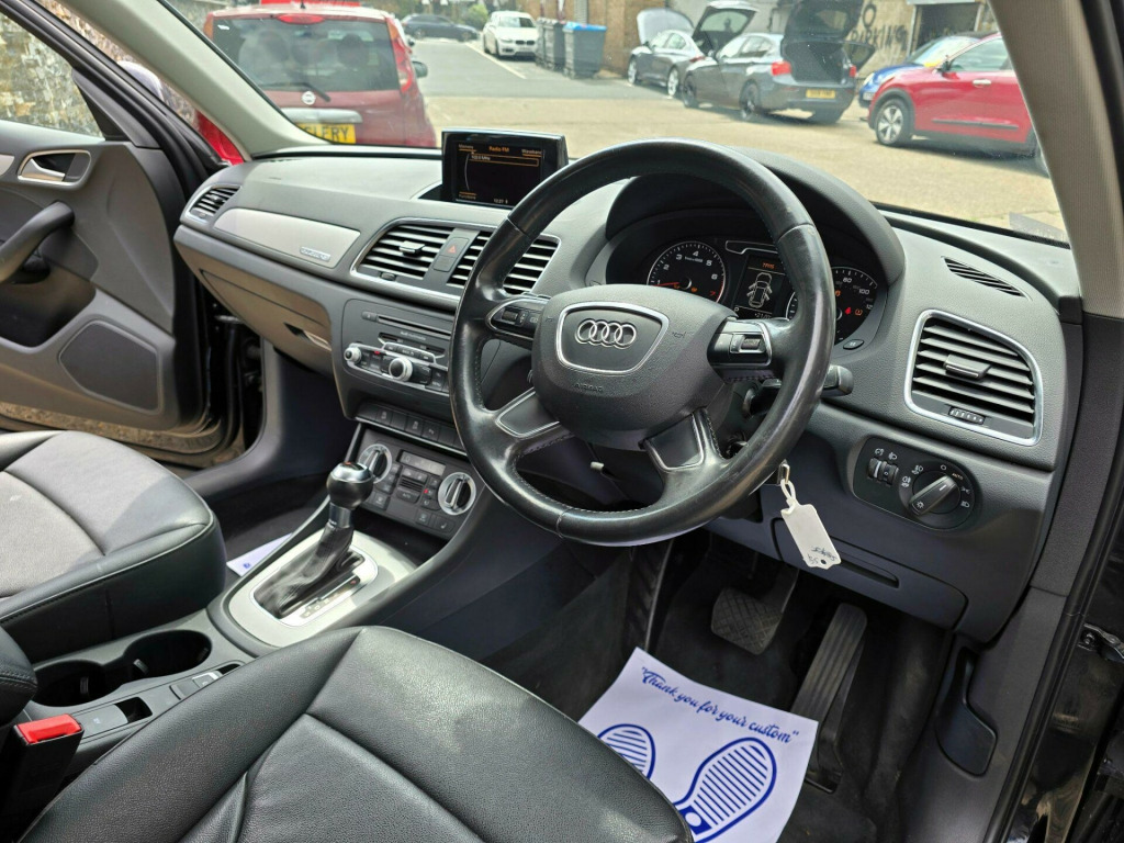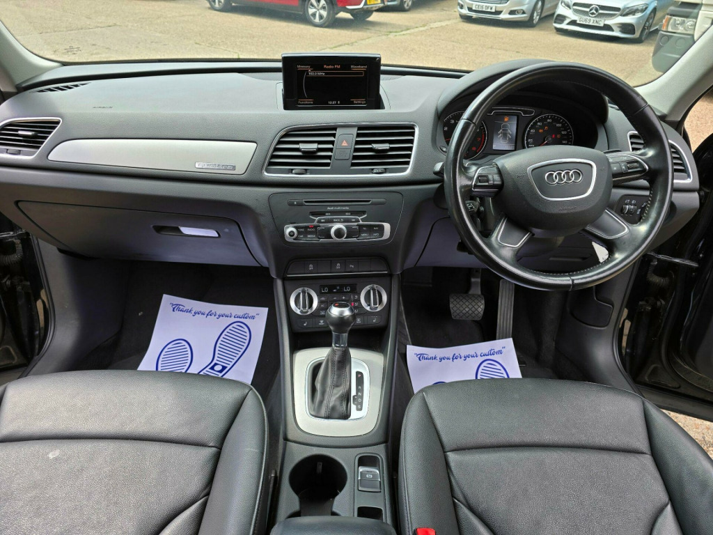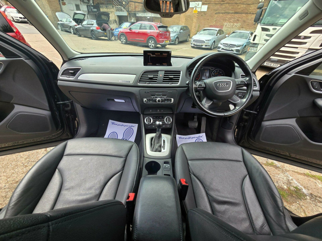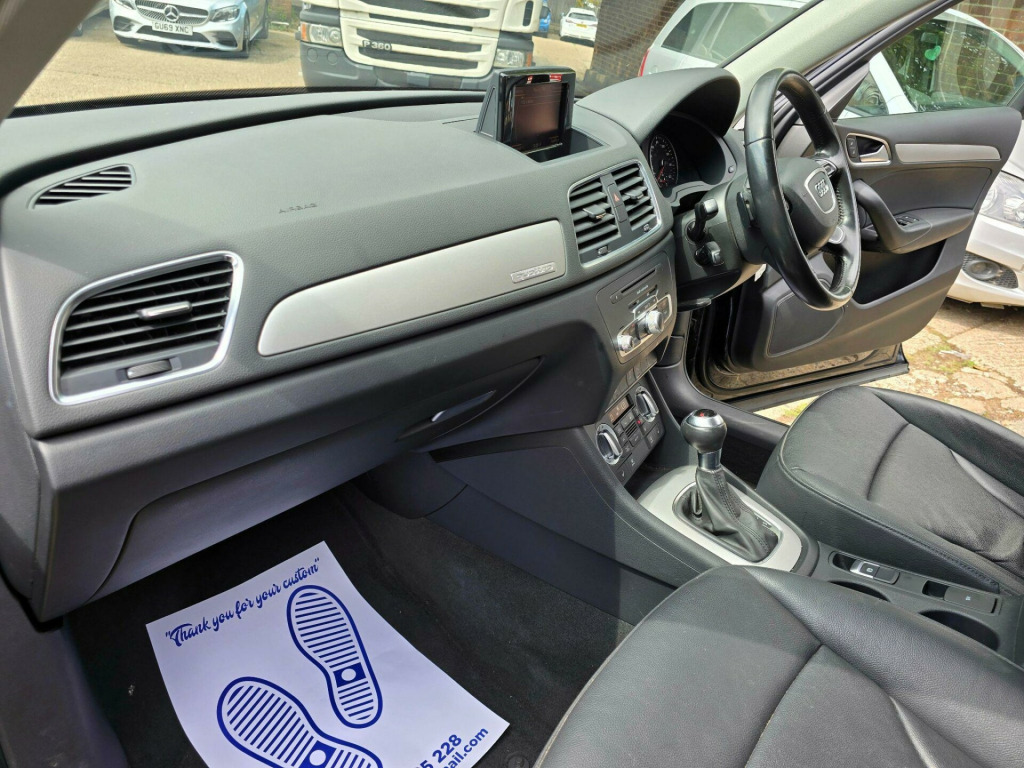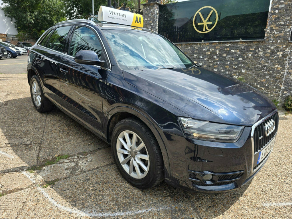 Audi Q3 2.0 TFSI SE S Tronic quattro Euro 5 (s/s) 5dr LD13KXO 2013 (13) 79,819 miles? Petrol ?? Automatic (S Tronic) Blue 1 Owner ? ULEZ CompliantA refined, capable and stylish compact SUV - this Audi Q3 2.0 TFSI SE delivers smooth automatic performance, superb quattro all-wheel drive traction, and the peace of mind of ULEZ compliance. A perfect balance of comfort and confidence for any journey.Why Buy from Chigwell Motors Ltd?We're a trusted, family-run dealership in East London with over 15 years of experience. Every vehicle includes:?? Minimum 6-Month MOT?? Fresh Service & Pre-Sale Inspection?? Warranty Included?? Same-Day Drive Away?? Click & Collect or Nationwide Delivery?? Fixed Price - No Admin Fees?? Finance from 7.9% APR 688-690 Chigwell Road, Woodford Green, Essex IG8 8AH 07392 792466 www.chigwellmotors.co.uk chigwellmotorshotmail.com v power socket, 17in alloy wheels - 10-spoke design, 6.5in display screen, abs - anti-lock braking system, ami - audi music interface, asr - anti slip regulation, acoustic parking system - rear, airbags - driver, airbags - front passenger, airbags - front side, airbags - head system, alarm - thatcham category 1, aluminium roof rails, anthracite metallic finish on bumpers-wheel arch trims-lower door trims, anti theft locking wheel bolts, automatic wipers with rain sensor, car jack, cloth headlining, concert radio - mp3/cd player, daytime running lights, door mirrors - body coloured with integrated led indicators, door mirrors - electrically adjustable and heated, door sill trims with aluminium inlay, drivers information system - dis, dual-zone electronic climate control, dynamic suspension, ebd - electronic brakeforce distribution, edl - electronic differential lock, esp - electronic stability programme, efficiency program in the drivers information system - dis, electric windows - front and rear, electromechanical parking brake, electromechanical power steering, first aid kit, folding storage compartment in front centre armrest, front centre armrest - adjustable, front fog lights, front passenger airbag deactivation switch, front and rear floor mats, glovebox - ventilated, halogen headlights, headlights - automatic adjustment, headlights - coming-leaving home function, headlights - range adjustment, heated windscreen washer jets, isofix child seat mounting for front passenger and rear outer seats, inlays - monometallic platinum, mobile telephone preparation - bluetooth interface, preparation for sd card-based navigation system, rear air vents in rear centre console, remote central locking with 2 fold away keys, sdhc card reader x2, seat belt reminder, seats - drivers manual height adjustment, smoking package, speakers x8, split-folding rear seats, stainless steel loading sill protector, steering wheel - 4-spoke leather trimmed/multifunction/shift paddles, steering wheel - height and reach adjustable, steering wheel - multi-function, sunband for windscreen, tp memo - automatically saves traffic news, tool kit, towbar preparation, tyre mobility system, voice control - telephone, warning triangle, washer fluid level indicator, window surrounds - aluminium