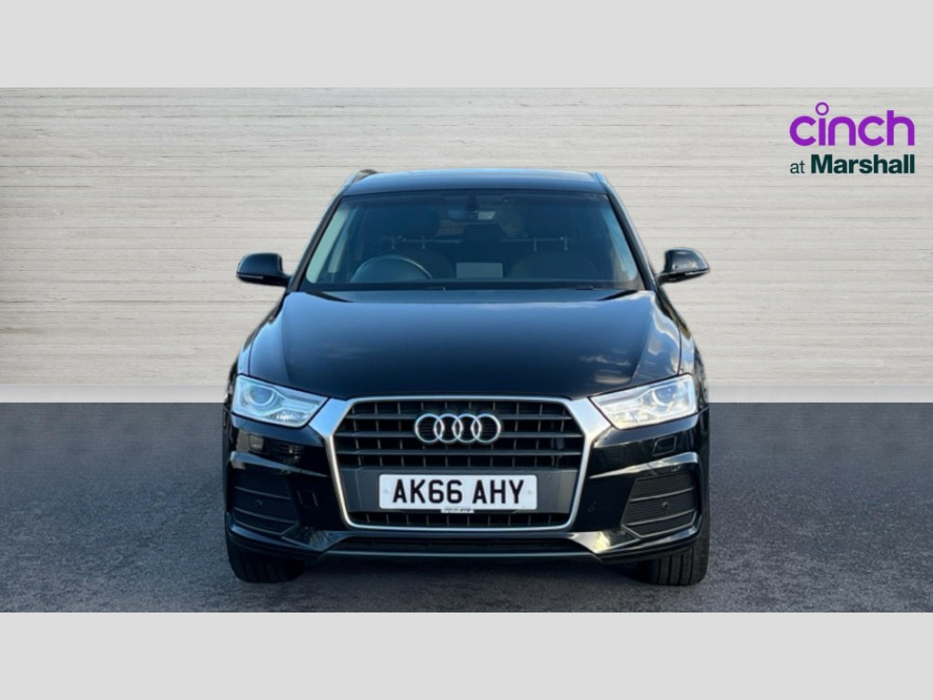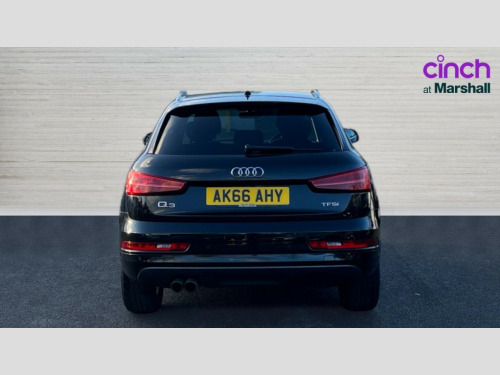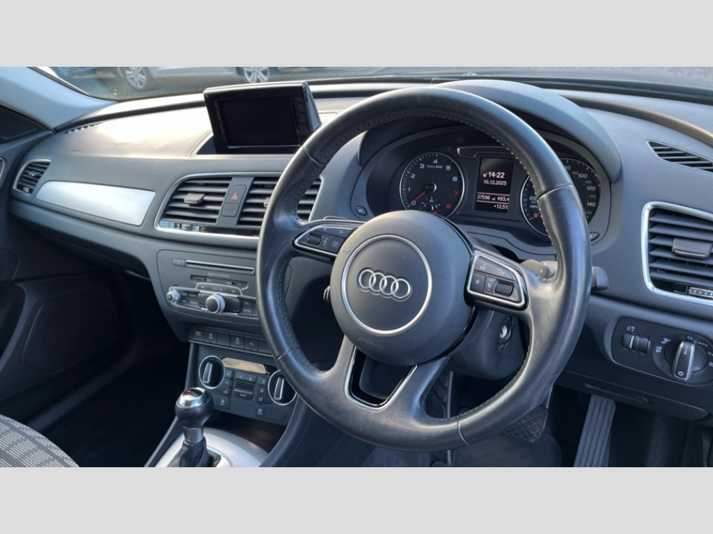 Audi Q3 1.4T FSI SE 5dr S Tronic 6.5" colour display screen, Audi drive select, Low washer fluid indicator, MMI - Multi Media Interface control system, On board computer, PAS, Service interval indicator, Voice control system, Dynamic suspension, Audi music interface, DAB digital radio module, Acoustic windscreen, Aluminium window surround, Body colour door mirrors, Chrome exhaust tailpipe, Coming home function, Door mirror integrated indicators, Front and rear electric windows, Front fog lights, Heated windscreen washer jets, LED daytime running lights, LED rear lights, Light and rain sensor for auto activation of lights and windscreen wipers, Loading sill protector in stainless steel, Rear wiper, Sunband for windscreen, Towbar preparation, 12V socket in rear centre console, Aluminium door sill trims, Dual zone climate control, Electric front lumbar adjustment, Front and rear headrests, Front and rear velour floor mats, Front centre armrest with storage compartment and angle adjustment, Height/reach adjust steering wheel, ISOFIX on front passenger and rear outer seats, Jack and tool kit, Retractable luggage cover, Split fold rear seat, Under floor storage in luggage area, 3x3 point rear seatbelts, ABS+Electronic Brake force Distribution, Curtain airbags, Driver and passenger airbags, Driver and passenger side airbags, EDL + ASR, Electrically operated child locks on rear doors, Electromechanical parking brake, ESP, First aid kit, Front passenger airbag deactivation, Seatbelt warning light, Tyre pressure monitoring system, Warning triangle, Locking wheel bolts, Remote central locking, Thatcham category 1 alarm + immobiliser