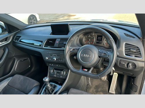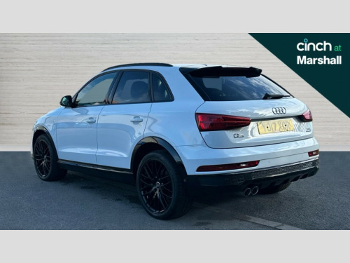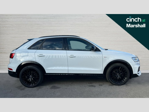 Audi Q3 2.0 TDI Quattro Black Edition 5dr 6.5" colour display screen, Audi drive select, Cruise control, Low washer fluid indicator, MMI - Multi Media Interface control system, On board computer, PAS, Remote electric boot opening/closing, Service interval indicator, Voice control system, Diesel particulate filter, Sports suspension, Audi music interface, BOSE sound system, DAB digital radio module, Acoustic windscreen, Aluminium window surround, Auto dimming rear view mirror, Black exhaust tailpipes, Black high gloss door mirrors, Black roof rails, Body coloured bumpers, Brilliant black rear spoiler, Chrome fog light surround, Chrome grille, Coming home function, Door mirror integrated indicators, Front and rear electric windows, Heated windscreen washer jets, LED daytime running lights, LED headlights with headlight washers, LED rear lights, Light and rain sensor for auto activation of lights and windscreen wipers, Loading sill protector in stainless steel, Privacy glass, Rear wiper, S Line body styling, Sunband for windscreen, Towbar preparation, 12V socket in rear centre console, 3 spoke flat bottom multi-function perforated leather steering wheel with contrast stitching, Aluminium door sill trims, Aluminium gear knob, Aluminium pedals, Black cloth headlining, Dual zone climate control, Electric front lumbar adjustment, Front and rear headrests, Front and rear velour floor mats, Front centre armrest with storage compartment and angle adjustment, Front sports seats, Height/reach adjust steering wheel, ISOFIX on front passenger and rear outer seats, Jack and tool kit, Retractable luggage cover, Reversible boot floor, Split fold rear seat, Under floor storage in luggage area, Audi Exclusive black styling pack - Q3, LED interior light pack - Q3, 3x3 point rear seatbelts, ABS+Electronic Brake force Distribution, Curtain airbags, Driver and passenger airbags, Driver and passenger side airbags, EDL + ASR, Electrically operated child locks on rear doors, Electromechanical parking brake, ESP, First aid kit, Front passenger airbag deactivation, Seatbelt warning light, Tyre pressure monitoring system, Warning triangle, Locking wheel bolts, Remote central locking, Thatcham category 1 alarm + immobiliser, Piano black finish inlay, Space saver spare wheel