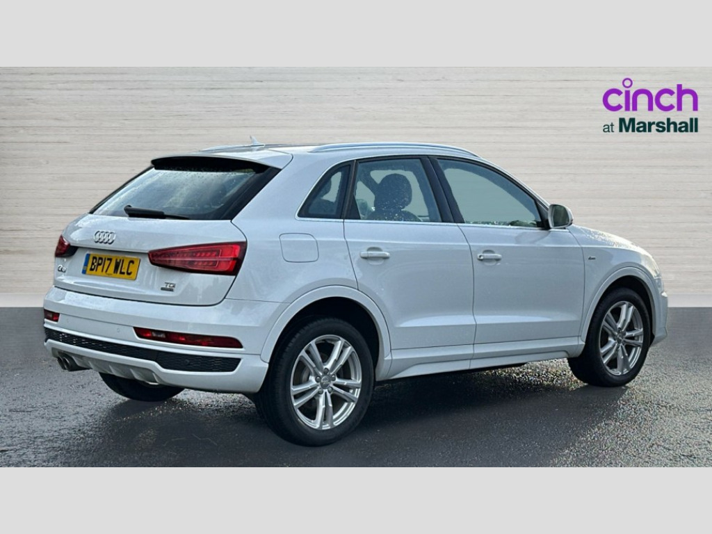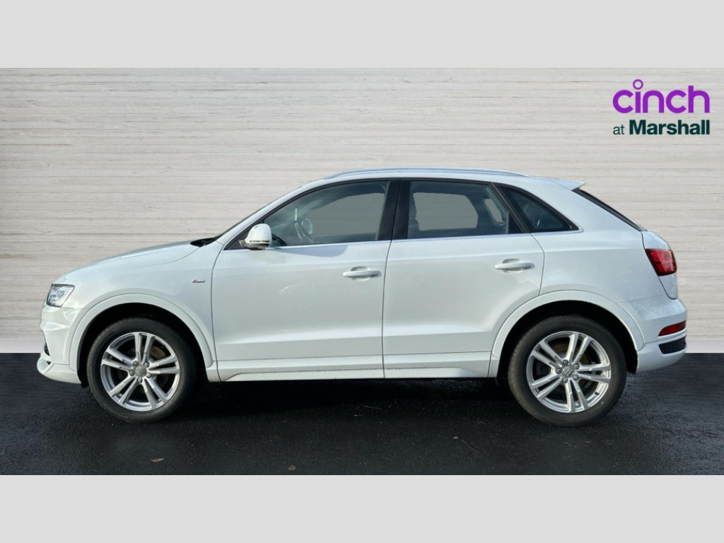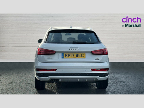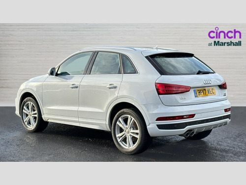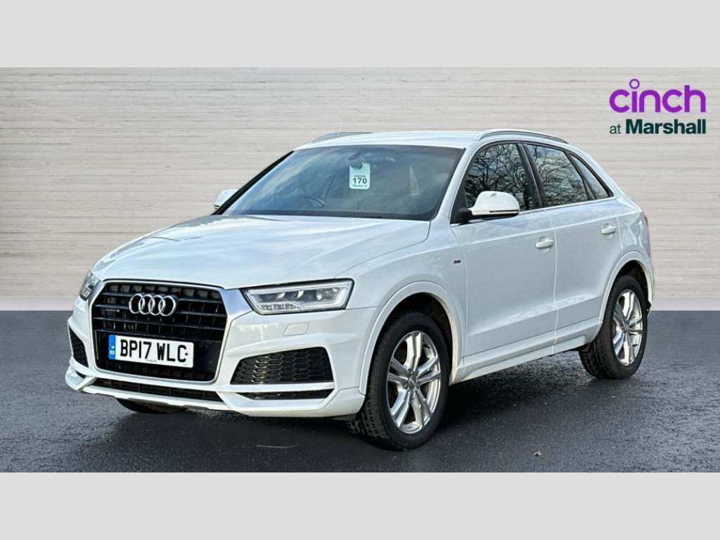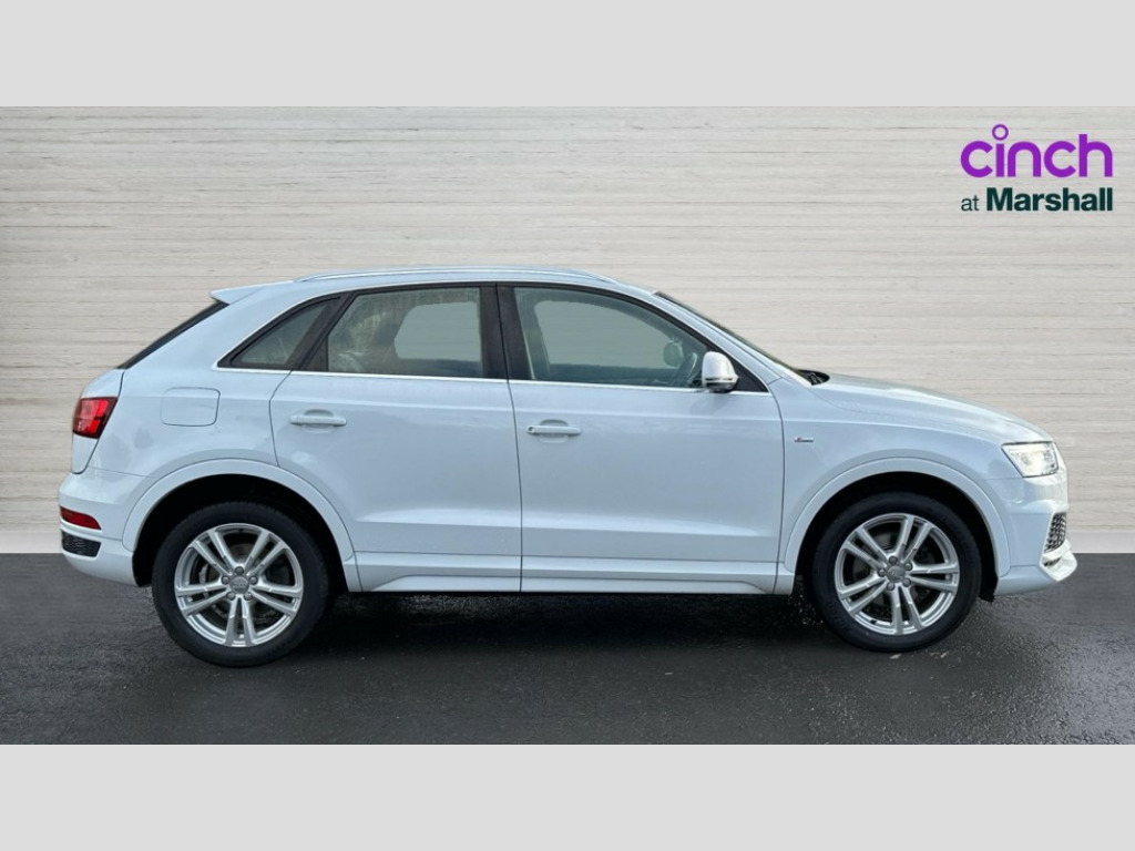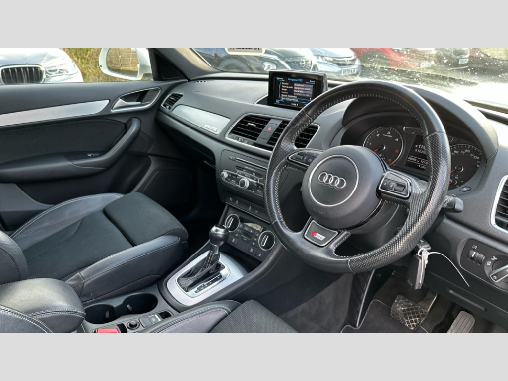 Audi Q3 2.0 TDI Quattro S Line Edition 5dr S Tronic 6.5" colour display screen, Audi drive select, Cruise control, Low washer fluid indicator, MMI - Multi Media Interface control system, On board computer, PAS, Remote electric boot opening/closing, Service interval indicator, Voice control system, Diesel particulate filter, Audi music interface, DAB digital radio module, Acoustic windscreen, Aluminium window surround, Auto dimming rear view mirror, Body colour door mirrors, Body coloured bumpers, Chrome exhaust tailpipe, Chrome fog light surround, Chrome grille, Coming home function, Door mirror integrated indicators, Front and rear electric windows, Heated windscreen washer jets, LED daytime running lights, LED headlights with headlight washers, LED rear lights, Light and rain sensor for auto activation of lights and windscreen wipers, Loading sill protector in stainless steel, Rear wiper, S Line body styling, Sunband for windscreen, Towbar preparation, 12V socket in rear centre console, Aluminium door sill trims, Black cloth headlining, Dual zone climate control, Electric front lumbar adjustment, Front and rear headrests, Front and rear velour floor mats, Front centre armrest with storage compartment and angle adjustment, Front sports seats, Height/reach adjust steering wheel, ISOFIX on front passenger and rear outer seats, Jack and tool kit, Perforated leather gearknob, Retractable luggage cover, Split fold rear seat, Under floor storage in luggage area, 3x3 point rear seatbelts, ABS+Electronic Brake force Distribution, Curtain airbags, Driver and passenger airbags, Driver and passenger side airbags, EDL + ASR, Electrically operated child locks on rear doors, Electromechanical parking brake, ESP, First aid kit, Front passenger airbag deactivation, Seatbelt warning light, Tyre pressure monitoring system, Warning triangle, Locking wheel bolts, Remote central locking, Thatcham category 1 alarm + immobiliser, Matt brushed aluminium fascia and door trim inlays