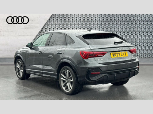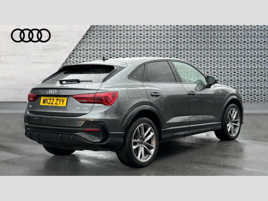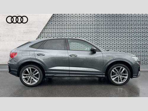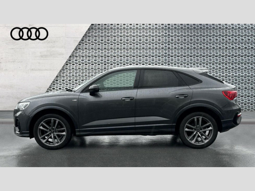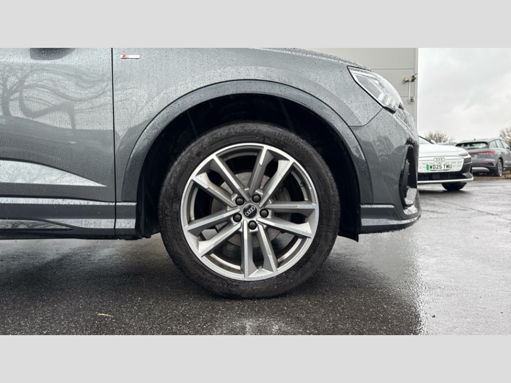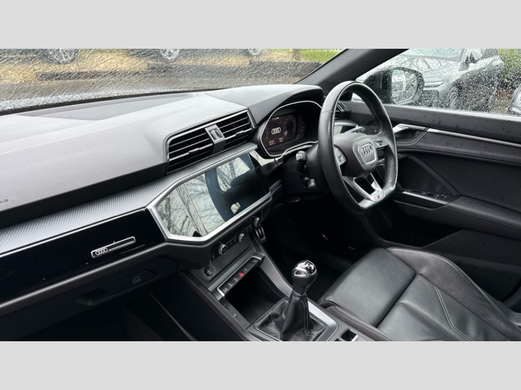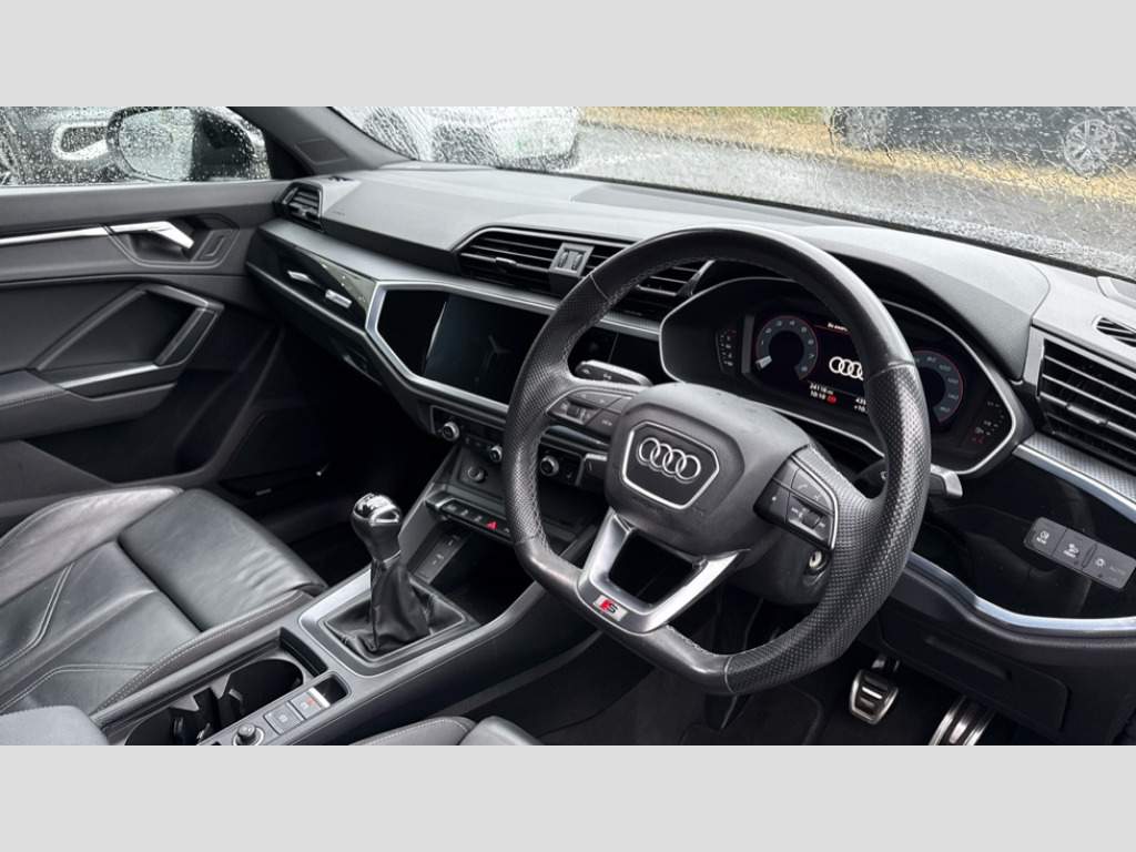 Audi Q3 35 TFSI Black Edition 5dr [Comfort+Sound Pack] Audi drive select, Audi lane departure warning, Audi parking system plus with front and rear sensors, Audi Virtual Cockpit - 10.25" display, Bluetooth interface, Camera based traffic sign recognition, Cruise control + speed limiter, Legal emergency call, MMI Navigation Plus with high resolution 10.1 inch touchscreen colour display, Power operated tailgate, Progressive steering, Reversing camera, Service interval indicator, Smartphone interface includes wireless Apple carplay/Android Auto, Start stop system with recuperation, Voice control system with natural language interaction, Sports suspension, 2 USB-C ports with charge and data functions, DAB digital radio module, SONOS premium sound system, Acoustic windscreen, Auto dimming frameless rear view mirror, Diffuser grille in grained matt black, Diffuser trim in selenite silver, Electrically folding, adjustable and heated door mirrors with integrated LED side indicators and kerb view function for passenger side, Front and rear electric windows, Front fog lights, Front side air inlets in selenite silver, Front underbody protection in manhattan grey paint finish, High gloss black finish B and C pillars, LED headlights with LED daytime running lights, LED rear lights, LED third brake light, Privacy glass dark tinted rear and rear-side windows (from B-pillar backwards), Rain and light sensors, Rear side wing doors, Rear underbody protection in matt black, Rear wiper, Variable front intermittent wipers, 12V socket in rear centre console, 3 seat bench in 2nd row, 3 spoke flat bottomed multi-function leather sport steering wheel, 40:20:40 folding with manual adjustment for 60:40 forwards/backwards position and backrest angle, Adjustable rear seat bench/backrest with centre armrest and cupholder, Black cloth headlining, Dual zone electronic climate control, Front and rear black floor mats with contrast stitching, Front and rear headrests, Front and rear roof module including reading lights, Front centre armrest, Glove compartment lighting, Heated front seats, Height and reach adjustable steering wheel, Illuminated door sill trims with S logo, ISOFIX child seat mounting for front passenger with airbag deactivation and outer rear seat including top tether attachment point for outer rear seats, Luggage compartment light right in white, Luggage compartment sill protection in stainless steel, Manual front seats with height adjustment, Perforated leather gearknob, Single front passenger seat, Stainless steel pedals, Black styling pack - Q3, Non smoking pack - Q3, 3x3 point rear seatbelts, 6 airbags - Driver, front passenger, curtain and side windows, Audi pre-sense front with pedestrain and cyclist recognition, Electromechanical parking brake, Electronic stabilisation control including ABS, ASR and EDL, Front seatbelt reminder, Hill descent control, Hill hold assist, Manual child lock in rear doors, Pre sense basic, Seatbelt monitoring, Tyre pressure warning, Warning triangle and first aid kit, Anti theft alarm, Anti theft wheel bolts, Immobiliser, Remote central locking, Black dashboard, Detail dashboard around MMI touch colour display in glass look, black with surround in aluminium look, Leatherette door armrest, Piano black inlay