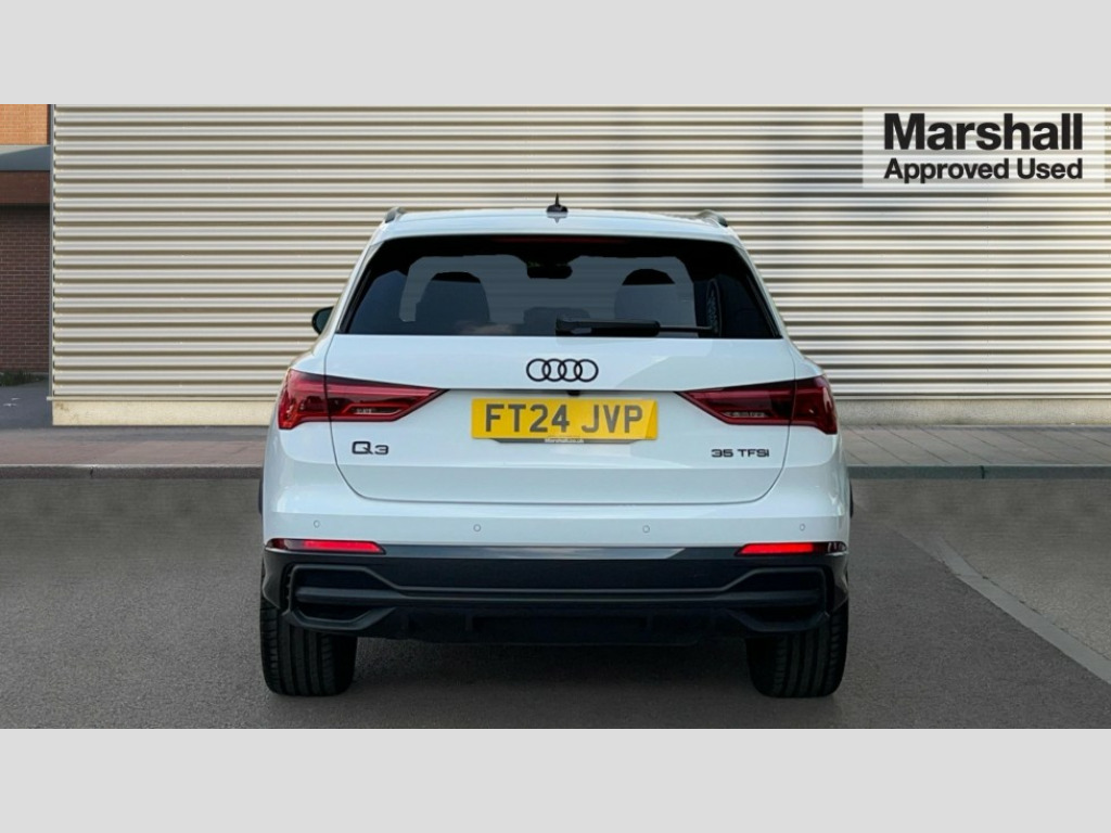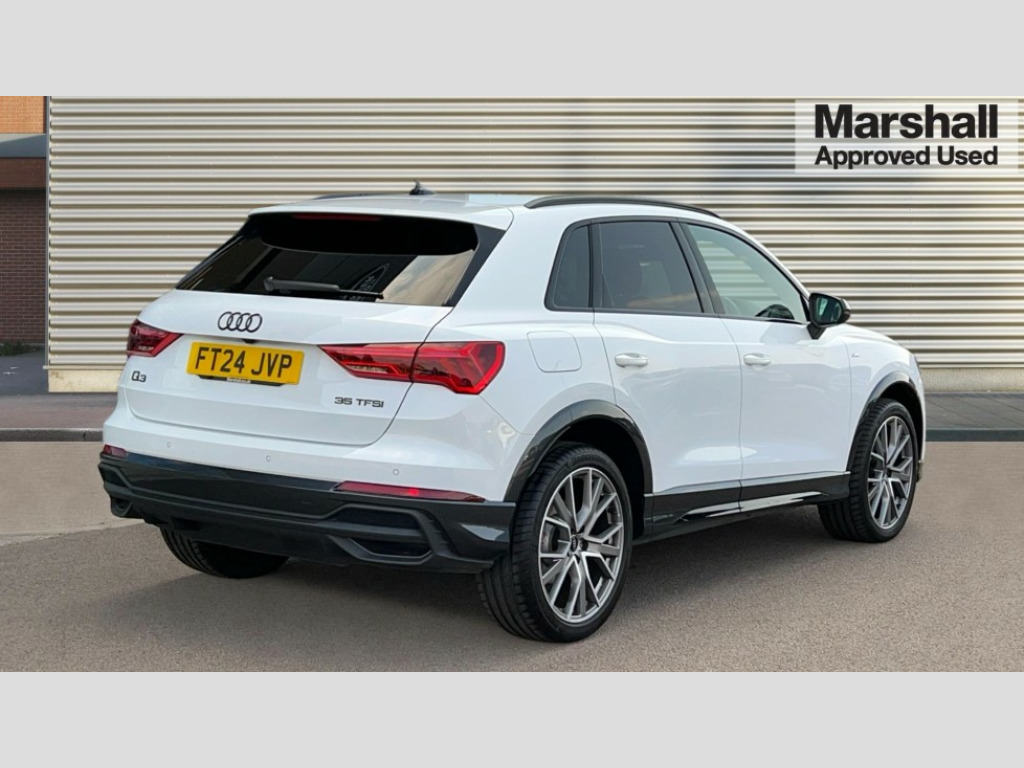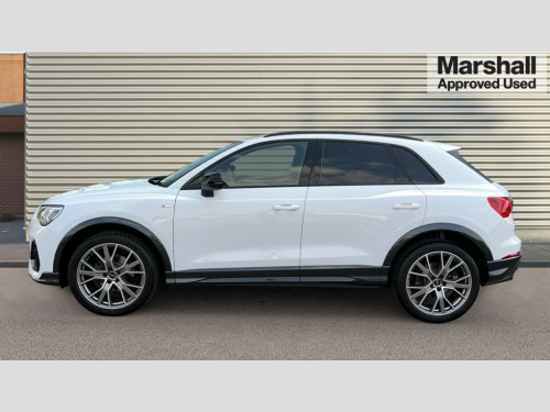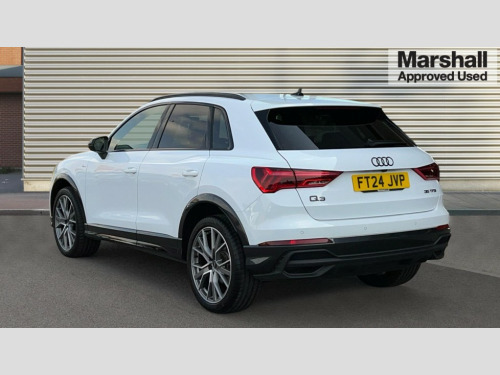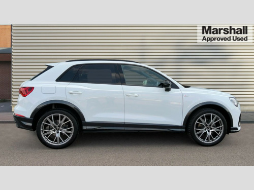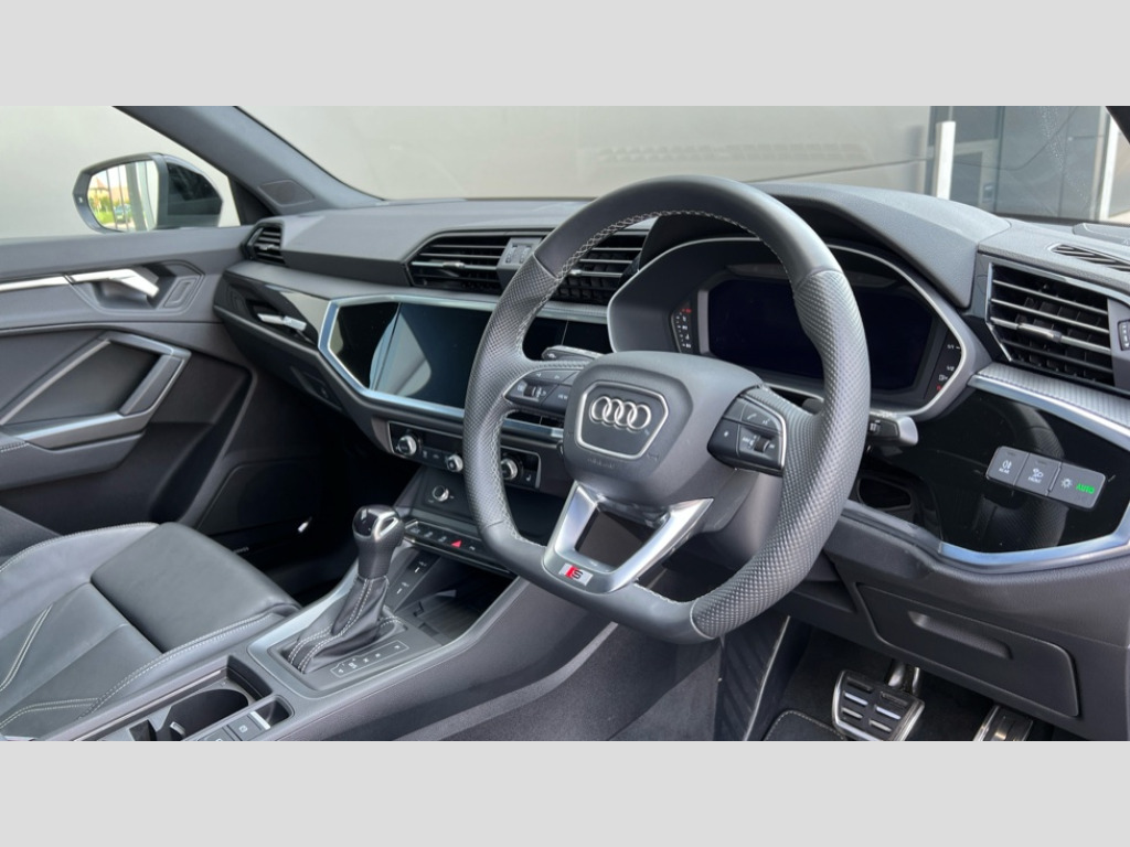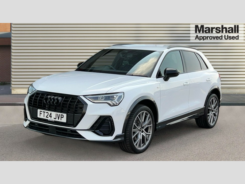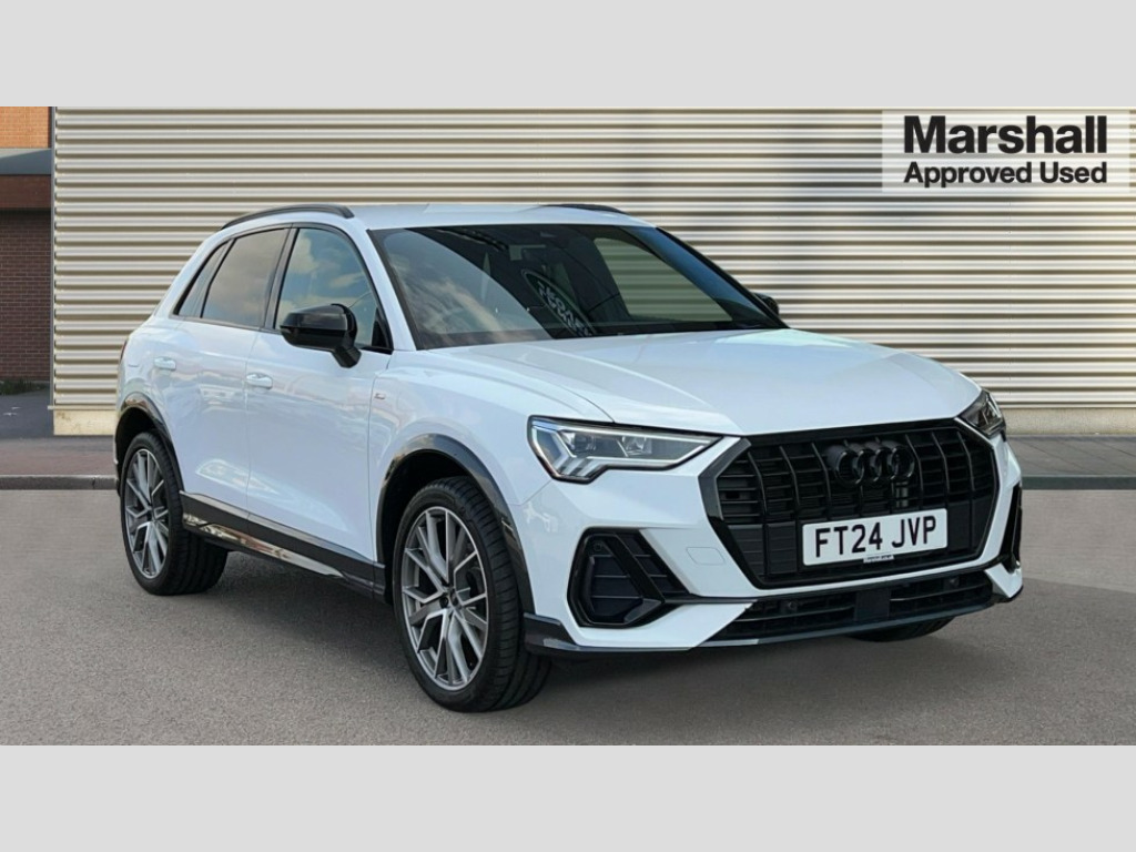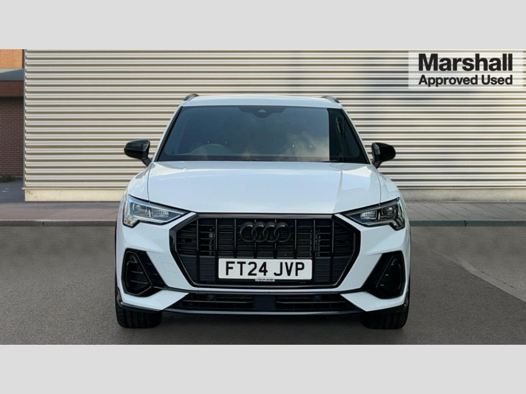 Audi Q3 35 TFSI Black Edition 5dr S Tronic [20" Alloy] Amazon alexa Integration, Audi connect safety and service, Audi drive select, Audi lane departure warning, Audi Virtual Cockpit - 10.25" display, Bluetooth interface, Camera based traffic sign recognition, Distraction and Fatigue warning, Legal emergency call, MMI Navigation Plus with high resolution 10.1 inch touchscreen colour display, Power operated tailgate, Progressive steering, Service interval indicator, Smartphone interface includes wireless Apple carplay/Android Auto, Start stop system with recuperation, Voice control system with natural language interaction, Sports suspension, 2 USB-C ports with charge and data functions, 6 passive loudspeakers, DAB digital radio module, Acoustic windscreen, Audi Beam uses LEDs to project the Audi logo onto the ground as you exit your Q3, Auto dimming door mirrors, Auto dimming frameless rear view mirror, Black roof rails, Electrically folding, adjustable and heated door mirrors with integrated LED side indicators and kerb view function for passenger side, Front and rear electric windows, Front fog lights, Grille vertical bars in aluminium silver/Matt, High gloss black finish B and C pillars, LED Dynamic rear indicators, LED headlights with LED daytime running lights, LED rear lights, LED third brake light, Privacy glass dark tinted rear and rear-side windows (from B-pillar backwards), Rain and light sensors, Rear diffuser grille in grained matt black, Rear diffuser strip in matt anthracite black, Rear side wing doors, Rear wiper, S line bumpers in contrasting Manhattan grey, Variable front intermittent wipers, 12V socket in rear centre console, 3 seat bench in 2nd row, 40:20:40 folding with manual adjustment for 60:40 forwards/backwards position and backrest angle, Adjustable rear seat bench/backrest with centre armrest and cupholder, Black cloth headlining, Dual zone electronic climate control, Electric lumbar support, Front and rear black floor mats with contrast stitching in rock grey, Front and rear headrests, Front centre armrest, Height and reach adjustable steering wheel, Illuminated door sill trims with S logo, ISOFIX child seat mounting for front passenger with airbag deactivation and outer rear seat including top tether attachment point for outer rear seats, Manual front seats with height adjustment, Perforated leather gearknob, Single front passenger seat, Stainless steel luggage compartment sill finisher, Stainless steel pedals, Twin leather upholstery with front sport seats + S embossing, Black styling pack - Q3, Non smoking pack - Q3, 3x3 point rear seatbelts, 6 airbags - Driver, front passenger, curtain and side windows, Audi pre-sense front with pedestrain and cyclist recognition, Electrically operated child locks on rear doors, Electromechanical parking brake, Electronic stabilisation control including ABS, ASR and EDL, Front seatbelt reminder, Hill descent control, Hill hold assist, Pre sense basic, Seatbelt monitoring, Tyre pressure warning, Warning triangle and first aid kit, Anti theft alarm, Anti theft wheel bolts, Immobiliser, Remote central locking, Aluminium look interior elements, Detail dashboard around MMI touch colour display in glass look, black with surround in aluminium look, Leatherette door armrest, Piano black inlay