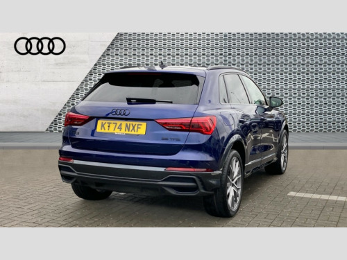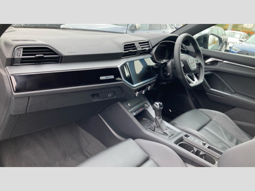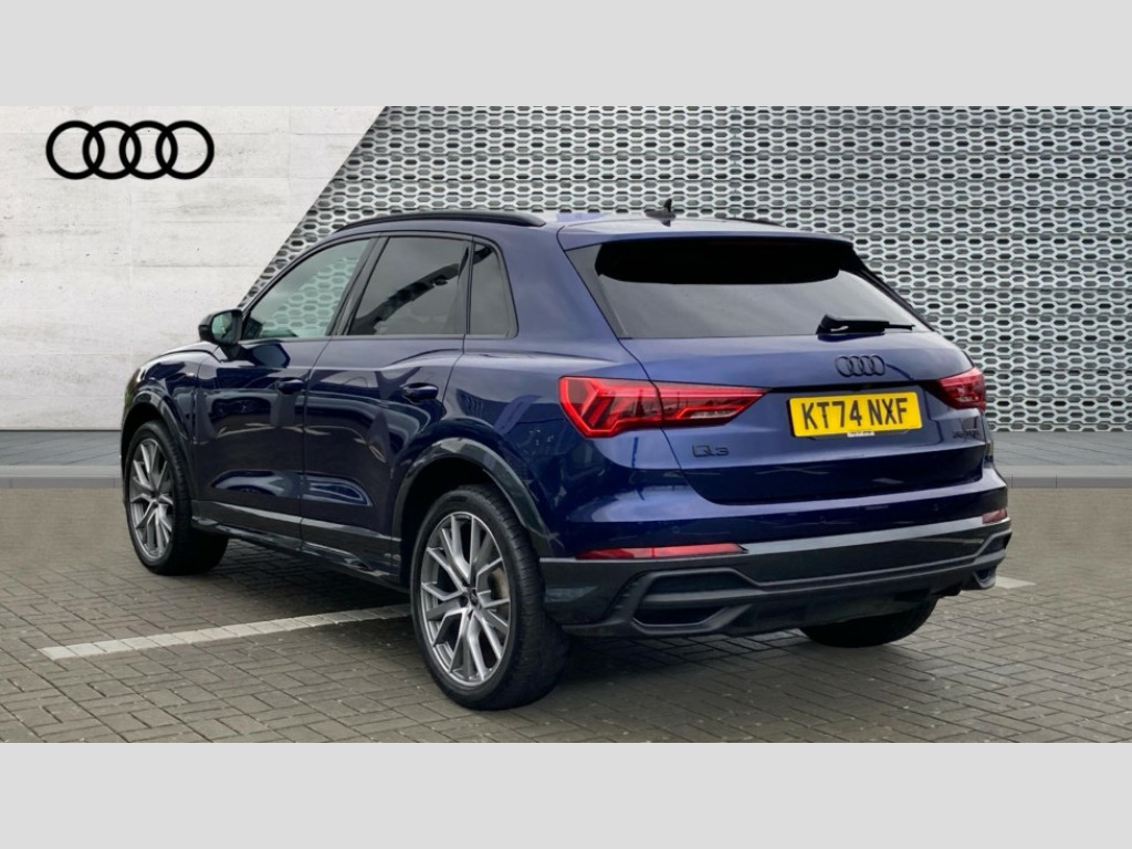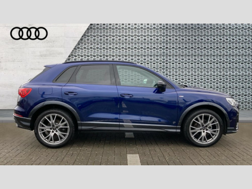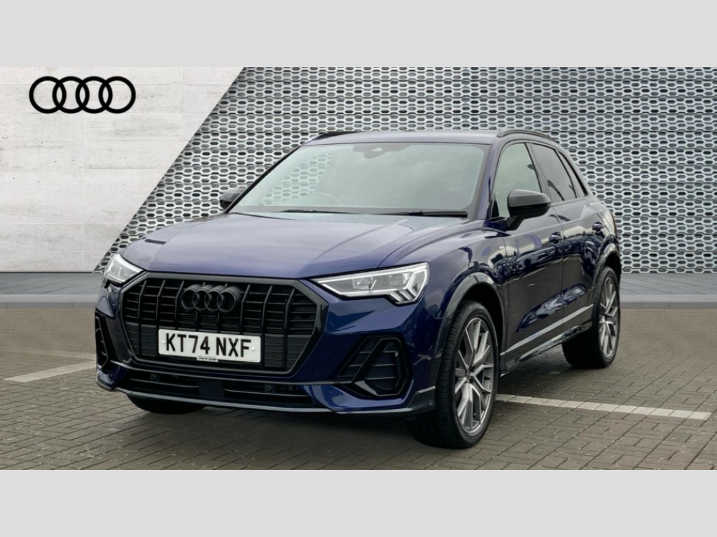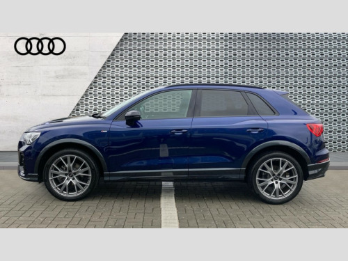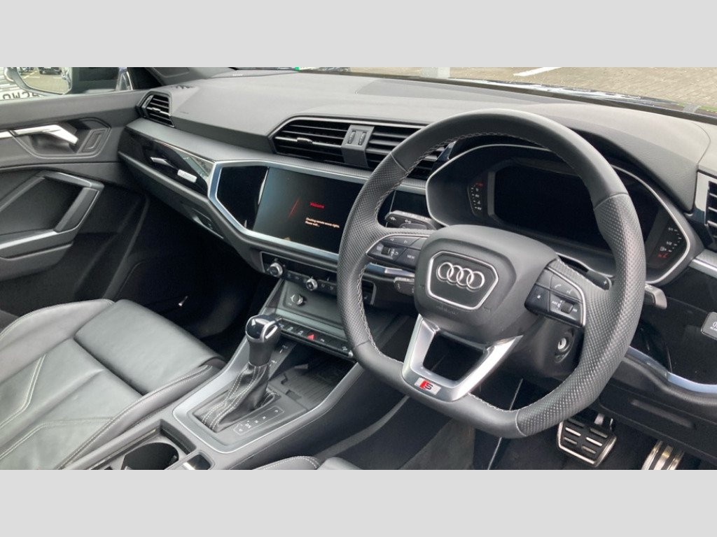 Audi Q3 35 TFSI Black Edition 5dr S Tronic [20" Alloy] Amazon alexa Integration, Audi connect safety and service, Audi drive select, Audi lane departure warning, Audi Virtual Cockpit - 10.25" display, Bluetooth interface, Camera based traffic sign recognition, Distraction and Fatigue warning, Legal emergency call, MMI Navigation Plus with high resolution 10.1 inch touchscreen colour display, Power operated tailgate, Progressive steering, Service interval indicator, Smartphone interface includes wireless Apple carplay/Android Auto, Start stop system with recuperation, Voice control system with natural language interaction, Sports suspension, 2 USB-C ports with charge and data functions, 6 passive loudspeakers, DAB digital radio module, Acoustic windscreen, Audi Beam uses LEDs to project the Audi logo onto the ground as you exit your Q3, Auto dimming door mirrors, Auto dimming frameless rear view mirror, Black roof rails, Electrically folding, adjustable and heated door mirrors with integrated LED side indicators and kerb view function for passenger side, Front and rear electric windows, Front fog lights, Grille vertical bars in aluminium silver/Matt, High gloss black finish B and C pillars, LED Dynamic rear indicators, LED headlights with LED daytime running lights, LED rear lights, LED third brake light, Privacy glass dark tinted rear and rear-side windows (from B-pillar backwards), Rain and light sensors, Rear diffuser grille in grained matt black, Rear diffuser strip in matt anthracite black, Rear side wing doors, Rear wiper, S line bumpers in contrasting Manhattan grey, Variable front intermittent wipers, 12V socket in rear centre console, 3 seat bench in 2nd row, 40:20:40 folding with manual adjustment for 60:40 forwards/backwards position and backrest angle, Adjustable rear seat bench/backrest with centre armrest and cupholder, Black cloth headlining, Dual zone electronic climate control, Electric lumbar support, Front and rear black floor mats with contrast stitching in rock grey, Front and rear headrests, Front centre armrest, Height and reach adjustable steering wheel, Illuminated door sill trims with S logo, ISOFIX child seat mounting for front passenger with airbag deactivation and outer rear seat including top tether attachment point for outer rear seats, Manual front seats with height adjustment, Perforated leather gearknob, Single front passenger seat, Stainless steel luggage compartment sill finisher, Stainless steel pedals, Twin leather upholstery with front sport seats + S embossing, Black styling pack - Q3, Non smoking pack - Q3, 3x3 point rear seatbelts, 6 airbags - Driver, front passenger, curtain and side windows, Audi pre-sense front with pedestrain and cyclist recognition, Electrically operated child locks on rear doors, Electromechanical parking brake, Electronic stabilisation control including ABS, ASR and EDL, Front seatbelt reminder, Hill descent control, Hill hold assist, Pre sense basic, Seatbelt monitoring, Tyre pressure warning, Warning triangle and first aid kit, Anti theft alarm, Anti theft wheel bolts, Immobiliser, Remote central locking, Aluminium look interior elements, Detail dashboard around MMI touch colour display in glass look, black with surround in aluminium look, Leatherette door armrest, Piano black inlay