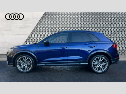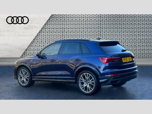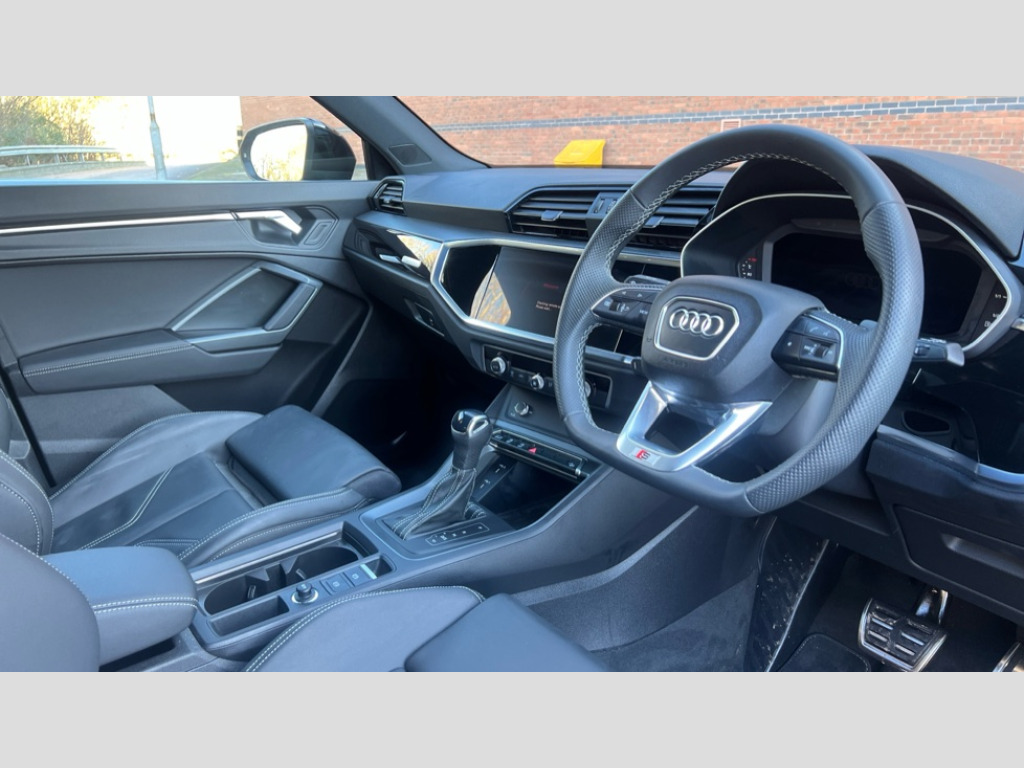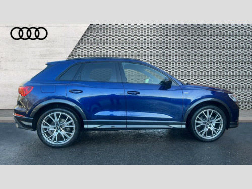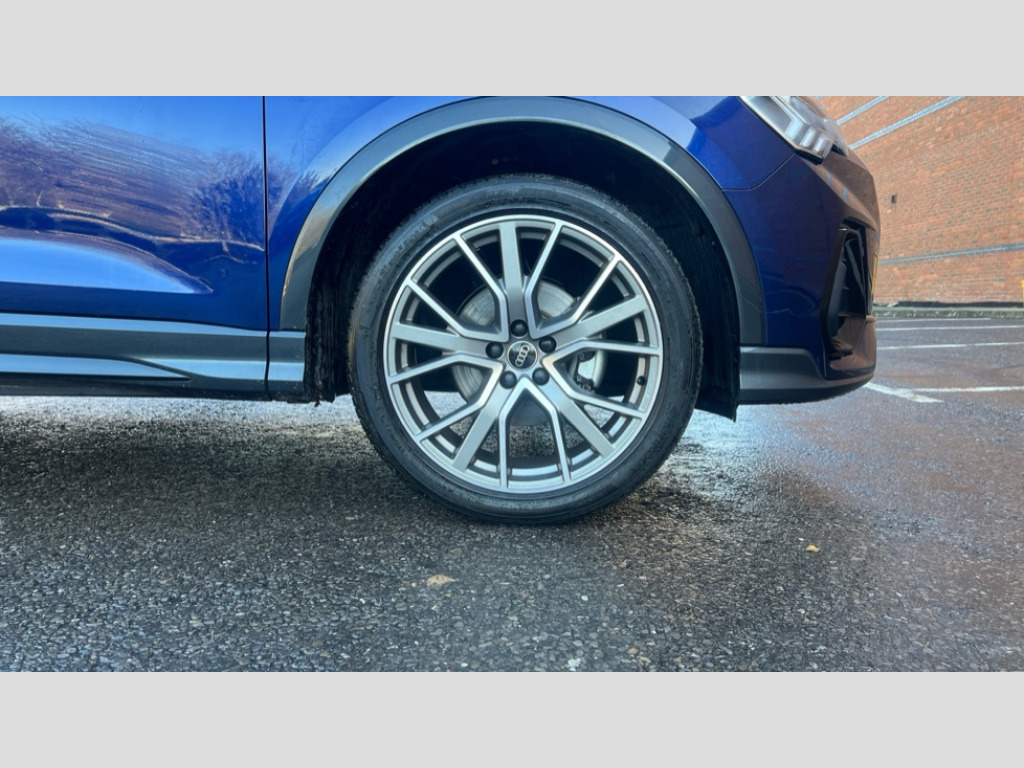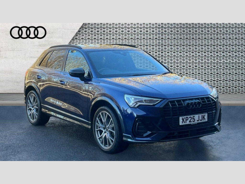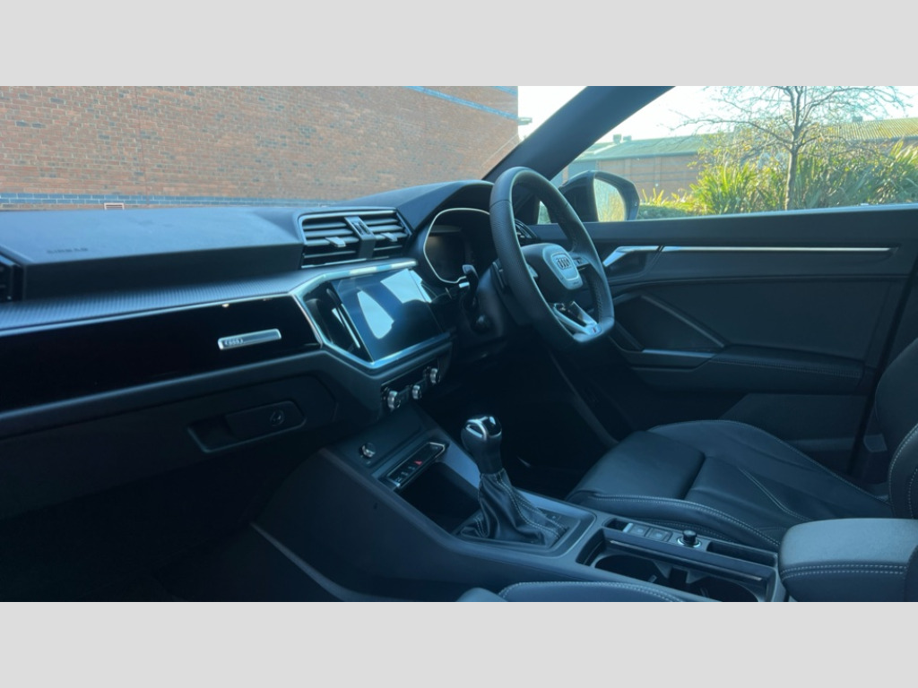 Audi Q3 35 TFSI Black Edition 5dr S Tronic [20" Alloy] Amazon alexa Integration, Audi connect safety and service, Audi drive select, Audi lane departure warning, Audi Virtual Cockpit - 10.25" display, Bluetooth interface, Camera based traffic sign recognition, Distraction and Fatigue warning, Legal emergency call, MMI Navigation Plus with high resolution 10.1 inch touchscreen colour display, Power operated tailgate, Progressive steering, Service interval indicator, Smartphone interface includes wireless Apple carplay/Android Auto, Start stop system with recuperation, Voice control system with natural language interaction, Sports suspension, 2 USB-C ports with charge and data functions, 6 passive loudspeakers, DAB digital radio module, Acoustic windscreen, Audi Beam uses LEDs to project the Audi logo onto the ground as you exit your Q3, Auto dimming door mirrors, Auto dimming frameless rear view mirror, Black roof rails, Electrically folding, adjustable and heated door mirrors with integrated LED side indicators and kerb view function for passenger side, Front and rear electric windows, Front fog lights, Grille vertical bars in aluminium silver/Matt, High gloss black finish B and C pillars, LED Dynamic rear indicators, LED headlights with LED daytime running lights, LED rear lights, LED third brake light, Privacy glass dark tinted rear and rear-side windows (from B-pillar backwards), Rain and light sensors, Rear diffuser grille in grained matt black, Rear diffuser strip in matt anthracite black, Rear side wing doors, Rear wiper, S line bumpers in contrasting Manhattan grey, Variable front intermittent wipers, 12V socket in rear centre console, 3 seat bench in 2nd row, 40:20:40 folding with manual adjustment for 60:40 forwards/backwards position and backrest angle, Adjustable rear seat bench/backrest with centre armrest and cupholder, Black cloth headlining, Dual zone electronic climate control, Electric lumbar support, Front and rear black floor mats with contrast stitching in rock grey, Front and rear headrests, Front centre armrest, Height and reach adjustable steering wheel, Illuminated door sill trims with S logo, ISOFIX child seat mounting for front passenger with airbag deactivation and outer rear seat including top tether attachment point for outer rear seats, Manual front seats with height adjustment, Perforated leather gearknob, Single front passenger seat, Stainless steel luggage compartment sill finisher, Stainless steel pedals, Twin leather upholstery with front sport seats + S embossing, Black styling pack - Q3, Non smoking pack - Q3, 3x3 point rear seatbelts, 6 airbags - Driver, front passenger, curtain and side windows, Audi pre-sense front with pedestrain and cyclist recognition, Electrically operated child locks on rear doors, Electromechanical parking brake, Electronic stabilisation control including ABS, ASR and EDL, Front seatbelt reminder, Hill descent control, Hill hold assist, Pre sense basic, Seatbelt monitoring, Tyre pressure warning, Warning triangle and first aid kit, Anti theft alarm, Anti theft wheel bolts, Immobiliser, Remote central locking, Aluminium look interior elements, Detail dashboard around MMI touch colour display in glass look, black with surround in aluminium look, Leatherette door armrest, Piano black inlay