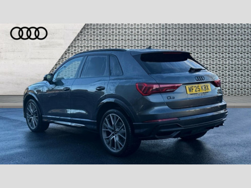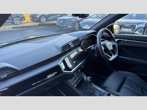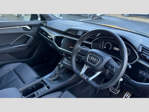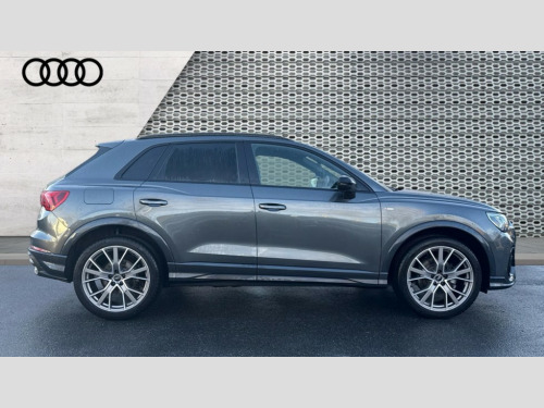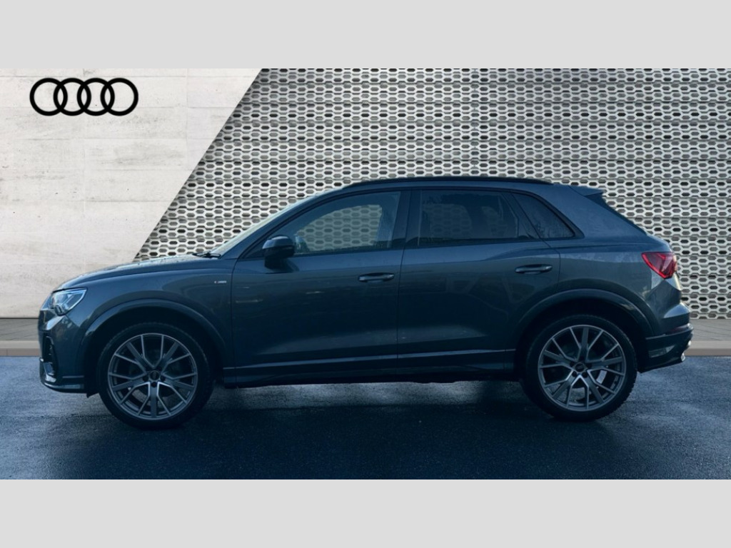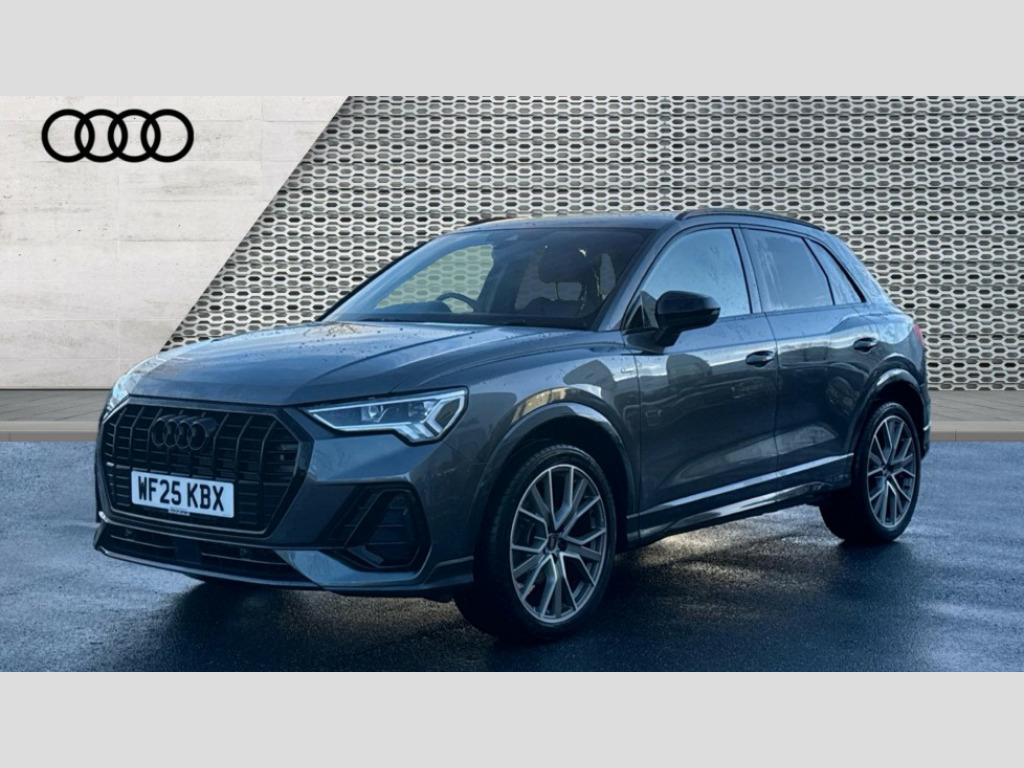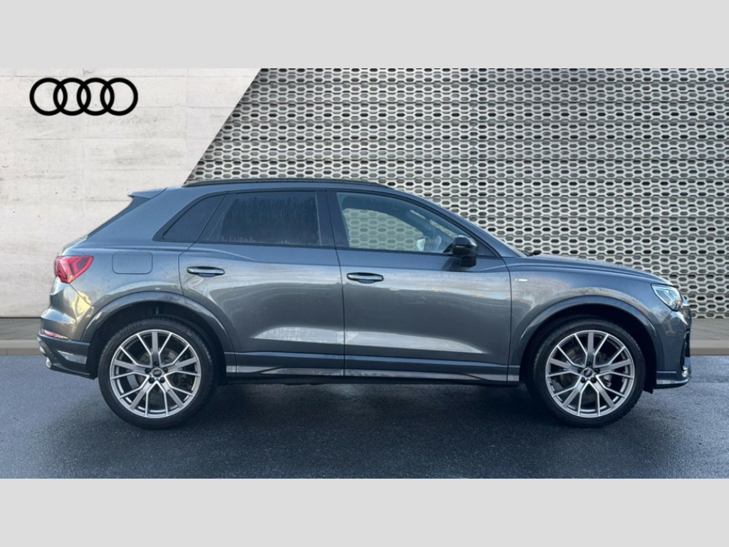 Audi Q3 35 TFSI Black Edition 5dr S Tronic [20" Alloy] Amazon alexa Integration, Audi connect safety and service, Audi drive select, Audi lane departure warning, Audi Virtual Cockpit - 10.25" display, Bluetooth interface, Camera based traffic sign recognition, Distraction and Fatigue warning, Legal emergency call, MMI Navigation Plus with high resolution 10.1 inch touchscreen colour display, Power operated tailgate, Progressive steering, Service interval indicator, Smartphone interface includes wireless Apple carplay/Android Auto, Start stop system with recuperation, Voice control system with natural language interaction, Sports suspension, 2 USB-C ports with charge and data functions, 6 passive loudspeakers, DAB digital radio module, Acoustic windscreen, Audi Beam uses LEDs to project the Audi logo onto the ground as you exit your Q3, Auto dimming door mirrors, Auto dimming frameless rear view mirror, Black roof rails, Electrically folding, adjustable and heated door mirrors with integrated LED side indicators and kerb view function for passenger side, Front and rear electric windows, Front fog lights, Grille vertical bars in aluminium silver/Matt, High gloss black finish B and C pillars, LED Dynamic rear indicators, LED headlights with LED daytime running lights, LED rear lights, LED third brake light, Privacy glass dark tinted rear and rear-side windows (from B-pillar backwards), Rain and light sensors, Rear diffuser grille in grained matt black, Rear diffuser strip in matt anthracite black, Rear side wing doors, Rear wiper, S line bumpers in contrasting Manhattan grey, Variable front intermittent wipers, 12V socket in rear centre console, 3 seat bench in 2nd row, 40:20:40 folding with manual adjustment for 60:40 forwards/backwards position and backrest angle, Adjustable rear seat bench/backrest with centre armrest and cupholder, Black cloth headlining, Dual zone electronic climate control, Electric lumbar support, Front and rear black floor mats with contrast stitching in rock grey, Front and rear headrests, Front centre armrest, Height and reach adjustable steering wheel, Illuminated door sill trims with S logo, ISOFIX child seat mounting for front passenger with airbag deactivation and outer rear seat including top tether attachment point for outer rear seats, Manual front seats with height adjustment, Perforated leather gearknob, Single front passenger seat, Stainless steel luggage compartment sill finisher, Stainless steel pedals, Twin leather upholstery with front sport seats + S embossing, Black styling pack - Q3, Non smoking pack - Q3, 3x3 point rear seatbelts, 6 airbags - Driver, front passenger, curtain and side windows, Audi pre-sense front with pedestrain and cyclist recognition, Electrically operated child locks on rear doors, Electromechanical parking brake, Electronic stabilisation control including ABS, ASR and EDL, Front seatbelt reminder, Hill descent control, Hill hold assist, Pre sense basic, Seatbelt monitoring, Tyre pressure warning, Warning triangle and first aid kit, Anti theft wheel bolts, Immobiliser, Remote central locking, Thatcham approved category 1 anti theft alarm, Aluminium look interior elements, Detail dashboard around MMI touch colour display in glass look, black with surround in aluminium look, Leatherette door armrest, Piano black inlay