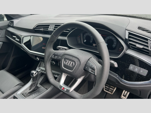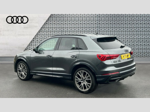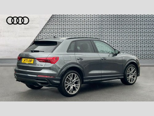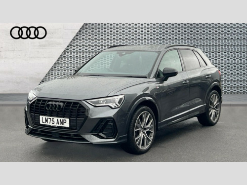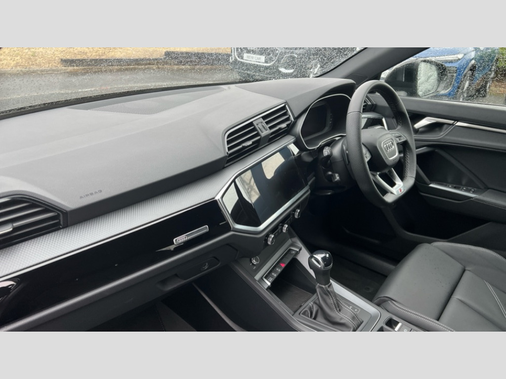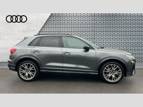 Audi Q3 35 TFSI Black Edition 5dr S Tronic [20" Alloy] Audi connect safety and service, Audi drive select, Audi lane departure warning, Audi Virtual Cockpit - 10.25" display, Bluetooth interface, Camera based traffic sign recognition, Distraction and Fatigue warning, Legal emergency call, MMI Navigation Plus with high resolution 10.1 inch touchscreen colour display, Power operated tailgate, Progressive steering, Service interval indicator, Smartphone interface includes wireless Apple carplay/Android Auto, Start stop system with recuperation, Voice control system with natural language interaction, Sports suspension, 2 USB-C ports with charge and data functions, 6 passive loudspeakers, DAB digital radio module, Acoustic windscreen, Audi Beam uses LEDs to project the Audi logo onto the ground as you exit your Q3, Auto dimming door mirrors, Auto dimming frameless rear view mirror, Electrically folding, adjustable and heated door mirrors with integrated LED side indicators and kerb view function for passenger side, Front and rear electric windows, Front fog lights, Front underbody protection in manhattan grey paint finish, High gloss black finish B and C pillars, Honeycomb design radiator grille in matt anthracite black, LED Dynamic rear indicators, LED headlights with LED daytime running lights, LED rear lights, LED third brake light, Privacy glass dark tinted rear and rear-side windows (from B-pillar backwards), Rain and light sensors, Rear diffuser grille in grained matt black, Rear diffuser strip in matt anthracite black, Rear side wing doors, Rear underbody protection in matt black, Rear wiper, S line front and rear bumpers and side skirts in contrasting Manhattan grey paint finish, Variable front intermittent wipers, 12V socket in rear centre console, 3 seat bench in 2nd row, 40:20:40 folding with manual adjustment for 60:40 forwards/backwards position and backrest angle, Adjustable rear seat bench/backrest with centre armrest and cupholder, Black carpet mats, Black cloth headlining, Dual zone electronic climate control, Electric lumbar support, Front and rear black floor mats with contrast stitching in rock grey, Front and rear headrests, Front centre armrest, Height and reach adjustable steering wheel, Illuminated door sill trims with S logo, ISOFIX child seat mounting for front passenger with airbag deactivation and outer rear seat including top tether attachment point for outer rear seats, Luggage compartment sill protection in stainless steel, Manual front seats with height adjustment, Perforated leather gearknob, Single front passenger seat, Stainless steel pedals, Twin leather upholstery with front sport seats + S embossing, Black styling pack - Q3, Non smoking pack - Q3, 3x3 point rear seatbelts, 6 airbags - Driver, front passenger, curtain and side windows, Audi pre-sense front with pedestrain and cyclist recognition, Electrically operated child locks on rear doors, Electromechanical parking brake, Electronic stabilisation control including ABS, ASR and EDL, Front seatbelt reminder, Hill descent control, Hill hold assist, Pre sense basic, Seatbelt monitoring, Tyre pressure warning, Warning triangle and first aid kit, Anti theft wheel bolts, Immobiliser, Remote central locking, Thatcham approved category 1 anti theft alarm, Aluminium look interior elements, Detail dashboard around MMI touch colour display in glass look, black with surround in aluminium look, Leatherette door armrest, Piano black inlay
