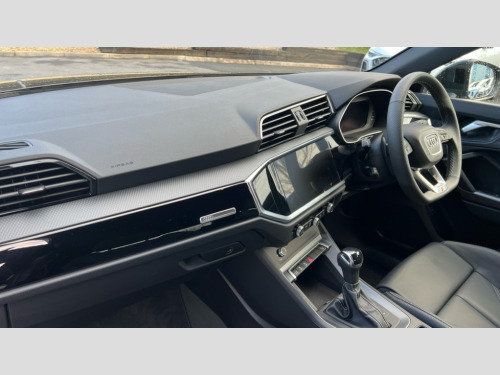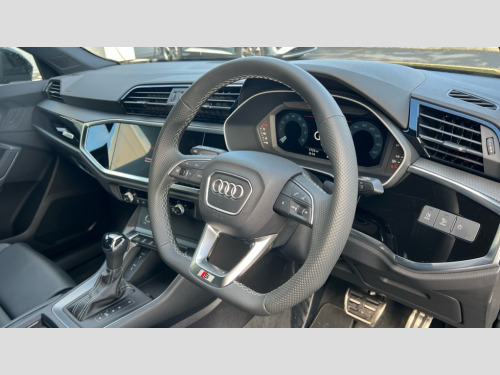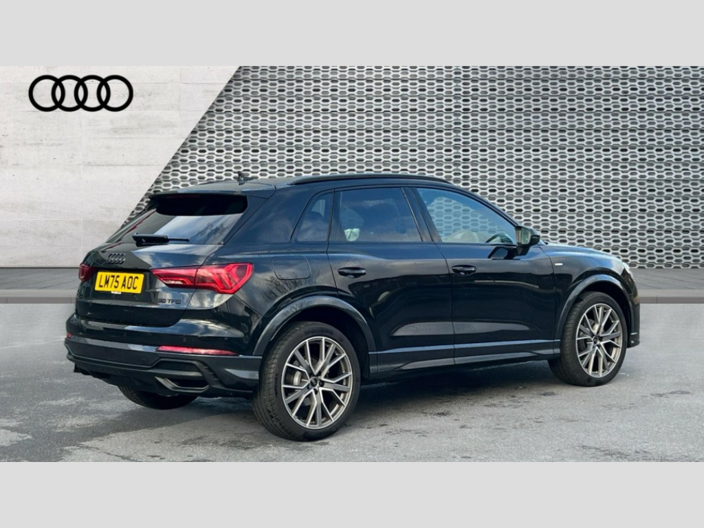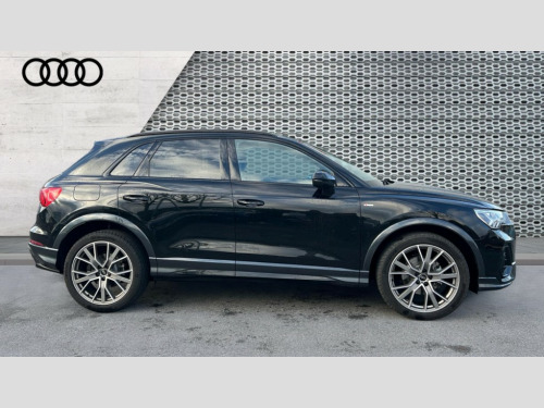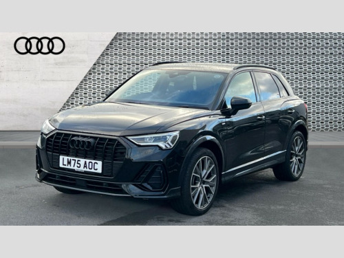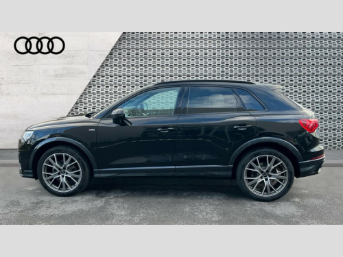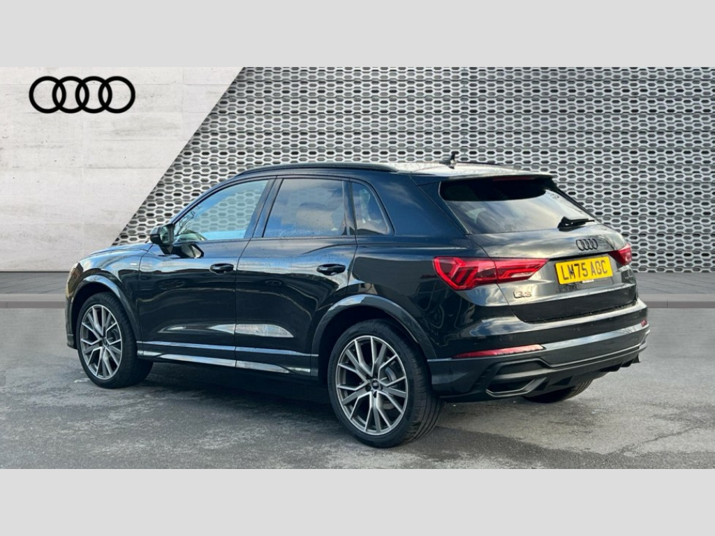 Audi Q3 35 TFSI Black Edition 5dr S Tronic [20" Alloy] Amazon alexa Integration, Audi connect safety and service, Audi drive select, Audi lane departure warning, Audi Virtual Cockpit - 10.25" display, Bluetooth interface, Camera based traffic sign recognition, Distraction and Fatigue warning, Legal emergency call, MMI Navigation Plus with high resolution 10.1 inch touchscreen colour display, Power operated tailgate, Progressive steering, Service interval indicator, Smartphone interface includes wireless Apple carplay/Android Auto, Start stop system with recuperation, Voice control system with natural language interaction, Sports suspension, 2 USB-C ports with charge and data functions, 6 passive loudspeakers, DAB digital radio module, Acoustic windscreen, Anthracite black radiator grille, Audi Beam uses LEDs to project the Audi logo onto the ground as you exit your Q3, Auto dimming door mirrors, Auto dimming frameless rear view mirror, Black roof rails, Electrically folding, adjustable and heated door mirrors with integrated LED side indicators and kerb view function for passenger side, Front and rear electric windows, Front fog lights, Grille vertical bars in aluminium silver/Matt, High gloss black finish B and C pillars, LED Dynamic rear indicators, LED headlights with LED daytime running lights, LED rear lights, LED third brake light, Privacy glass dark tinted rear and rear-side windows (from B-pillar backwards), Rain and light sensors, Rear diffuser grille in grained matt black, Rear diffuser strip in matt anthracite black, Rear side wing doors, Rear wiper, S line bumpers in contrasting Manhattan grey, Variable front intermittent wipers, 12V socket in rear centre console, 3 seat bench in 2nd row, 40:20:40 folding with manual adjustment for 60:40 forwards/backwards position and backrest angle, Adjustable rear seat bench/backrest with centre armrest and cupholder, Black carpet mats, Black cloth headlining, Dual zone electronic climate control, Electric lumbar support, Front and rear black floor mats with contrast stitching in rock grey, Front and rear headrests, Front centre armrest, Height and reach adjustable steering wheel, Illuminated door sill trims with S logo, ISOFIX child seat mounting for front passenger with airbag deactivation and outer rear seat including top tether attachment point for outer rear seats, Luggage compartment sill protection in stainless steel, Manual front seats with height adjustment, Perforated leather gearknob, Single front passenger seat, Stainless steel pedals, Twin leather upholstery with front sport seats + S embossing, Black styling pack - Q3, Non smoking pack - Q3, 3x3 point rear seatbelts, 6 airbags - Driver, front passenger, curtain and side windows, Audi pre-sense front with pedestrain and cyclist recognition, Electrically operated child locks on rear doors, Electromechanical parking brake, Electronic stabilisation control including ABS, ASR and EDL, Front seatbelt reminder, Hill descent control, Hill hold assist, Pre sense basic, Seatbelt monitoring, Tyre pressure warning, Warning triangle and first aid kit, Anti theft wheel bolts, Immobiliser, Remote central locking, Thatcham approved category 1 anti theft alarm, Aluminium look interior elements, Detail dashboard around MMI touch colour display in glass look, black with surround in aluminium look, Leatherette door armrest, Piano black inlay