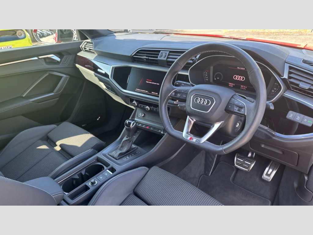 Audi Q3 35 TFSI Black Edition 5dr S Tronic Audi drive select, Audi lane departure warning, Audi Virtual Cockpit - 10.25" display, Bluetooth interface, Camera based traffic sign recognition, Legal emergency call, MMI Navigation Plus with high resolution 10.1 inch touchscreen colour display, Power operated tailgate, Progressive steering, Service interval indicator, Smartphone interface includes wireless Apple carplay/Android Auto, Start stop system with recuperation, Voice control system with natural language interaction, Sports suspension, 2 USB-C ports with charge and data functions, 6 passive loudspeakers, DAB digital radio module, Acoustic windscreen, Auto dimming frameless rear view mirror, Diffuser grille in grained matt black, Diffuser trim in selenite silver, Electrically folding, adjustable and heated door mirrors with integrated LED side indicators and kerb view function for passenger side, Front and rear electric windows, Front fog lights, Front underbody protection in manhattan grey paint finish, High gloss black finish B and C pillars, LED Dynamic rear indicators, LED headlights with LED daytime running lights, LED rear lights, LED third brake light, Privacy glass dark tinted rear and rear-side windows (from B-pillar backwards), Rain and light sensors, Rear side wing doors, Rear underbody protection in matt black, Rear wiper, Variable front intermittent wipers, 12V socket in rear centre console, 3 seat bench in 2nd row, 40:20:40 folding with manual adjustment for 60:40 forwards/backwards position and backrest angle, Adjustable rear seat bench/backrest with centre armrest and cupholder, Black cloth headlining, Dual zone electronic climate control, Front and rear black floor mats with contrast stitching, Front and rear headrests, Front and rear roof module including reading lights, Front centre armrest, Glove compartment lighting, Height and reach adjustable steering wheel, Illuminated door sill trims with S logo, ISOFIX child seat mounting for front passenger with airbag deactivation and outer rear seat including top tether attachment point for outer rear seats, Luggage compartment light right in white, Luggage compartment sill protection in stainless steel, Manual front seats with height adjustment, Perforated leather gearknob, Single front passenger seat, Stainless steel pedals, Ambient lighting pack - Q3, Black styling pack - Q3, Non smoking pack - Q3, 3x3 point rear seatbelts, 6 airbags - Driver, front passenger, curtain and side windows, Audi pre-sense front with pedestrain and cyclist recognition, Electrically operated child locks on rear doors, Electromechanical parking brake, Electronic stabilisation control including ABS, ASR and EDL, Front seatbelt reminder, Hill descent control, Hill hold assist, Pre sense basic, Seatbelt monitoring, Tyre pressure warning, Warning triangle and first aid kit, Anti theft alarm, Anti theft wheel bolts, Immobiliser, Remote central locking, Aluminium look interior elements, Black dashboard, Detail dashboard around MMI touch colour display in glass look, black with surround in aluminium look, Leatherette door armrest, Piano black inlay, 19" 5 twin arm design diamond cut audi sport alloy wheels in matt grey look