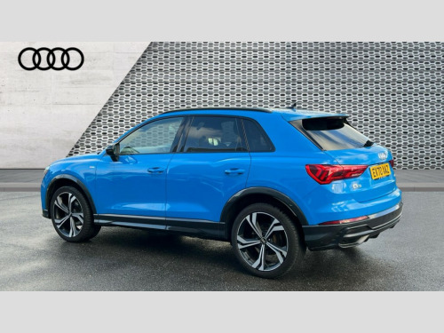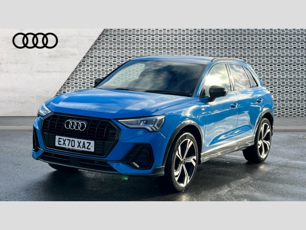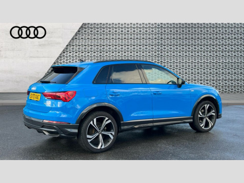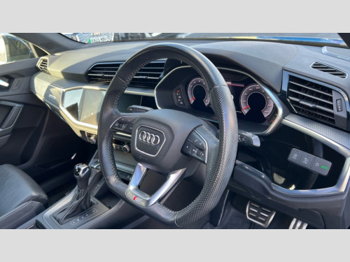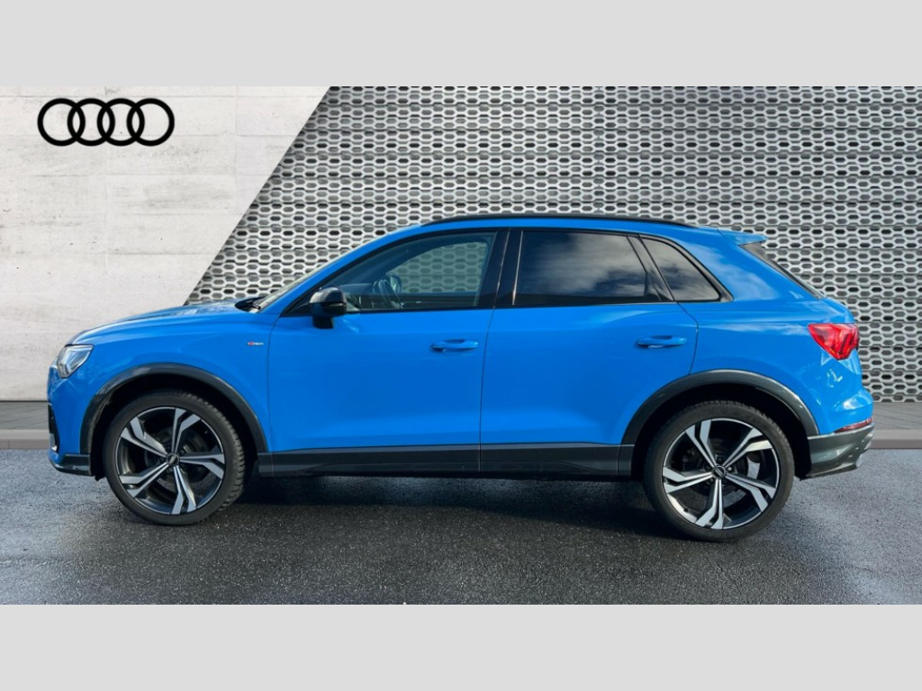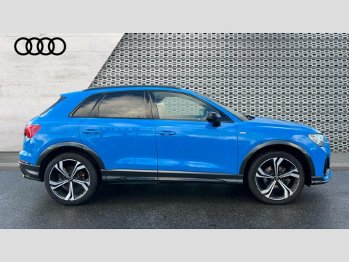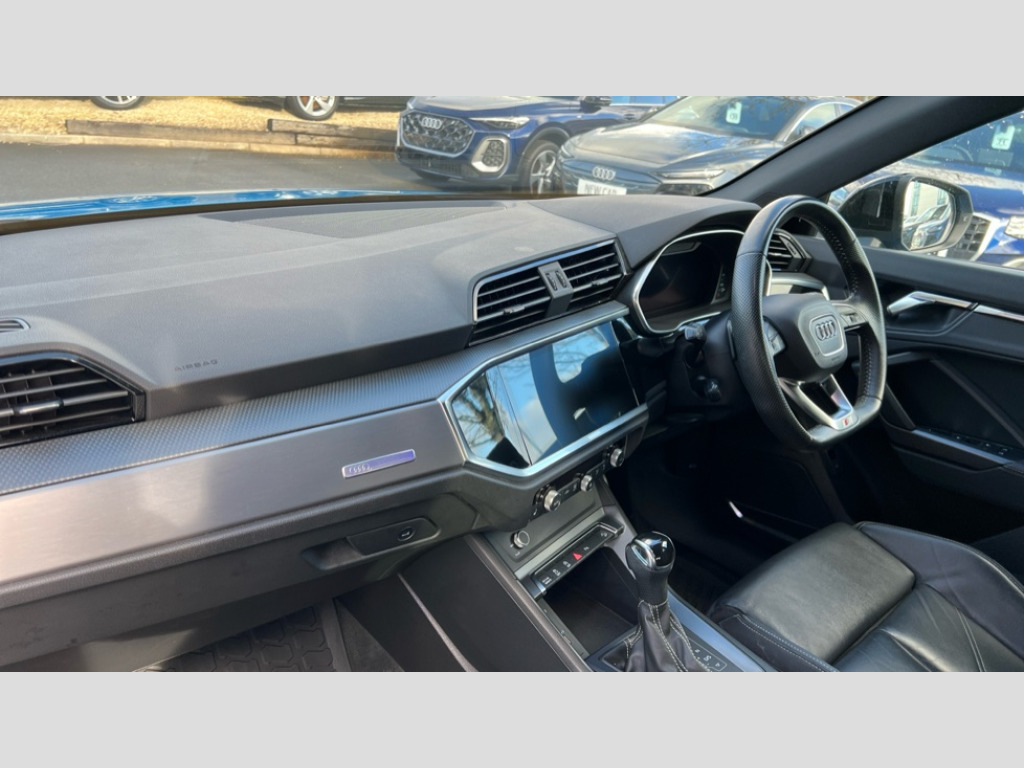Audi Q3 35 TFSI Edition 1 5dr S Tronic Audi connect safety and service (e-call), Audi drive select, Audi lane departure warning, Audi side assist, Audi virtual cockpit plus, Bluetooth interface, Camera based traffic sign recognition, MMI Navigation Plus with high resolution 10.1 inch touchscreen colour display, Power operated tailgate, Progressive steering, Service interval indicator, Smartphone interface includes wireless Apple carplay/Android Auto, Start stop system with recuperation, Voice control system with natural language interaction, 48V Mild hybrid technology, Sports suspension, 1 x USB type C and 1 USB type A charging points, 6 passive loudspeakers, DAB digital radio module, Acoustic windscreen, Audi Beam uses LEDs to project the Audi Sport logo, Auto dimming frameless rear view mirror, Black roof rails, Electrically folding, adjustable and heated door mirrors with integrated LED side indicators and kerb view function for passenger side, Front and rear electric windows, Front fog lights, Front spoiler blade in matt platinum grey, Grille vertical bars in aluminium silver/Matt, Headlight washers, High gloss black finish B and C pillars, Matrix LED headlights with LED rear lights and dynamic front and rear indicator, Privacy glass dark tinted rear and rear-side windows (from B-pillar backwards), Rain and light sensors, Rear diffuser strip in matt titanium black, S line bumpers in contrasting Manhattan grey, Side skirt insert in matt Platinium grey, Silver chrome grille surround, 12V socket in rear centre console, 3 spoke flat bottomed high multi-function leather sport steering wheel with gearshift paddles, 4 way electric lumbar support for driver and front passenger, 40:20:40 folding with manual adjustment for 60:40 forwards/backwards position and backrest angle, Adjustable rear seat bench/backrest with centre armrest and cupholder, Black cloth headlining, Dual zone electronic climate control, Electrically adjustable front seats, Front and rear black floor mats with contrast stitching in rock grey, Front and rear headrests, Front and rear roof module including reading lights, Front centre armrest, Glove compartment lighting, Heated front seats, Height and reach adjustable steering wheel, Illuminated door sill trims with S logo, ISOFIX child seat mounting for front passenger with airbag deactivation and outer rear seat including top tether attachment point for outer rear seats, Luggage compartment light, Perforated leather gearknob, Stainless steel luggage compartment sill finisher, Stainless steel pedals, Black styling pack - Q3, Multi coloured extended ambient interior lighting pack - Q3, Non smoking pack - Q3, 3x3 point rear seatbelts, 6 airbags - Driver, front passenger, curtain and side windows, Audi pre-sense front with pedestrain and cyclist recognition, Electrically operated child locks on rear doors, Electromechanical parking brake, Electronic stabilisation control including ABS, ASR and EDL, Hill descent control, Hill hold assist, Pre sense basic, Seatbelt monitoring, Tyre pressure warning, Warning triangle and first aid kit, Anti theft alarm, Anti theft wheel bolts, Remote central locking, Dark matt brushed aluminium inlay, Detail dashboard around MMI touch colour display in glass look, black with surround in aluminium look, Leatherette door armrest, Tool kit, Tyre repair kit