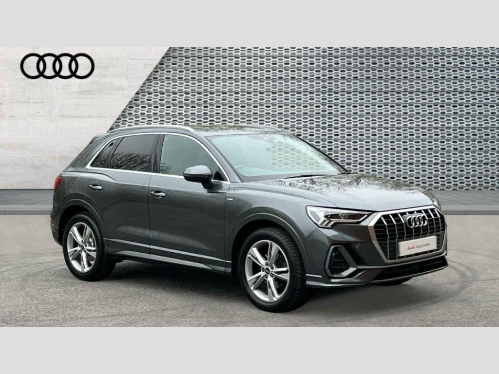 Audi Q3 35 TFSI S Line 5dr Amazon alexa Integration, Audi connect safety and service (e-call), Audi drive select, Audi lane departure warning, Audi smartphone interface includes wireless Apple carplay/Android Auto, Audi Virtual Cockpit - 10.25" display, Bluetooth interface, Camera based traffic sign recognition, Cruise control + speed limiter, MMI Navigation Plus with high resolution 10.1 inch touchscreen colour display, Power operated tailgate, Progressive steering, Rear parking sensors, Service interval indicator, Start stop system with recuperation, Voice control system with natural language interaction, Sports suspension, 2 USB-C ports with charge and data functions, 6 passive loudspeakers, DAB digital radio module, Acoustic windscreen, Aluminium roof rails, Aluminium window trim, Auto dimming frameless rear view mirror, Body coloured bumpers, Electrically folding, adjustable and heated door mirrors with integrated LED side indicators and kerb view function for passenger side, Front and rear electric windows, Front fog lights, Front side air inlets in matt platinum grey, Front spoiler blade in matt platinum grey, Grille vertical bars in aluminium silver/Matt, High gloss black finish B and C pillars, LED headlights with LED daytime running lights and dynamic rear indicator, LED rear lights, Privacy glass dark tinted rear and rear-side windows (from B-pillar backwards), Rain and light sensors, Rear diffuser strip in matt titanium black, Rear side wing doors, Rear wiper, S line badges on front wings, S Line front and rear bumpers, Side skirt insert in matt Platinium grey, Silver chrome grille surround, Third brake light, Tinted rear windows, Titanium black radiator grille, Variable front intermittent wipers, 12V socket in rear centre console, 3 seat bench in 2nd row, 40:20:40 folding with manual adjustment for 60:40 forwards/backwards position and backrest angle, Adjustable rear seat bench/backrest with centre armrest and cupholder, Black cloth headlining, Dual zone electronic climate control, Front and rear black floor mats with contrast stitching in rock grey, Front and rear headrests, Front and rear roof module including reading lights, Front centre armrest, Glove compartment lighting, Height and reach adjustable steering wheel, Illuminated door sill trims with S logo, ISOFIX child seat mounting for front passenger with airbag deactivation and outer rear seat including top tether attachment point for outer rear seats, Luggage compartment light, Manual front seats with height adjustment, Perforated leather gearknob, Single front passenger seat, Stainless steel luggage compartment sill finisher, Stainless steel pedals, Non smoking pack - Q3, 3x3 point rear seatbelts, 6 airbags - Driver, front passenger, curtain and side windows, Audi pre-sense front with pedestrain and cyclist recognition, Electrically operated child locks on rear doors, Electromechanical parking brake, Electronic stabilisation control including ABS, ASR and EDL, Front seatbelt reminder, Hill descent control, Hill hold assist, Pre sense basic, Seatbelt monitoring, Tyre pressure warning, Warning triangle and first aid kit, Anti theft alarm, Anti theft wheel bolts, Immobiliser, Remote central locking, Dark matt brushed aluminium inlay, Detail dashboard around MMI touch colour display in glass look, black with surround in aluminium look, Leatherette door armrest