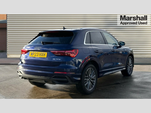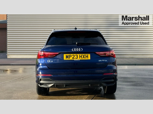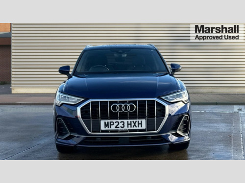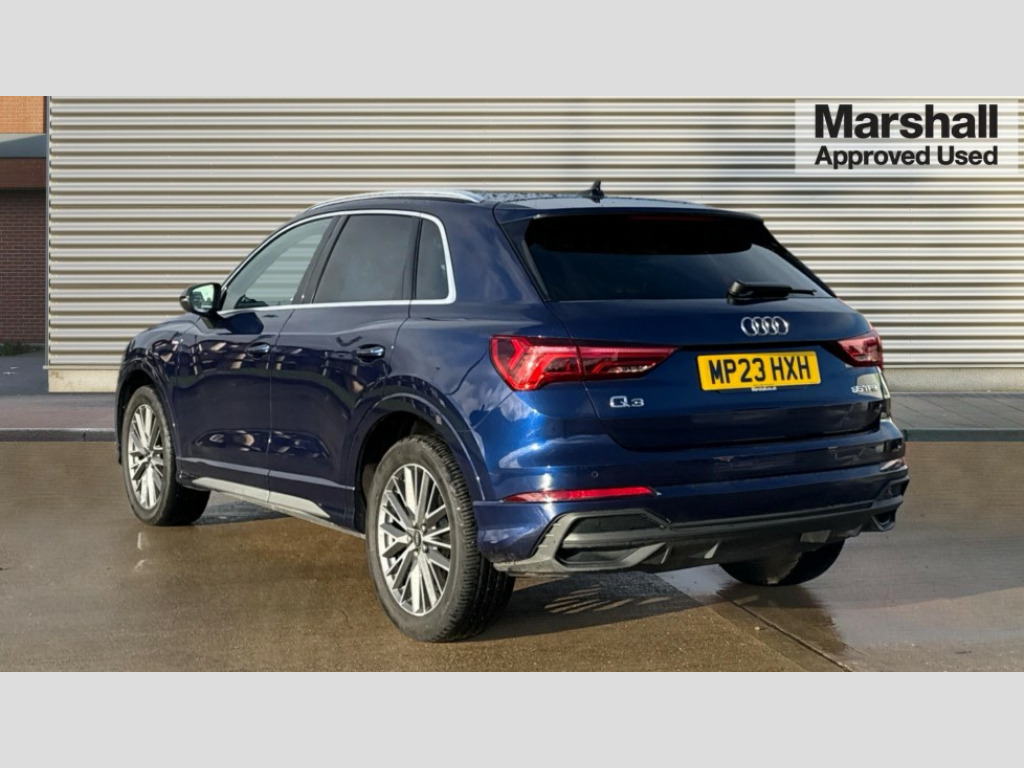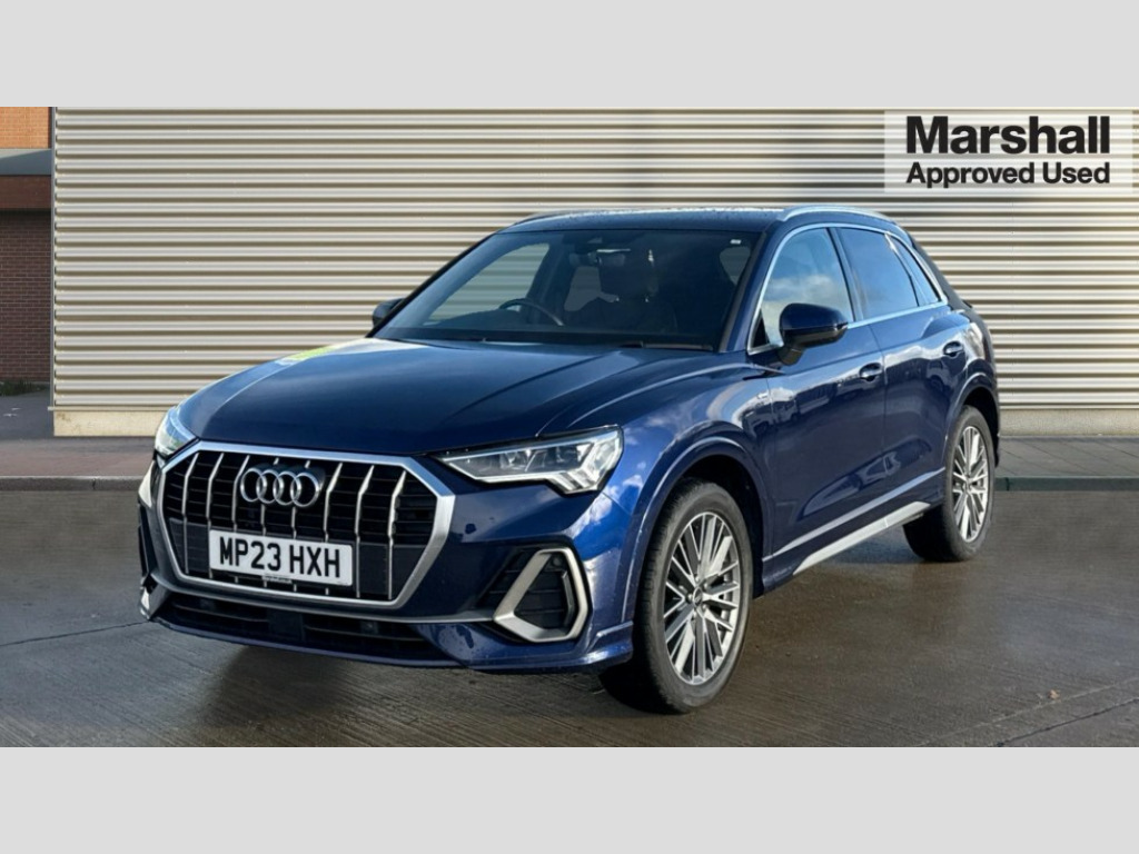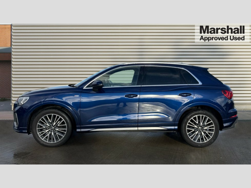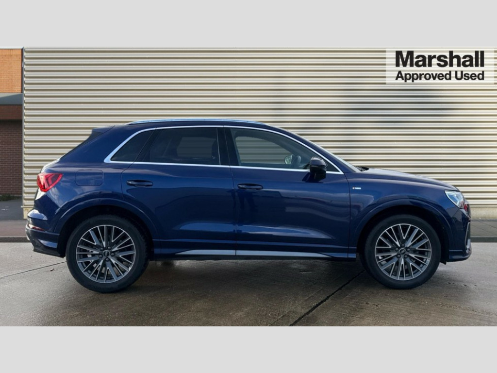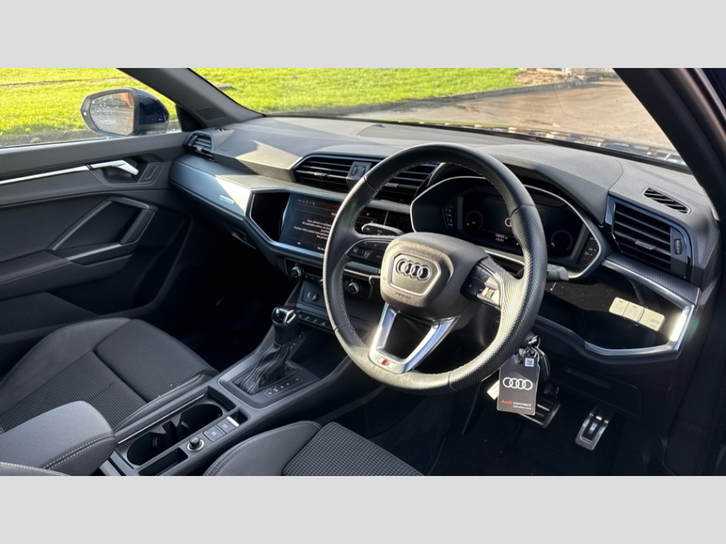 Audi Q3 35 TFSI S Line 5dr S Tronic Amazon alexa Integration, Audi drive select, Audi lane departure warning, Audi Virtual Cockpit - 10.25" display, Bluetooth interface, Camera based traffic sign recognition, Legal emergency call, MMI Navigation Plus with high resolution 10.1 inch touchscreen colour display, Power operated tailgate, Progressive steering, Service interval indicator, Smartphone interface includes wireless Apple carplay/Android Auto, Start stop system with recuperation, Voice control system with natural language interaction, Sports suspension, 2 USB-C ports with charge and data functions, 6 passive loudspeakers, DAB digital radio module, Acoustic windscreen, Aluminium roof rails, Aluminium window trim, Anthracite black radiator grille, Auto dimming frameless rear view mirror, Body colour front spoiler blade, Body coloured bumpers, Electrically folding, adjustable and heated door mirrors with integrated LED side indicators and kerb view function for passenger side, Front and rear electric windows, Front fog lights, Front side air inlets in matt platinum grey, Grille vertical bars in aluminium silver/Matt, High gloss black finish B and C pillars, LED Dynamic rear indicators, LED headlights with LED daytime running lights, LED rear lights, LED third brake light, Privacy glass dark tinted rear and rear-side windows (from B-pillar backwards), Rain and light sensors, Rear diffuser grille in grained matt black, Rear diffuser strip in matt anthracite black, Rear side wing doors, Rear wiper, S line badges on front wings, S Line front and rear bumpers, Side skirt insert in matt Platinium grey, Variable front intermittent wipers, 12V socket in rear centre console, 3 seat bench in 2nd row, 3 spoke leather multifunction steering wheel features S badging and grips in perforated leather with contrast stitching, 40:20:40 folding with manual adjustment for 60:40 forwards/backwards position and backrest angle, Adjustable rear seat bench/backrest with centre armrest and cupholder, Black cloth headlining, Dual zone electronic climate control, Front and rear black floor mats with contrast stitching in rock grey, Front and rear headrests, Front and rear roof module including reading lights, Front centre armrest, Glove compartment lighting, Height and reach adjustable steering wheel, Illuminated door sill trims with S logo, ISOFIX child seat mounting for front passenger with airbag deactivation and outer rear seat including top tether attachment point for outer rear seats, Luggage compartment light, Manual front seats with height adjustment, Perforated leather gearknob, Single front passenger seat, Stainless steel luggage compartment sill finisher, Stainless steel pedals, Ambient lighting pack - Q3, Non smoking pack - Q3, 3x3 point rear seatbelts, 6 airbags - Driver, front passenger, curtain and side windows, Audi pre-sense front with pedestrain and cyclist recognition, Electrically operated child locks on rear doors, Electromechanical parking brake, Electronic stabilisation control including ABS, ASR and EDL, Front seatbelt reminder, Hill descent control, Hill hold assist, Pre sense basic, Seatbelt monitoring, Tyre pressure warning, Warning triangle and first aid kit, Anti theft alarm, Anti theft wheel bolts, Immobiliser, Remote central locking, Aluminium look interior elements, Dark matt brushed aluminium inlay, Detail dashboard around MMI touch colour display in glass look, black with surround in aluminium look, Leatherette door armrest