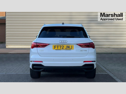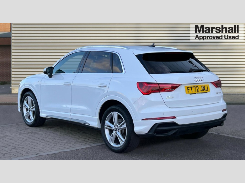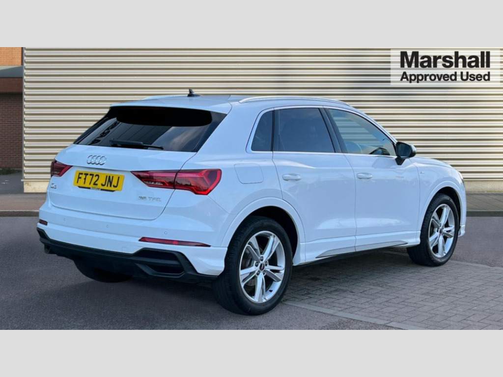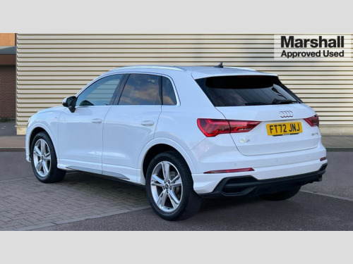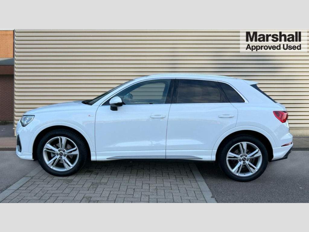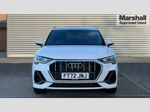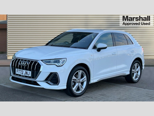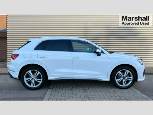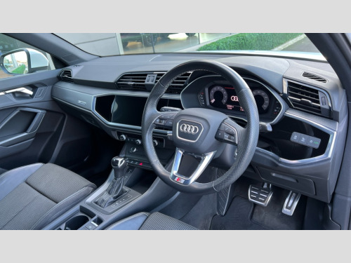 Audi Q3 35 TFSI S Line 5dr S Tronic Amazon alexa Integration, Audi drive select, Audi lane departure warning, Audi Virtual Cockpit - 10.25" display, Bluetooth interface, Camera based traffic sign recognition, Legal emergency call, MMI Navigation Plus with high resolution 10.1 inch touchscreen colour display, Power operated tailgate, Progressive steering, Service interval indicator, Smartphone interface includes wireless Apple carplay/Android Auto, Start stop system with recuperation, Voice control system with natural language interaction, Sports suspension, 2 USB-C ports with charge and data functions, 6 passive loudspeakers, DAB digital radio module, Acoustic windscreen, Aluminium roof rails, Aluminium window trim, Auto dimming frameless rear view mirror, Body colour front spoiler blade, Body coloured bumpers, Electrically folding, adjustable and heated door mirrors with integrated LED side indicators and kerb view function for passenger side, Front and rear electric windows, Front fog lights, Front side air inlets in matt platinum grey, Grille vertical bars in aluminium silver/Matt, High gloss black finish B and C pillars, LED Dynamic rear indicators, LED headlights with LED daytime running lights, LED rear lights, LED third brake light, Privacy glass dark tinted rear and rear-side windows (from B-pillar backwards), Rain and light sensors, Rear diffuser grille in grained matt black, Rear diffuser strip in matt titanium black, Rear side wing doors, Rear wiper, S line badges on front wings, S Line front and rear bumpers, Side skirt insert in matt Platinium grey, Titanium black radiator grille, Variable front intermittent wipers, 12V socket in rear centre console, 3 seat bench in 2nd row, 40:20:40 folding with manual adjustment for 60:40 forwards/backwards position and backrest angle, Adjustable rear seat bench/backrest with centre armrest and cupholder, Black cloth headlining, Dual zone electronic climate control, Front and rear black floor mats with contrast stitching in rock grey, Front and rear headrests, Front and rear roof module including reading lights, Front centre armrest, Glove compartment lighting, Height and reach adjustable steering wheel, Illuminated door sill trims with S logo, ISOFIX child seat mounting for front passenger with airbag deactivation and outer rear seat including top tether attachment point for outer rear seats, Luggage compartment light, Manual front seats with height adjustment, Perforated leather gearknob, Single front passenger seat, Stainless steel luggage compartment sill finisher, Stainless steel pedals, Ambient lighting pack - Q3, Non smoking pack - Q3, 3x3 point rear seatbelts, 6 airbags - Driver, front passenger, curtain and side windows, Audi pre-sense front with pedestrain and cyclist recognition, Electrically operated child locks on rear doors, Electromechanical parking brake, Electronic stabilisation control including ABS, ASR and EDL, Front seatbelt reminder, Hill descent control, Hill hold assist, Pre sense basic, Seatbelt monitoring, Tyre pressure warning, Warning triangle and first aid kit, Anti theft alarm, Anti theft wheel bolts, Immobiliser, Remote central locking, Dark matt brushed aluminium inlay, Detail dashboard around MMI touch colour display in glass look, black with surround in aluminium look, Leatherette door armrest
