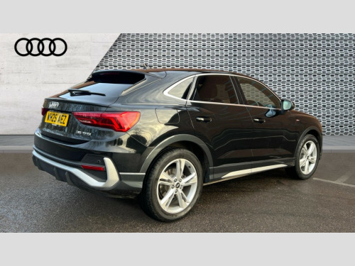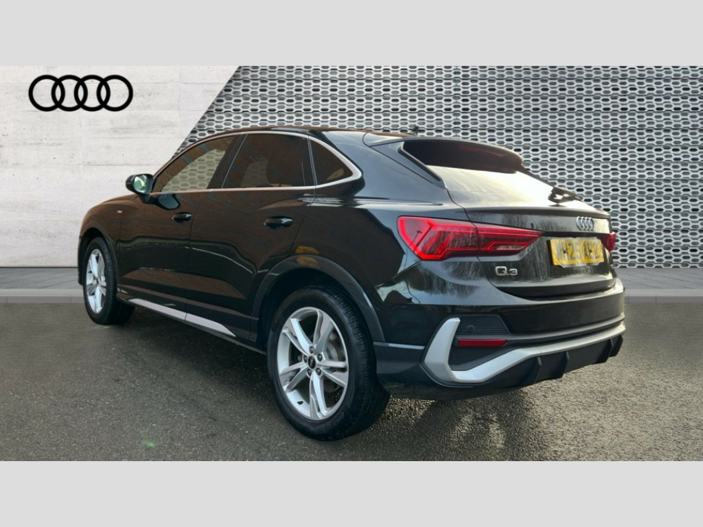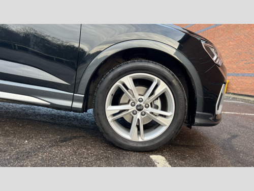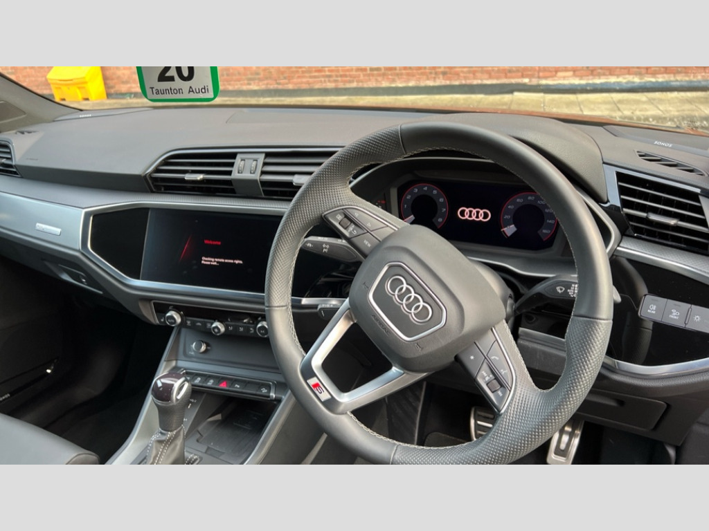 Audi Q3 35 TFSI S Line 5dr S Tronic [Leather] Audi connect safety and service, Audi drive select, Audi lane departure warning, Audi Virtual Cockpit - 10.25" display, Bluetooth interface, Camera based traffic sign recognition, Distraction and Fatigue warning, Legal emergency call, MMI Navigation Plus with high resolution 10.1 inch touchscreen colour display, Power operated tailgate, Progressive steering, Service interval indicator, Smartphone interface includes wireless Apple carplay/Android Auto, Start stop system with recuperation, Voice control system with natural language interaction, Sports suspension, 2 USB-C ports with charge and data functions, 6 passive loudspeakers, DAB digital radio module, Acoustic windscreen, Aluminium window trim, Auto dimming door mirrors, Auto dimming frameless rear view mirror, Electrically folding, adjustable and heated door mirrors with integrated LED side indicators and kerb view function for passenger side, Front and rear electric windows, Front fog lights, Front side air inlets in matt platinum grey, Front underbody protection in manhattan grey paint finish, Grille surround in aluminium silver matt, High gloss black finish B and C pillars, Honeycomb design radiator grille in matt anthracite black, LED Dynamic rear indicators, LED headlights with LED daytime running lights, LED rear lights, LED third brake light, Privacy glass dark tinted rear and rear-side windows (from B-pillar backwards), Rain and light sensors, Rear diffuser grille in grained matt black, Rear diffuser strip in matt anthracite black, Rear side wing doors, Rear underbody protection in matt black, Rear wiper, S line badges on front wings, S Line front and rear bumpers and side skirts, Side skirt insert in matt Platinium grey, Variable front intermittent wipers, 12V socket in rear centre console, 3 seat bench in 2nd row, 3 spoke leather multifunction steering wheel features S badging and grips in perforated leather with contrast stitching, 40:20:40 folding with manual adjustment for 60:40 forwards/backwards position and backrest angle, Adjustable rear seat bench/backrest with centre armrest and cupholder, Black carpet mats, Black cloth headlining, Dual zone electronic climate control, Electric lumbar support, Front and rear black floor mats with contrast stitching in rock grey, Front and rear headrests, Front centre armrest, Height and reach adjustable steering wheel, Horizontal trim strip in matt platinum grey, Illuminated door sill trims with S logo, ISOFIX child seat mounting for front passenger with airbag deactivation and outer rear seat including top tether attachment point for outer rear seats, Luggage compartment sill protection in stainless steel, Manual front seats with height adjustment, Perforated leather gearknob, Single front passenger seat, Stainless steel pedals, Twin leather upholstery with front sport seats + S embossing, Non smoking pack - Q3, 3x3 point rear seatbelts, 6 airbags - Driver, front passenger, curtain and side windows, Audi pre-sense front with pedestrain and cyclist recognition, Electrically operated child locks on rear doors, Electromechanical parking brake, Electronic stabilisation control including ABS, ASR and EDL, Front seatbelt reminder, Hill descent control, Hill hold assist, Pre sense basic, Seatbelt monitoring, Tyre pressure warning, Warning triangle and first aid kit, Anti theft wheel bolts, Immobiliser, Remote central locking, Thatcham approved category 1 anti theft alarm, Aluminium look interior elements, Dark matt brushed aluminium inlay, Detail dashboard around MMI touch colour display in glass look, black with surround in aluminium look, Leatherette door armrest