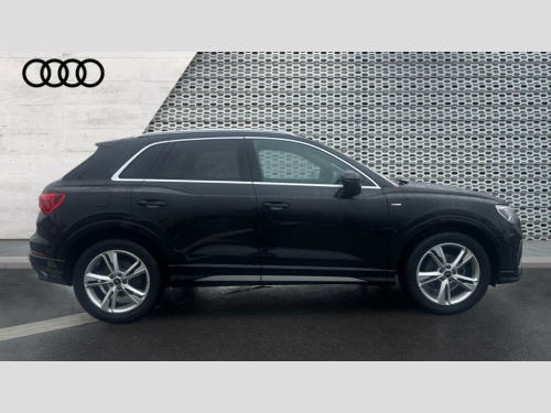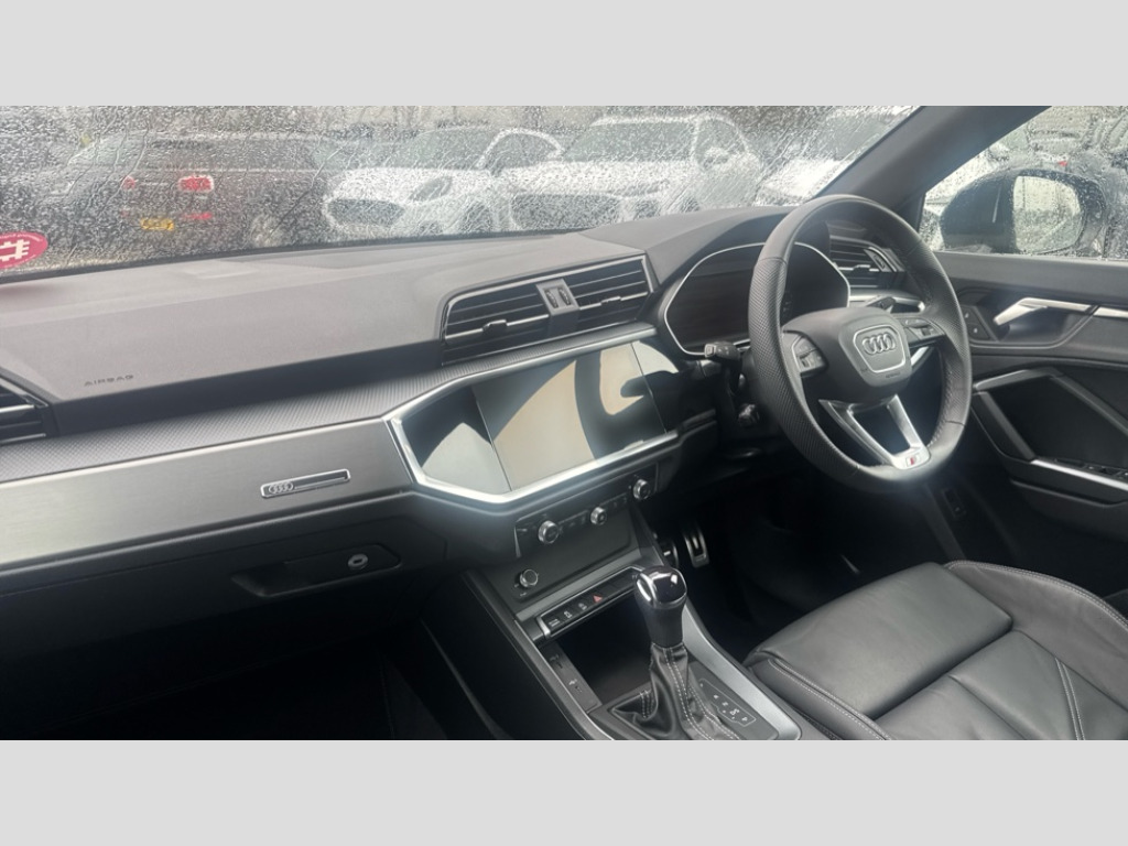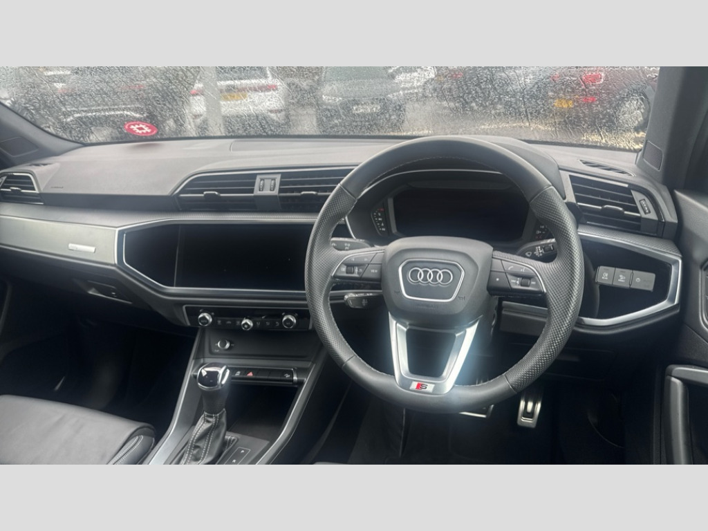 Audi Q3 35 TFSI S Line 5dr S Tronic [Leather] Amazon alexa Integration, Audi connect safety and service, Audi drive select, Audi lane departure warning, Audi Virtual Cockpit - 10.25" display, Bluetooth interface, Camera based traffic sign recognition, Distraction and Fatigue warning, Legal emergency call, MMI Navigation Plus with high resolution 10.1 inch touchscreen colour display, Power operated tailgate, Progressive steering, Service interval indicator, Smartphone interface includes wireless Apple carplay/Android Auto, Start stop system with recuperation, Voice control system with natural language interaction, Sports suspension, 2 USB-C ports with charge and data functions, 6 passive loudspeakers, DAB digital radio module, Acoustic windscreen, Aluminium roof rails, Aluminium window trim, Anthracite black radiator grille, Auto dimming door mirrors, Auto dimming frameless rear view mirror, Body colour front spoiler blade, Electrically folding, adjustable and heated door mirrors with integrated LED side indicators and kerb view function for passenger side, Front and rear electric windows, Front fog lights, Front side air inlets in matt platinum grey, Grille vertical bars in aluminium silver/Matt, High gloss black finish B and C pillars, LED Dynamic rear indicators, LED headlights with LED daytime running lights, LED rear lights, LED third brake light, Privacy glass dark tinted rear and rear-side windows (from B-pillar backwards), Rain and light sensors, Rear diffuser grille in grained matt black, Rear diffuser strip in matt anthracite black, Rear side wing doors, Rear wiper, S line badges on front wings, S line front and rear bumpers and side skirts in contrasting Manhattan grey paint finish, Side skirt insert in matt Platinium grey, Variable front intermittent wipers, 12V socket in rear centre console, 3 seat bench in 2nd row, 3 spoke leather multifunction steering wheel features S badging and grips in perforated leather with contrast stitching, 40:20:40 folding with manual adjustment for 60:40 forwards/backwards position and backrest angle, Adjustable rear seat bench/backrest with centre armrest and cupholder, Black cloth headlining, Dual zone electronic climate control, Electric lumbar support, Front and rear black floor mats with contrast stitching in rock grey, Front and rear headrests, Front centre armrest, Height and reach adjustable steering wheel, Illuminated door sill trims with S logo, ISOFIX child seat mounting for front passenger with airbag deactivation and outer rear seat including top tether attachment point for outer rear seats, Manual front seats with height adjustment, Perforated leather gearknob, Single front passenger seat, Stainless steel luggage compartment sill finisher, Stainless steel pedals, Twin leather upholstery with front sport seats + S embossing, Non smoking pack - Q3, 3x3 point rear seatbelts, 6 airbags - Driver, front passenger, curtain and side windows, Audi pre-sense front with pedestrain and cyclist recognition, Electrically operated child locks on rear doors, Electromechanical parking brake, Electronic stabilisation control including ABS, ASR and EDL, Front seatbelt reminder, Hill descent control, Hill hold assist, Pre sense basic, Seatbelt monitoring, Tyre pressure warning, Warning triangle and first aid kit, Anti theft wheel bolts, Immobiliser, Remote central locking, Thatcham approved category 1 anti theft alarm, Aluminium look interior elements, Dark matt brushed aluminium inlay, Detail dashboard around MMI touch colour display in glass look, black with surround in aluminium look, Leatherette door armrest