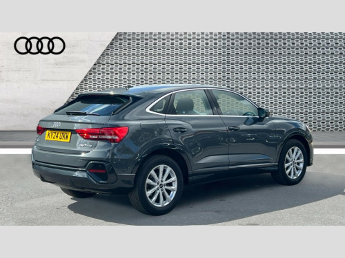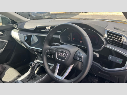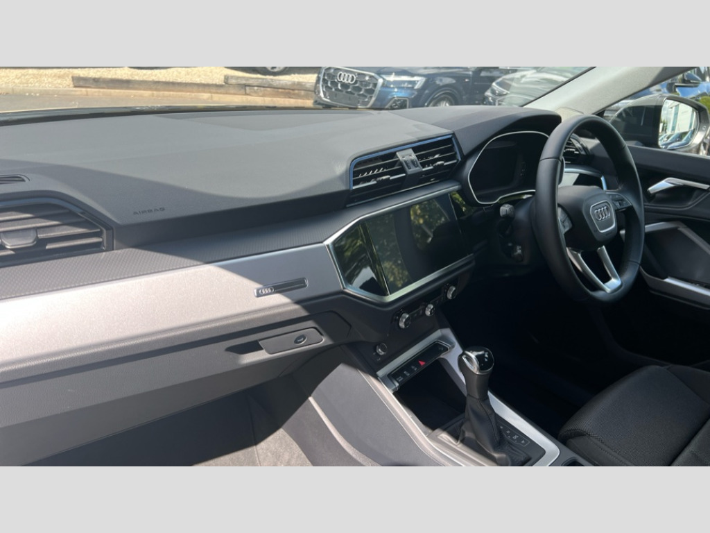 Audi Q3 35 TFSI Sport 5dr S Tronic Audi connect safety and service, Audi drive select, Audi lane departure warning, Audi Virtual Cockpit - 10.25" display, Bluetooth interface, Camera based traffic sign recognition, Legal emergency call, MMI Navigation Plus with high resolution 10.1 inch touchscreen colour display, Power operated tailgate, Progressive steering, Service interval indicator, Smartphone interface includes wireless Apple carplay/Android Auto, Start stop system with recuperation, Voice control system with natural language interaction, Sports suspension, 2 USB-C ports with charge and data functions, 6 passive loudspeakers, DAB digital radio module, Acoustic windscreen, Aluminium window trim, Auto dimming door mirrors, Auto dimming frameless rear view mirror, Bumpers and underbody protection in contrasting manhattan grey paint finish, Diffuser grille in grained matt black, Diffuser trim in manhattan grey metallic, Door sill trims with illuminated aluminium inlay, Electrically folding, adjustable and heated door mirrors with integrated LED side indicators and kerb view function for passenger side, Front and rear electric windows, Front fog lights, Front side air inlets in Manhattan grey metallic, Grille surround in aluminium silver matt, High gloss black finish B and C pillars, Honeycomb design radiator grille in matt anthracite black, LED headlights with LED daytime running lights, LED third brake light, Rain and light sensors, Rear side wing doors, Rear wiper, Variable front intermittent wipers, 12V socket in rear centre console, 3 seat bench in 2nd row, 3 spoke multi-function leather steering wheel, 40:20:40 folding with manual adjustment for 60:40 forwards/backwards position and backrest angle, Dual zone electronic climate control, Electric lumbar support, Front and rear floor mats, Front and rear headrests, Front centre armrest, Height and reach adjustable steering wheel, ISOFIX child seat mounting for front passenger with airbag deactivation and outer rear seat including top tether attachment point for outer rear seats, Luggage compartment sill protection in stainless steel, Lunar silver cloth headlining, Manual front seats with height adjustment, Single front passenger seat, Non smoking pack - Q3, 3x3 point rear seatbelts, 6 airbags - Driver, front passenger, curtain and side windows, Audi pre-sense front with pedestrain and cyclist recognition, Electrically operated child locks on rear doors, Electromechanical parking brake, Electronic stabilisation control including ABS, ASR and EDL, Front seatbelt reminder, Hill descent control, Hill hold assist, Pre sense basic, Seatbelt monitoring, Tyre pressure warning, Warning triangle and first aid kit, Anti theft alarm, Anti theft wheel bolts, Immobiliser, Remote central locking, Aluminium look interior elements, Detail dashboard around MMI touch colour display in glass look, black with surround in aluminium look, Micrometallic silver inlay