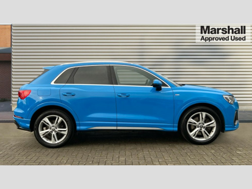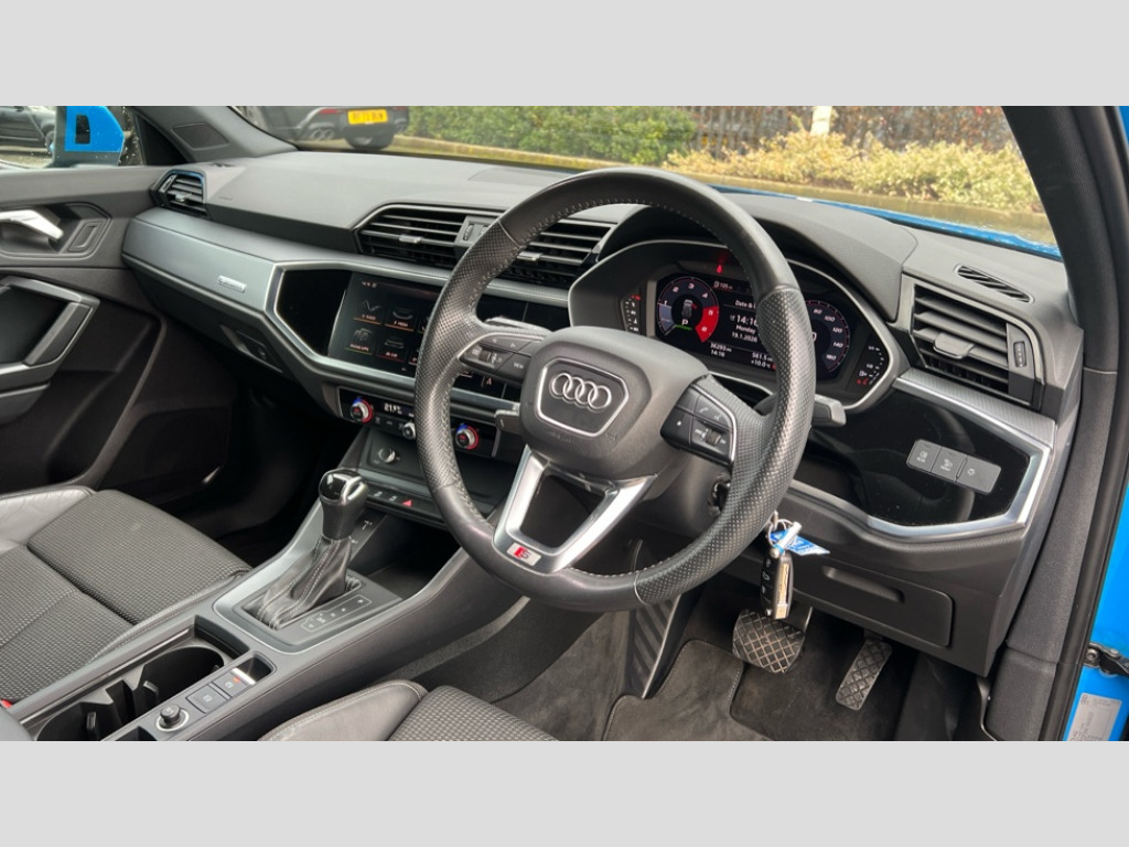 Audi Q3 40 TDI Quattro S Line 5dr S Tronic Audi connect safety and service (e-call), Audi drive select, Audi lane departure warning, Audi side assist, Audi smartphone interface, Bluetooth interface, Camera based traffic sign recognition, MMI navigation plus with MMI touch, Power opening/closing tailgate, Progressive steering, Rear parking sensors, Service interval indicator, Stop/start system, Voice control system, Diesel particulate filter, Sports suspension, 1 x USB type C and 1 USB type A charging points, 6 speakers, DAB digital radio module, Acoustic windscreen, Aluminium roof rails, Aluminium window trim, Auto dimming rear view mirror, Body coloured bumpers, Diffuser in matt Platinum grey, Electrically adjustable and heated door mirrors with integrated LED side indicators, Front and rear electric windows, Front fog lights, Front side air inlets in matt platinum grey, Front spoiler blade in matt platinum grey, Grille vertical bars in aluminium silver/Matt, High gloss black finish B and C pillars, LED headlights with LED daytime running lights and dynamic rear indicator, LED rear lights, Privacy glass, Rain and light sensors, Rear diffuser strip in matt titanium black, S Line badge on wings, S Line front and rear bumpers, Side skirt insert in matt Platinium grey, Titanium black radiator grille, 12V socket in rear centre console, 40:20:40 split folding rear bench seat, Adjustable rear seat bench/backrest with centre armrest and cupholder, Aluminium door sill trims, Black cloth headlining, Dual zone climate control, Front and rear black floor mats with contrast stitching in rock grey, Front and rear headrests, Front centre armrest with storage compartment and angle adjustment, Illuminated door sill trims with S logo, ISOFIX child seat mounting and Top Tether with front passenger airbag deactivation, Manual front seats with height adjustment, Perforated leather gearknob, Stainless steel luggage compartment sill finisher, Stainless steel pedals, Non smoking pack - Q3, 3x3 point rear seatbelts, 6 airbags - Driver, front passenger, curtain and side windows, Audi pre-sense front with pedestrain and cyclist recognition, Electrically operated child locks on rear doors, Electromechanical parking brake, Electronic stabilisation control including ABS, ASR and EDL, Hill hold assist, Pre sense basic, Seatbelt monitoring, Tyre pressure warning, Warning triangle and first aid kit, Anti theft alarm, Anti theft wheel bolts, Remote central locking, Dark matt brushed aluminium inlay, MMI touch colour display in gloss black with aluminium surround