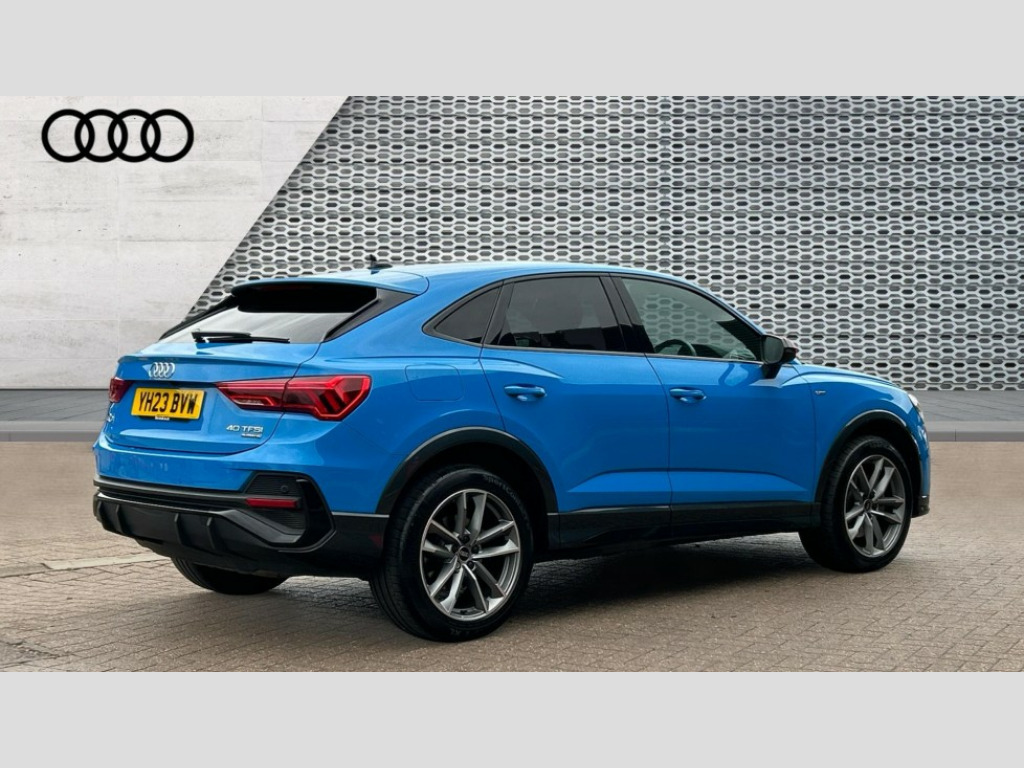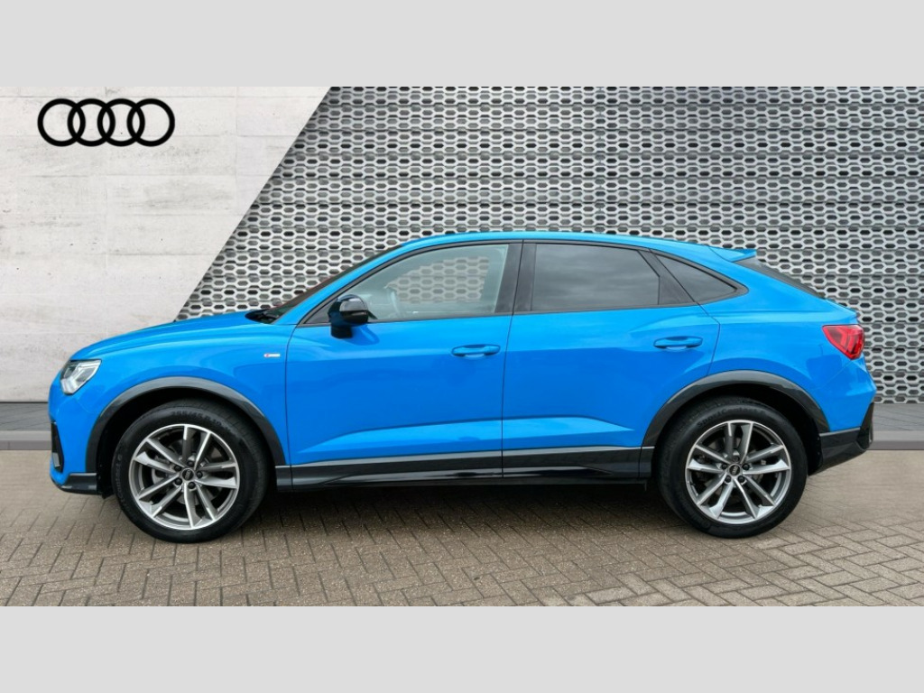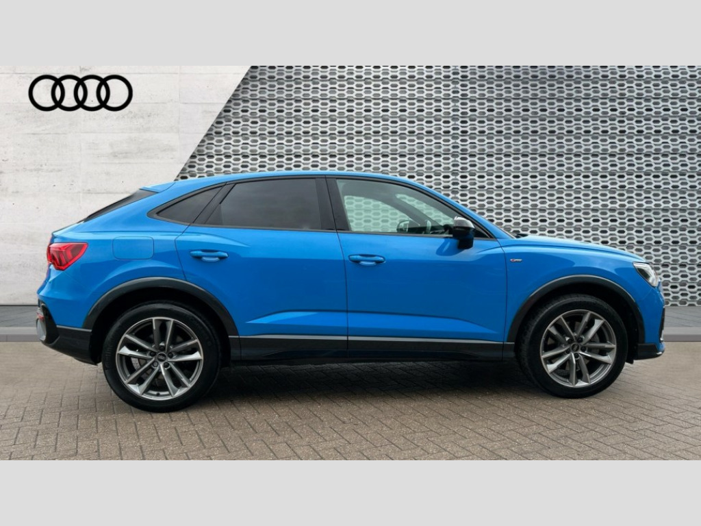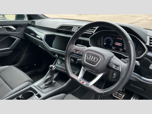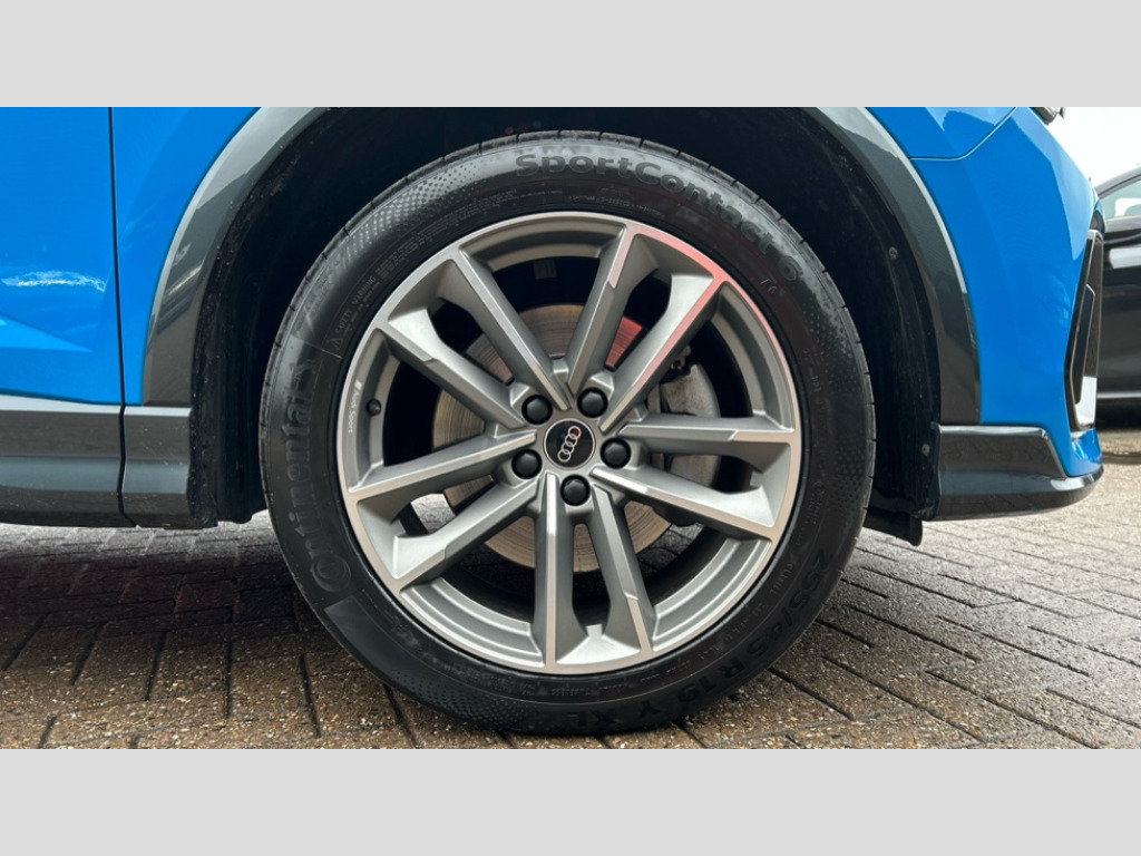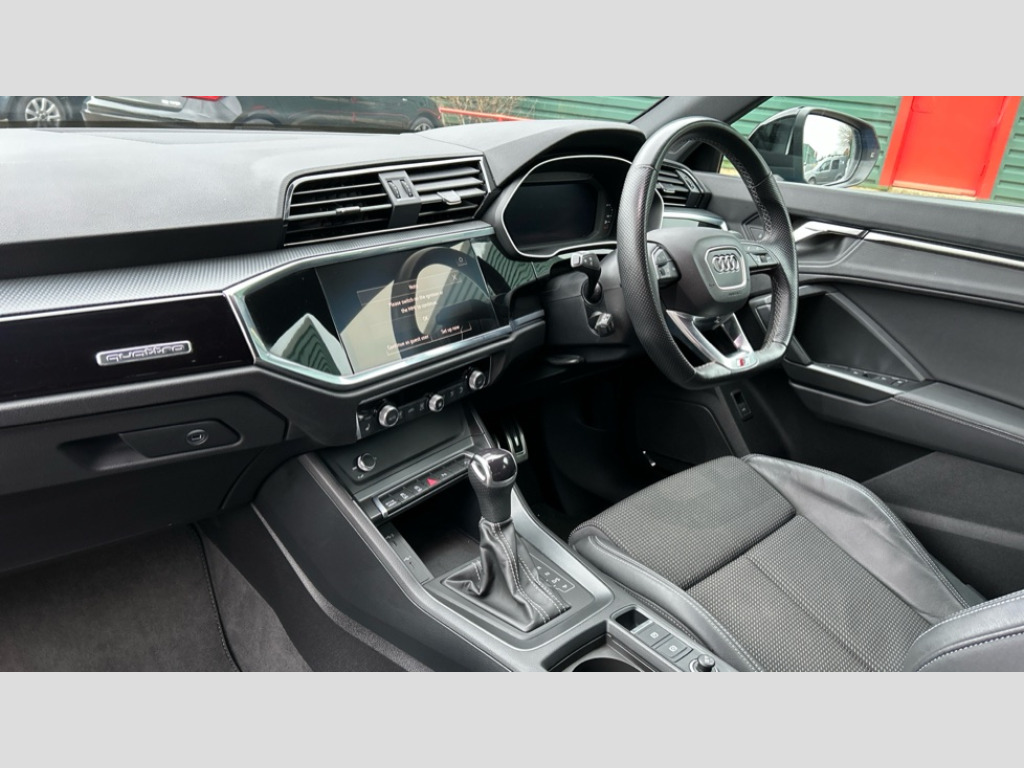 Audi Q3 40 TFSI Quattro Black Edition 5dr S Tronic Audi drive select, Audi lane departure warning, Audi Virtual Cockpit - 10.25" display, Bluetooth interface, Camera based traffic sign recognition, Legal emergency call, MMI Navigation Plus with high resolution 10.1 inch touchscreen colour display, Power operated tailgate, Progressive steering, Service interval indicator, Smartphone interface includes wireless Apple carplay/Android Auto, Start stop system with recuperation, Voice control system with natural language interaction, Sports suspension, 2 USB-C ports with charge and data functions, 6 passive loudspeakers, DAB digital radio module, Acoustic windscreen, Auto dimming frameless rear view mirror, Diffuser grille in grained matt black, Diffuser trim in selenite silver, Electrically folding, adjustable and heated door mirrors with integrated LED side indicators and kerb view function for passenger side, Front and rear electric windows, Front fog lights, Front underbody protection in manhattan grey paint finish, High gloss black finish B and C pillars, LED Dynamic rear indicators, LED headlights with LED daytime running lights, LED rear lights, LED third brake light, Privacy glass dark tinted rear and rear-side windows (from B-pillar backwards), Rain and light sensors, Rear side wing doors, Rear underbody protection in matt black, Rear wiper, Variable front intermittent wipers, 12V socket in rear centre console, 3 seat bench in 2nd row, 40:20:40 folding with manual adjustment for 60:40 forwards/backwards position and backrest angle, Adjustable rear seat bench/backrest with centre armrest and cupholder, Black cloth headlining, Dual zone electronic climate control, Front and rear black floor mats with contrast stitching, Front and rear headrests, Front and rear roof module including reading lights, Front centre armrest, Glove compartment lighting, Height and reach adjustable steering wheel, Illuminated door sill trims with S logo, ISOFIX child seat mounting for front passenger with airbag deactivation and outer rear seat including top tether attachment point for outer rear seats, Luggage compartment light right in white, Luggage compartment sill protection in stainless steel, Manual front seats with height adjustment, Perforated leather gearknob, Single front passenger seat, Stainless steel pedals, Ambient lighting pack - Q3, Black styling pack - Q3, Non smoking pack - Q3, 3x3 point rear seatbelts, 6 airbags - Driver, front passenger, curtain and side windows, Audi pre-sense front with pedestrain and cyclist recognition, Electrically operated child locks on rear doors, Electromechanical parking brake, Electronic stabilisation control including ABS, ASR and EDL, Front seatbelt reminder, Hill descent control, Hill hold assist, Pre sense basic, Seatbelt monitoring, Tyre pressure warning, Warning triangle and first aid kit, Anti theft alarm, Anti theft wheel bolts, Immobiliser, Remote central locking, Aluminium look interior elements, Black dashboard, Detail dashboard around MMI touch colour display in glass look, black with surround in aluminium look, Leatherette door armrest, Piano black inlay, 19" 5 twin arm design diamond cut audi sport alloy wheels in matt grey look