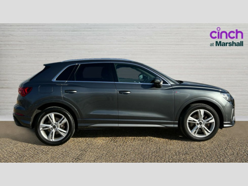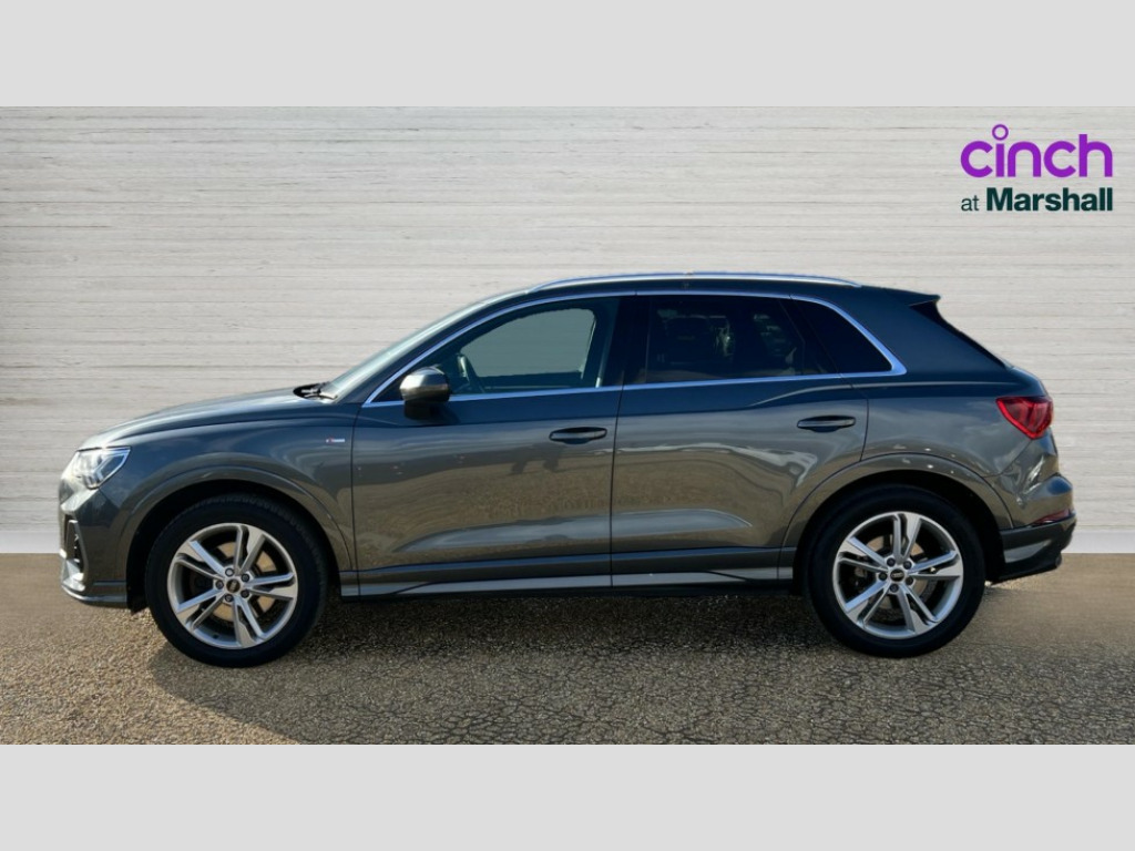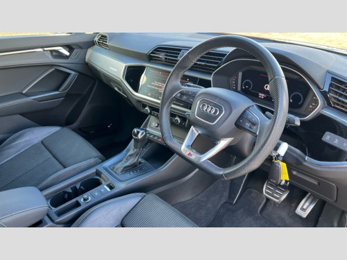 Audi Q3 40 TFSI Quattro S Line 5dr S Tronic Amazon alexa Integration, Audi drive select, Audi lane departure warning, Audi Virtual Cockpit - 10.25" display, Bluetooth interface, Camera based traffic sign recognition, Legal emergency call, MMI Navigation Plus with high resolution 10.1 inch touchscreen colour display, Power operated tailgate, Progressive steering, Service interval indicator, Smartphone interface includes wireless Apple carplay/Android Auto, Start stop system with recuperation, Voice control system with natural language interaction, Sports suspension, 2 USB-C ports with charge and data functions, 6 passive loudspeakers, DAB digital radio module, Acoustic windscreen, Aluminium roof rails, Aluminium window trim, Auto dimming frameless rear view mirror, Body colour front spoiler blade, Body coloured bumpers, Electrically folding, adjustable and heated door mirrors with integrated LED side indicators and kerb view function for passenger side, Front and rear electric windows, Front fog lights, Front side air inlets in matt platinum grey, Grille vertical bars in aluminium silver/Matt, High gloss black finish B and C pillars, LED Dynamic rear indicators, LED headlights with LED daytime running lights, LED rear lights, LED third brake light, Privacy glass dark tinted rear and rear-side windows (from B-pillar backwards), Rain and light sensors, Rear diffuser grille in grained matt black, Rear diffuser strip in matt titanium black, Rear side wing doors, Rear wiper, S line badges on front wings, S Line front and rear bumpers, Side skirt insert in matt Platinium grey, Titanium black radiator grille, Variable front intermittent wipers, 12V socket in rear centre console, 3 seat bench in 2nd row, 40:20:40 folding with manual adjustment for 60:40 forwards/backwards position and backrest angle, Adjustable rear seat bench/backrest with centre armrest and cupholder, Black cloth headlining, Dual zone electronic climate control, Front and rear black floor mats with contrast stitching in rock grey, Front and rear headrests, Front and rear roof module including reading lights, Front centre armrest, Glove compartment lighting, Height and reach adjustable steering wheel, Illuminated door sill trims with S logo, ISOFIX child seat mounting for front passenger with airbag deactivation and outer rear seat including top tether attachment point for outer rear seats, Luggage compartment light, Manual front seats with height adjustment, Perforated leather gearknob, Single front passenger seat, Stainless steel luggage compartment sill finisher, Stainless steel pedals, Ambient lighting pack - Q3, Non smoking pack - Q3, 3x3 point rear seatbelts, 6 airbags - Driver, front passenger, curtain and side windows, Audi pre-sense front with pedestrain and cyclist recognition, Electrically operated child locks on rear doors, Electromechanical parking brake, Electronic stabilisation control including ABS, ASR and EDL, Front seatbelt reminder, Hill descent control, Hill hold assist, Pre sense basic, Seatbelt monitoring, Tyre pressure warning, Warning triangle and first aid kit, Anti theft alarm, Anti theft wheel bolts, Immobiliser, Remote central locking, Dark matt brushed aluminium inlay, Detail dashboard around MMI touch colour display in glass look, black with surround in aluminium look, Leatherette door armrest