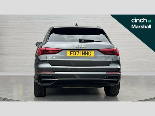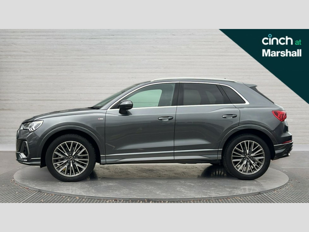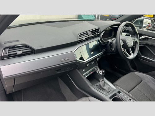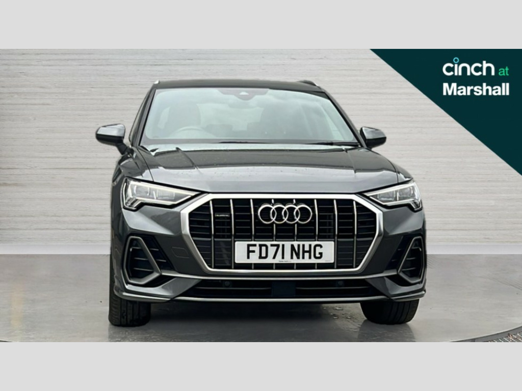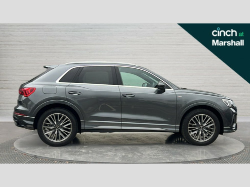 Audi Q3 40 TFSI Quattro S Line 5dr S Tronic Amazon alexa Integration, Audi connect safety and service (e-call), Audi drive select, Audi lane departure warning, Audi Virtual Cockpit - 10.25" display, Bluetooth interface, Camera based traffic sign recognition, MMI Navigation Plus with high resolution 10.1 inch touchscreen colour display, Power operated tailgate, Progressive steering, Service interval indicator, Smartphone interface includes wireless Apple carplay/Android Auto, Start stop system with recuperation, Voice control system with natural language interaction, Sports suspension, 2 USB-C ports with charge and data functions, 6 passive loudspeakers, DAB digital radio module, Acoustic windscreen, Aluminium roof rails, Aluminium window trim, Auto dimming frameless rear view mirror, Body coloured bumpers, Electrically folding, adjustable and heated door mirrors with integrated LED side indicators and kerb view function for passenger side, Front and rear electric windows, Front fog lights, Front side air inlets in matt platinum grey, Front spoiler blade in matt platinum grey, Grille vertical bars in aluminium silver/Matt, High gloss black finish B and C pillars, LED headlights with LED daytime running lights and dynamic rear indicator, LED rear lights, Privacy glass dark tinted rear and rear-side windows (from B-pillar backwards), Rain and light sensors, Rear diffuser strip in matt titanium black, Rear side wing doors, Rear wiper, S line badges on front wings, S Line front and rear bumpers, Side skirt insert in matt Platinium grey, Silver chrome grille surround, Third brake light, Tinted rear windows, Titanium black radiator grille, Variable front intermittent wipers, 12V socket in rear centre console, 3 seat bench in 2nd row, 40:20:40 folding with manual adjustment for 60:40 forwards/backwards position and backrest angle, Adjustable rear seat bench/backrest with centre armrest and cupholder, Black cloth headlining, Dual zone electronic climate control, Front and rear black floor mats with contrast stitching in rock grey, Front and rear headrests, Front and rear roof module including reading lights, Front centre armrest, Glove compartment lighting, Height and reach adjustable steering wheel, Illuminated door sill trims with S logo, ISOFIX child seat mounting for front passenger with airbag deactivation and outer rear seat including top tether attachment point for outer rear seats, Luggage compartment light, Manual front seats with height adjustment, Perforated leather gearknob, Single front passenger seat, Stainless steel luggage compartment sill finisher, Stainless steel pedals, Non smoking pack - Q3, 3x3 point rear seatbelts, 6 airbags - Driver, front passenger, curtain and side windows, Audi pre-sense front with pedestrain and cyclist recognition, Electrically operated child locks on rear doors, Electromechanical parking brake, Electronic stabilisation control including ABS, ASR and EDL, Front seatbelt reminder, Hill descent control, Hill hold assist, Pre sense basic, Seatbelt monitoring, Tyre pressure warning, Warning triangle and first aid kit, Anti theft alarm, Anti theft wheel bolts, Immobiliser, Remote central locking, Dark matt brushed aluminium inlay, Detail dashboard around MMI touch colour display in glass look, black with surround in aluminium look, Leatherette door armrest