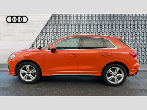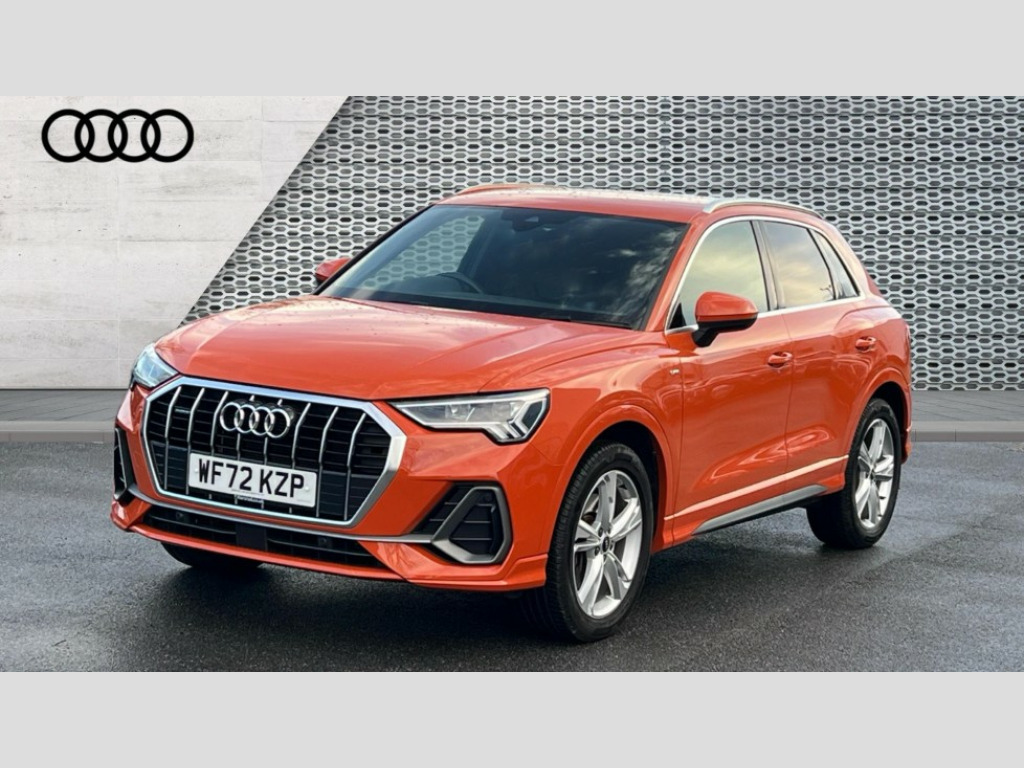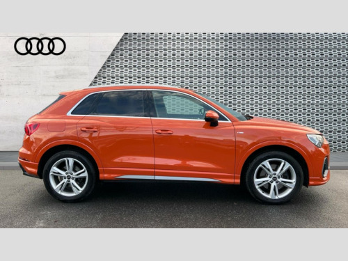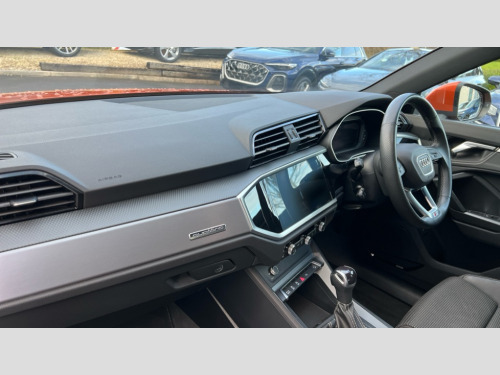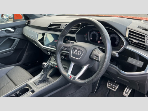 Audi Q3 40 TFSI Quattro S Line 5dr S Tronic Amazon alexa Integration, Audi drive select, Audi lane departure warning, Audi Virtual Cockpit - 10.25" display, Bluetooth interface, Camera based traffic sign recognition, Legal emergency call, MMI Navigation Plus with high resolution 10.1 inch touchscreen colour display, Power operated tailgate, Progressive steering, Service interval indicator, Smartphone interface includes wireless Apple carplay/Android Auto, Start stop system with recuperation, Voice control system with natural language interaction, Sports suspension, 2 USB-C ports with charge and data functions, 6 passive loudspeakers, DAB digital radio module, Acoustic windscreen, Aluminium roof rails, Aluminium window trim, Auto dimming frameless rear view mirror, Body colour front spoiler blade, Body coloured bumpers, Electrically folding, adjustable and heated door mirrors with integrated LED side indicators and kerb view function for passenger side, Front and rear electric windows, Front fog lights, Front side air inlets in matt platinum grey, Grille vertical bars in aluminium silver/Matt, High gloss black finish B and C pillars, LED headlights with LED daytime running lights, LED rear lights, LED third brake light, Privacy glass dark tinted rear and rear-side windows (from B-pillar backwards), Rain and light sensors, Rear diffuser grille in grained matt black, Rear diffuser strip in matt titanium black, Rear side wing doors, Rear wiper, S line badges on front wings, S Line front and rear bumpers, Side skirt insert in matt Platinium grey, Titanium black radiator grille, Variable front intermittent wipers, 12V socket in rear centre console, 3 seat bench in 2nd row, 40:20:40 folding with manual adjustment for 60:40 forwards/backwards position and backrest angle, Adjustable rear seat bench/backrest with centre armrest and cupholder, Black cloth headlining, Dual zone electronic climate control, Front and rear black floor mats with contrast stitching in rock grey, Front and rear headrests, Front and rear roof module including reading lights, Front centre armrest, Glove compartment lighting, Height and reach adjustable steering wheel, Illuminated door sill trims with S logo, ISOFIX child seat mounting for front passenger with airbag deactivation and outer rear seat including top tether attachment point for outer rear seats, Luggage compartment light, Manual front seats with height adjustment, Perforated leather gearknob, Single front passenger seat, Stainless steel luggage compartment sill finisher, Stainless steel pedals, Non smoking pack - Q3, 3x3 point rear seatbelts, 6 airbags - Driver, front passenger, curtain and side windows, Audi pre-sense front with pedestrain and cyclist recognition, Electromechanical parking brake, Electronic stabilisation control including ABS, ASR and EDL, Front seatbelt reminder, Hill descent control, Hill hold assist, Manual child lock in rear doors, Pre sense basic, Seatbelt monitoring, Tyre pressure warning, Warning triangle and first aid kit, Anti theft alarm, Anti theft wheel bolts, Immobiliser, Remote central locking, Dark matt brushed aluminium inlay, Detail dashboard around MMI touch colour display in glass look, black with surround in aluminium look, Leatherette door armrest